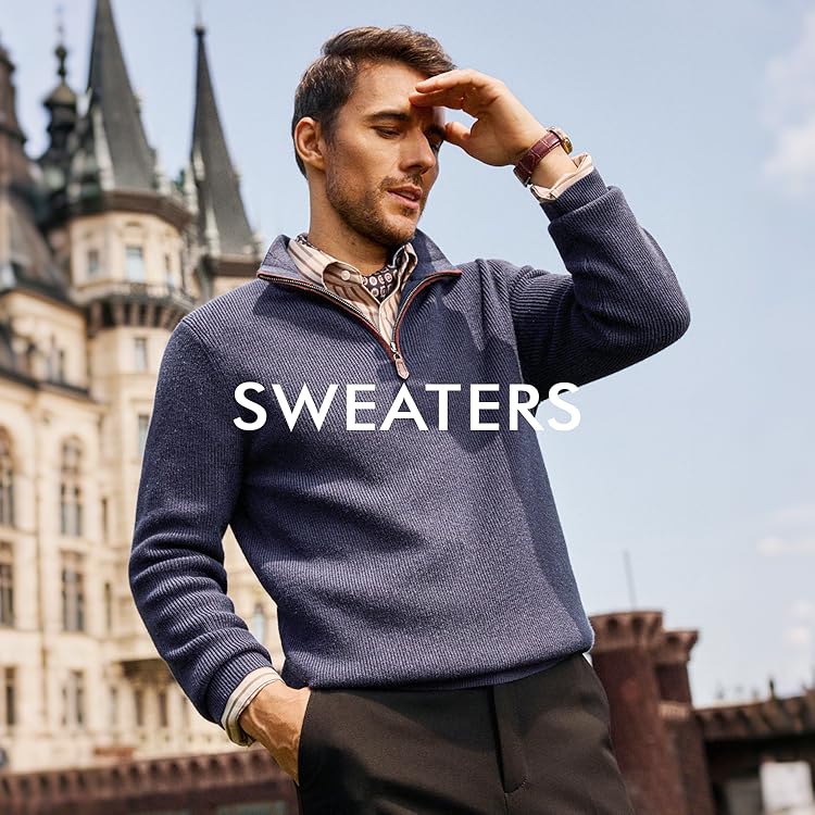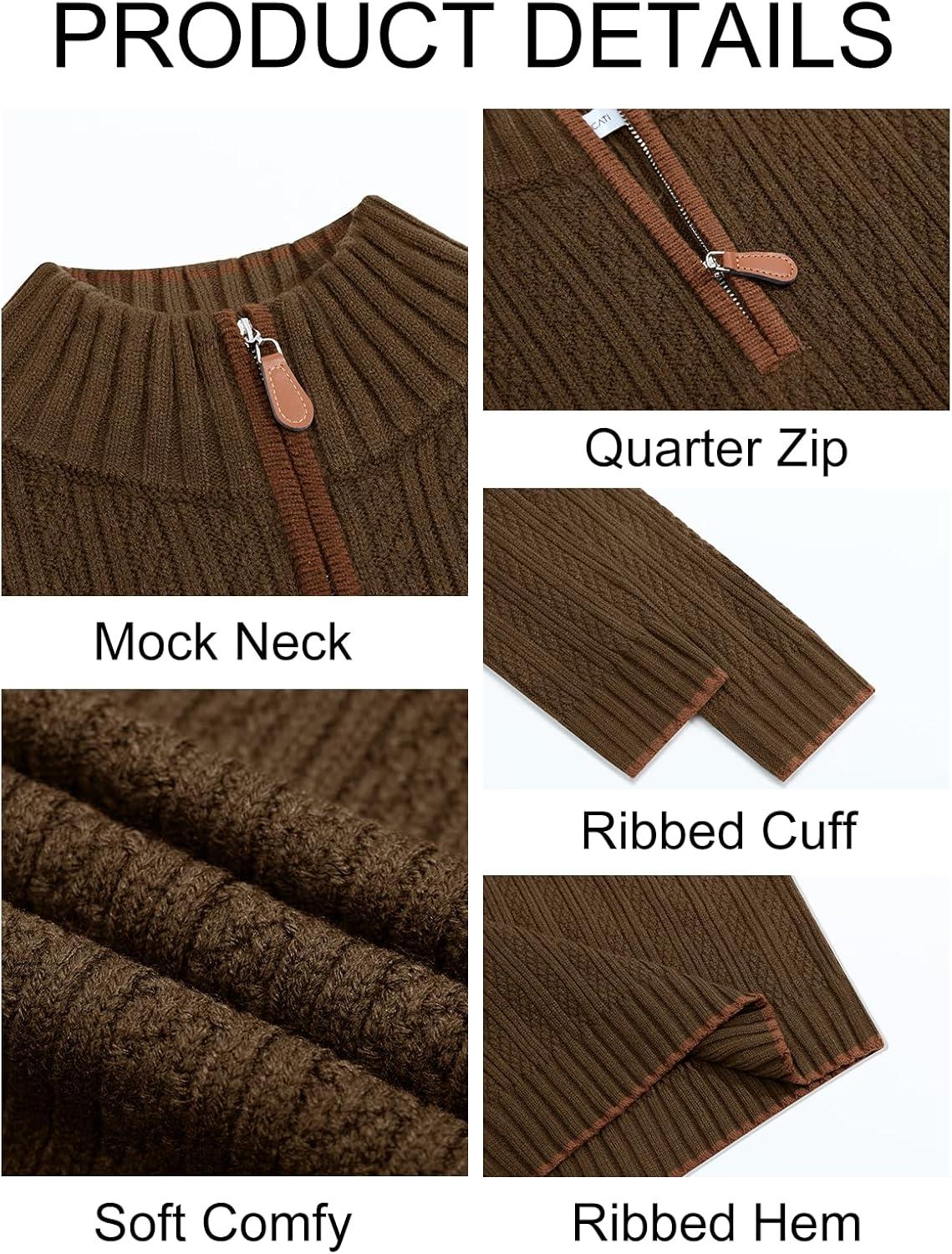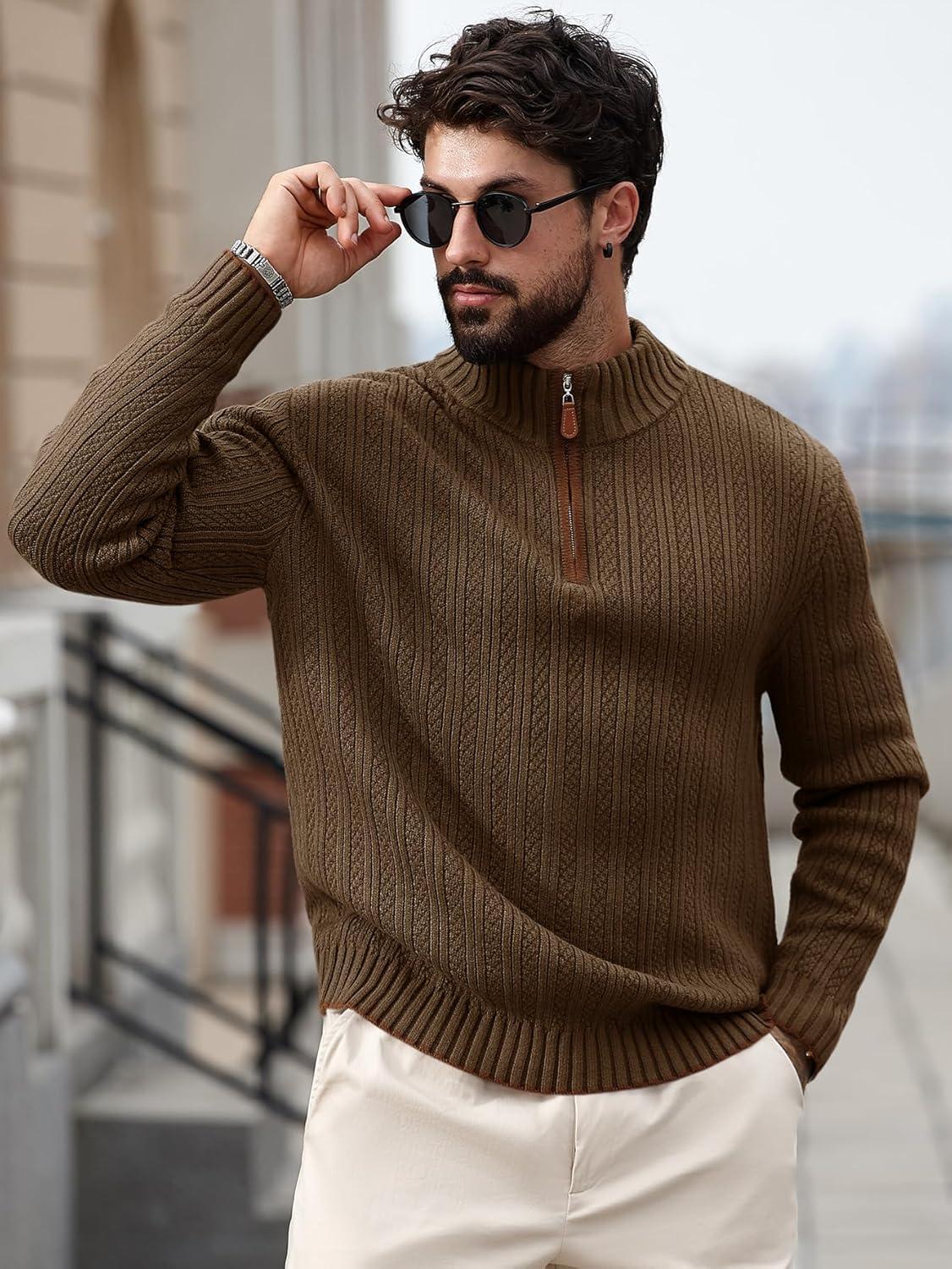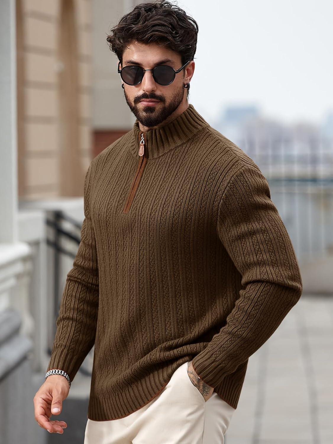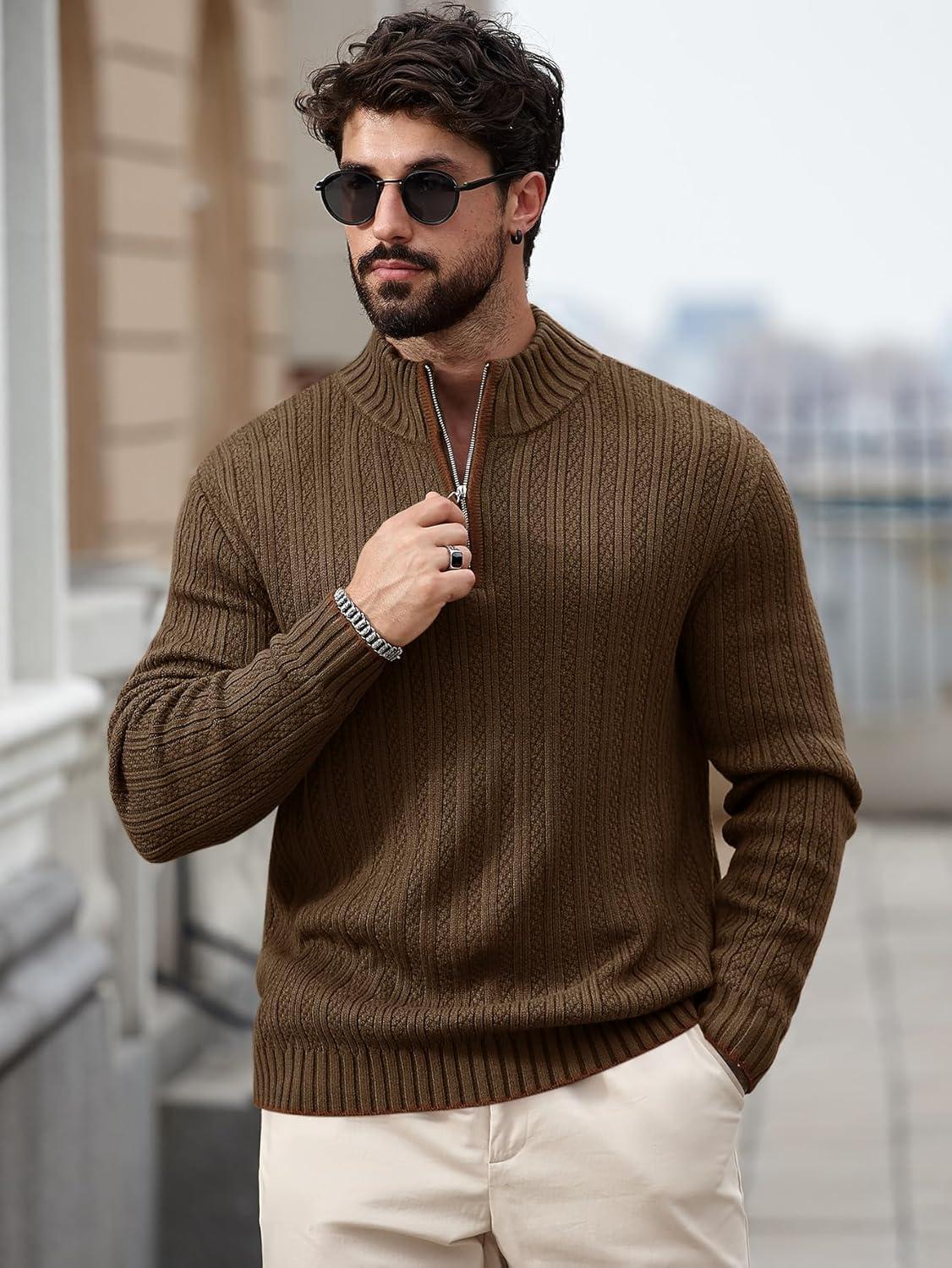 Runcati Mens Quarter-Zip Pullover Sweater Casual Mock Neck Knitted Winter Warm Ribbed Polo Sweaters(Brown)