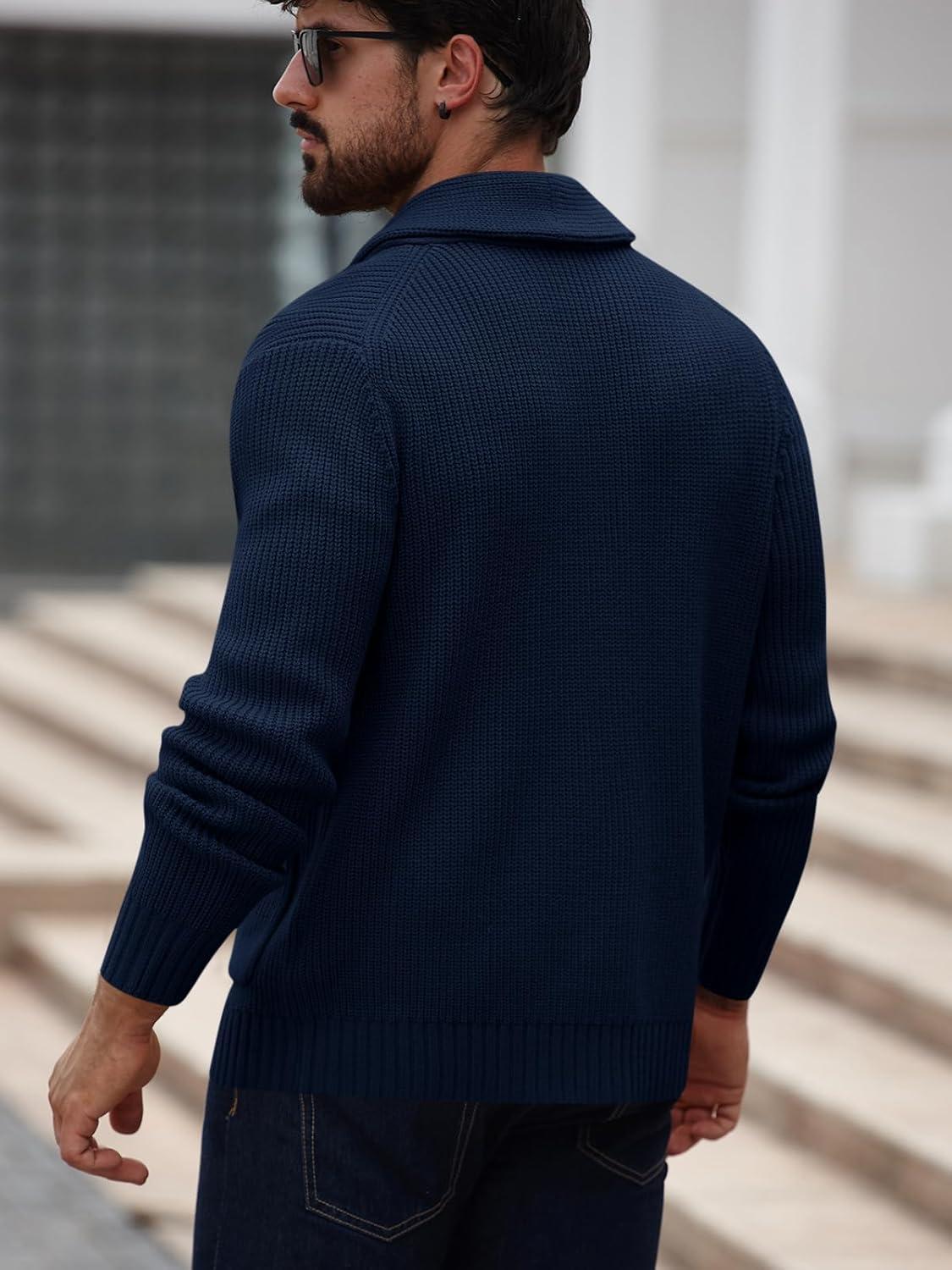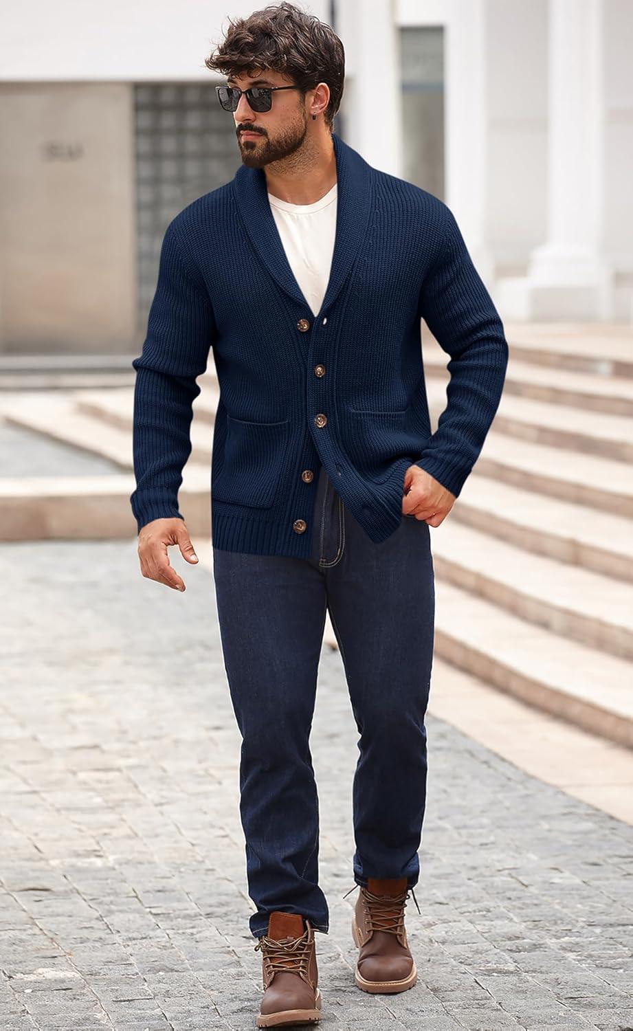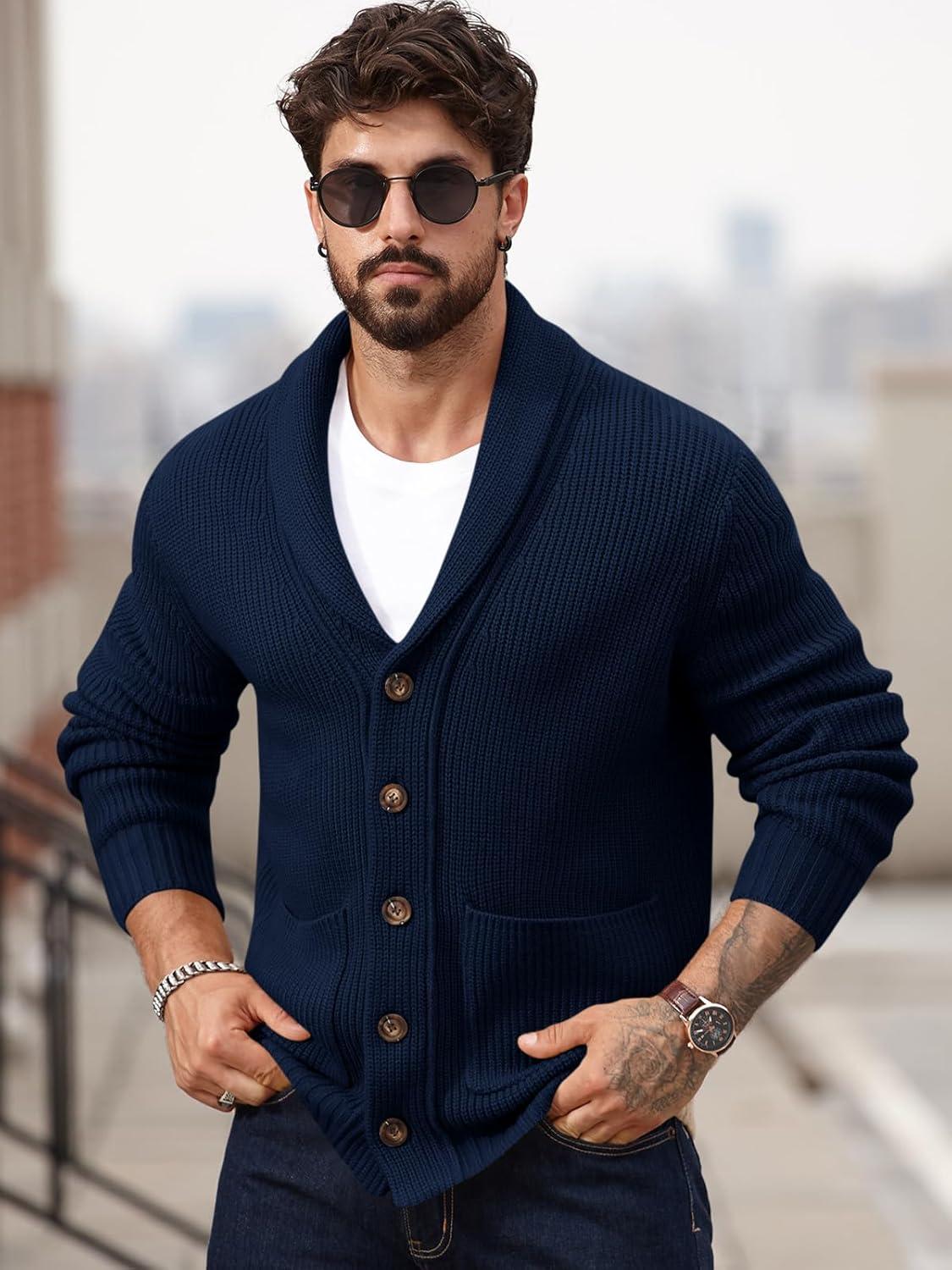 Runcati Mens Shawl Collar Cardigan Sweater Button Down Ribbed Knit Sweaters Chunky Casual Cardigan with Pockets(Navy)