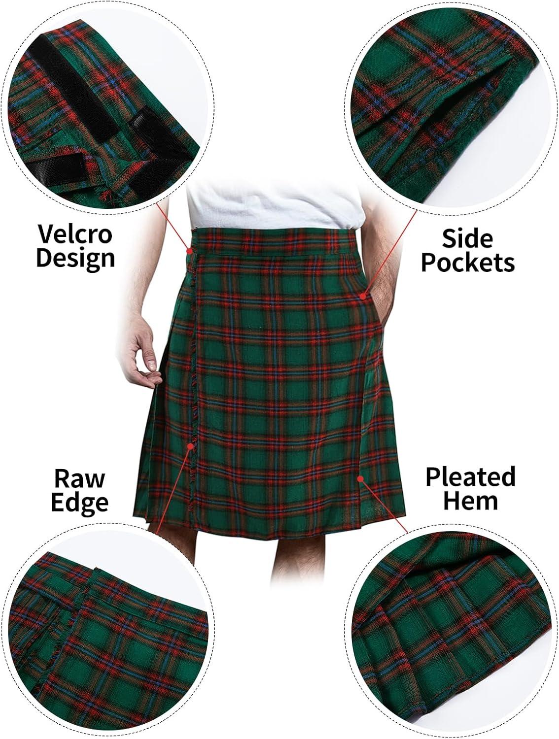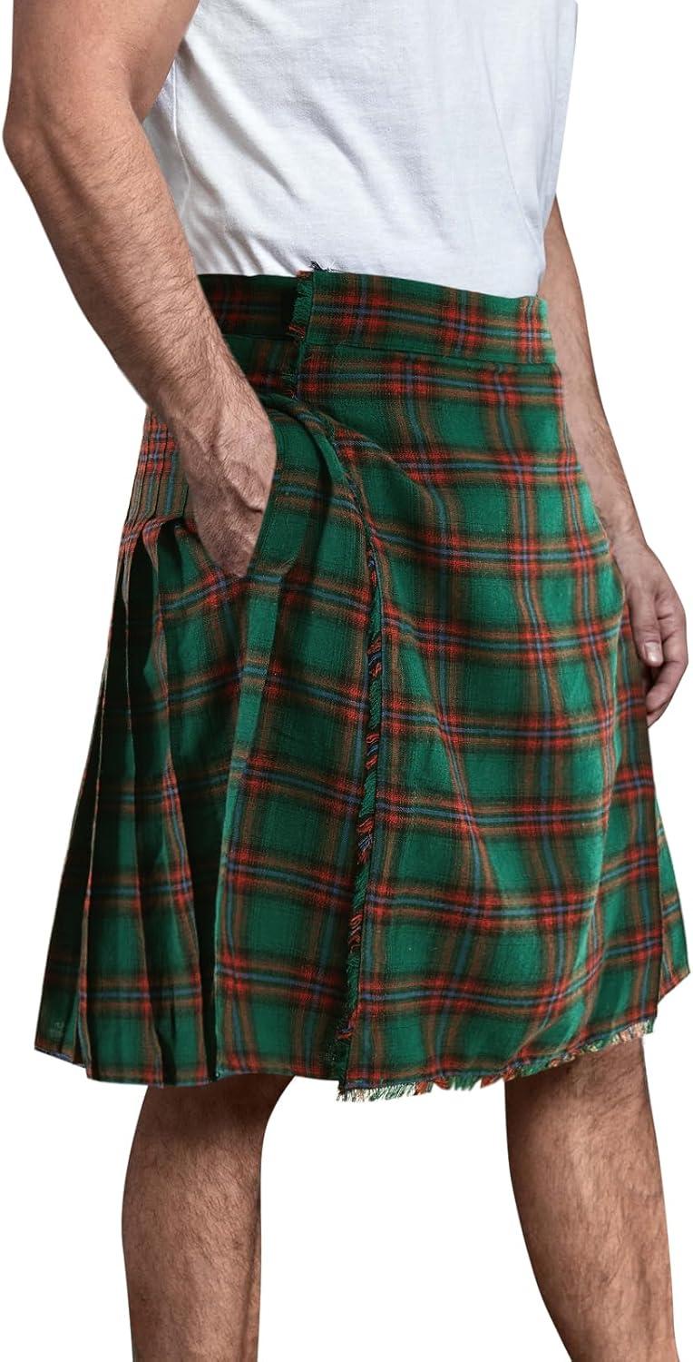 Mens Utility Kilt Pin Scottish Tartan Apparel Black & Irish Hybrid Royal Stewart Pockets Kilts(02 Green)