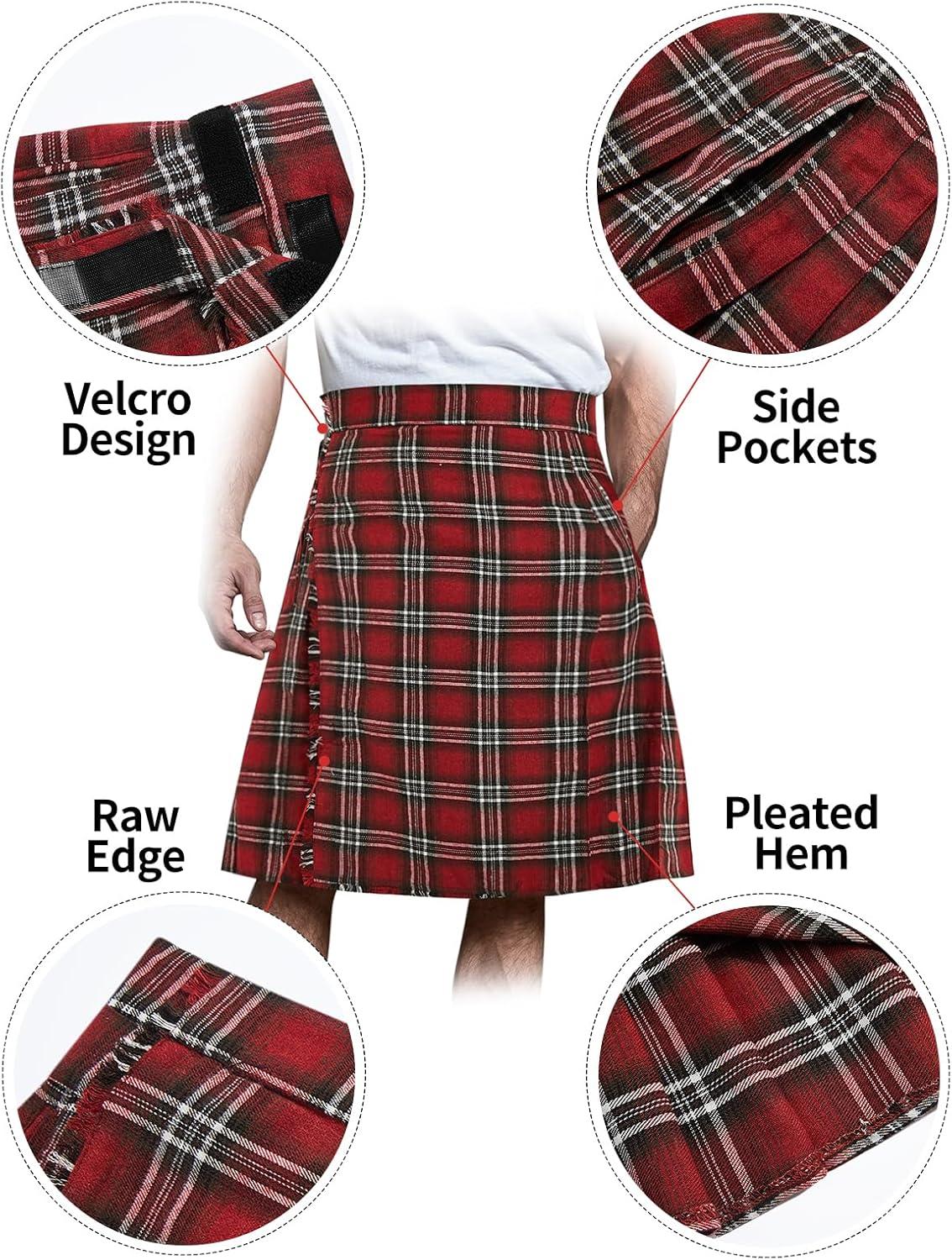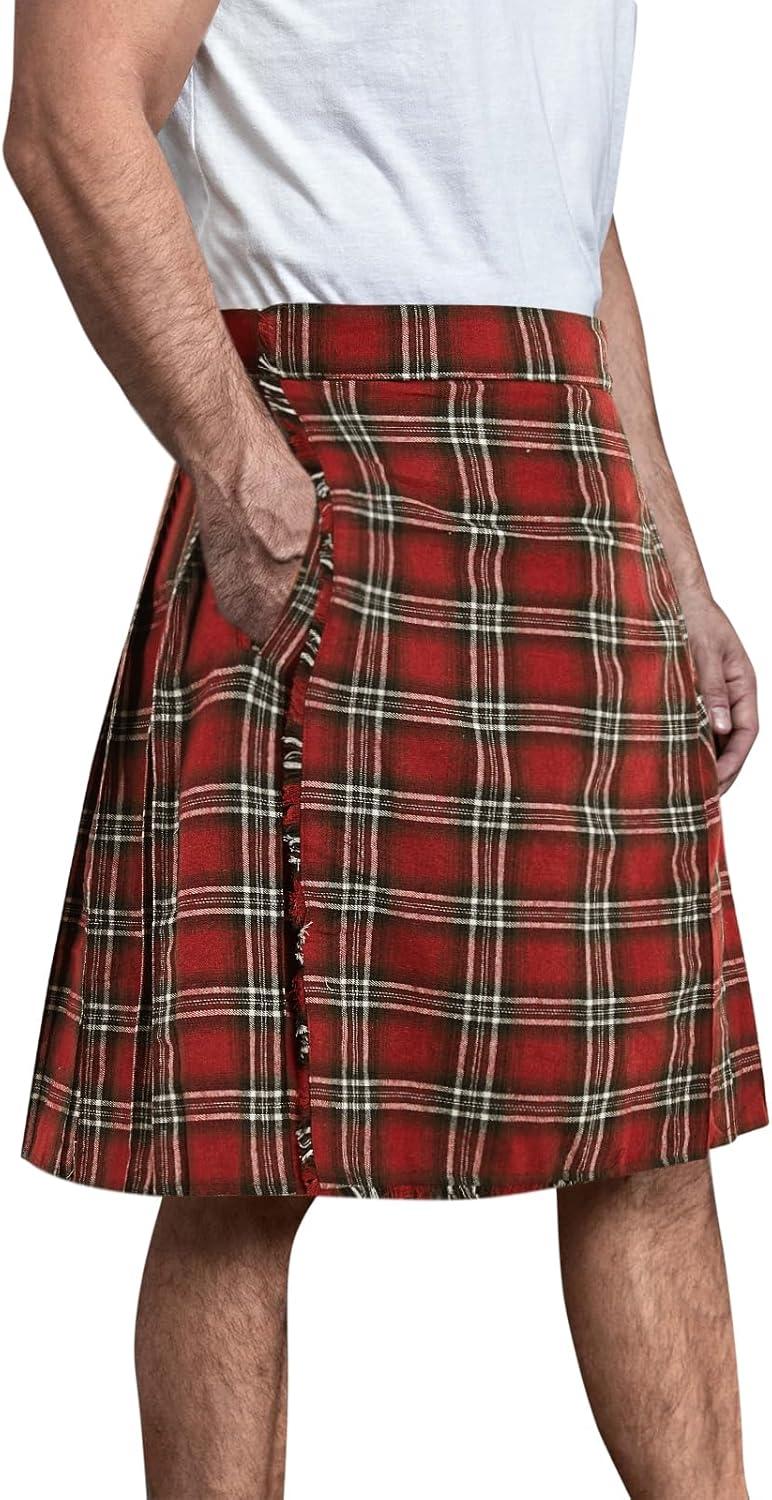Mens Utility Kilt Pin Scottish Tartan Apparel Black & Irish Hybrid Royal Stewart Pockets Kilts(02 Red)