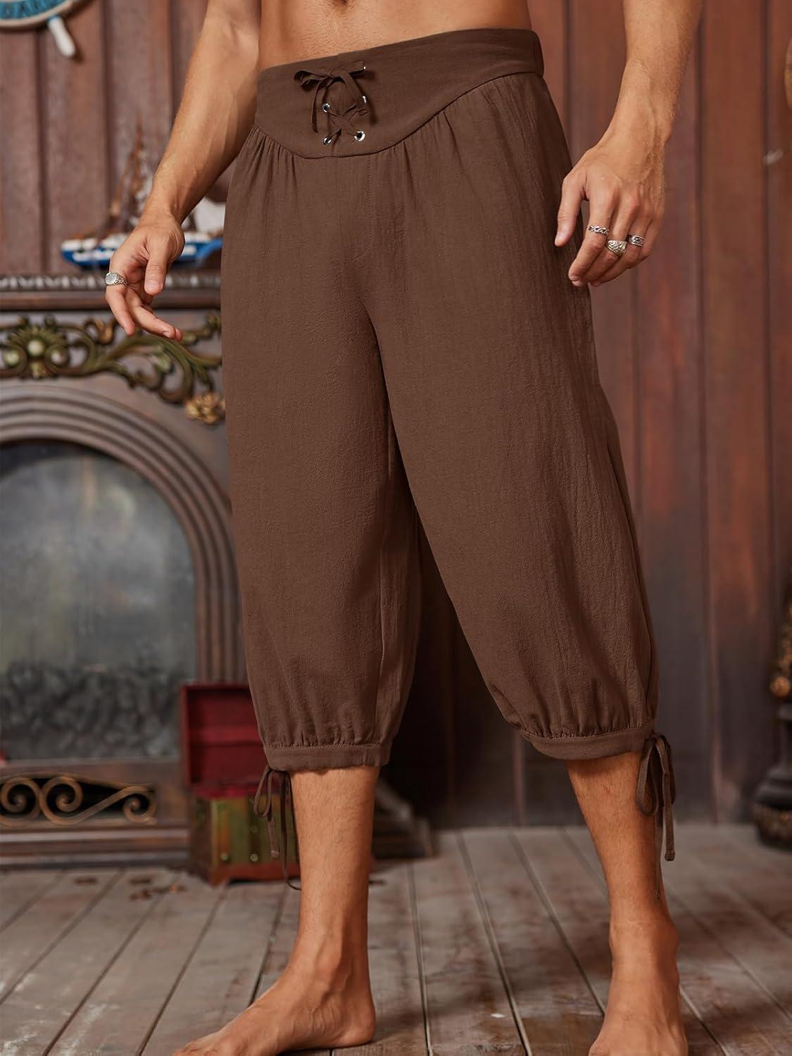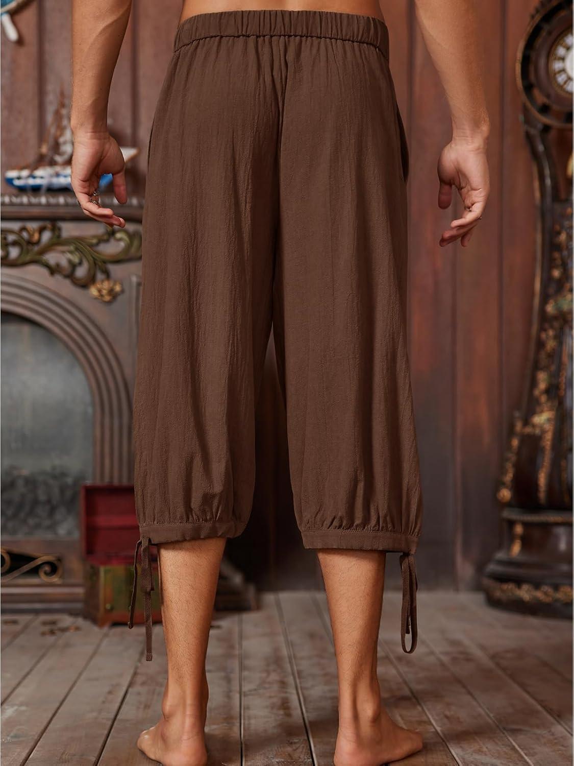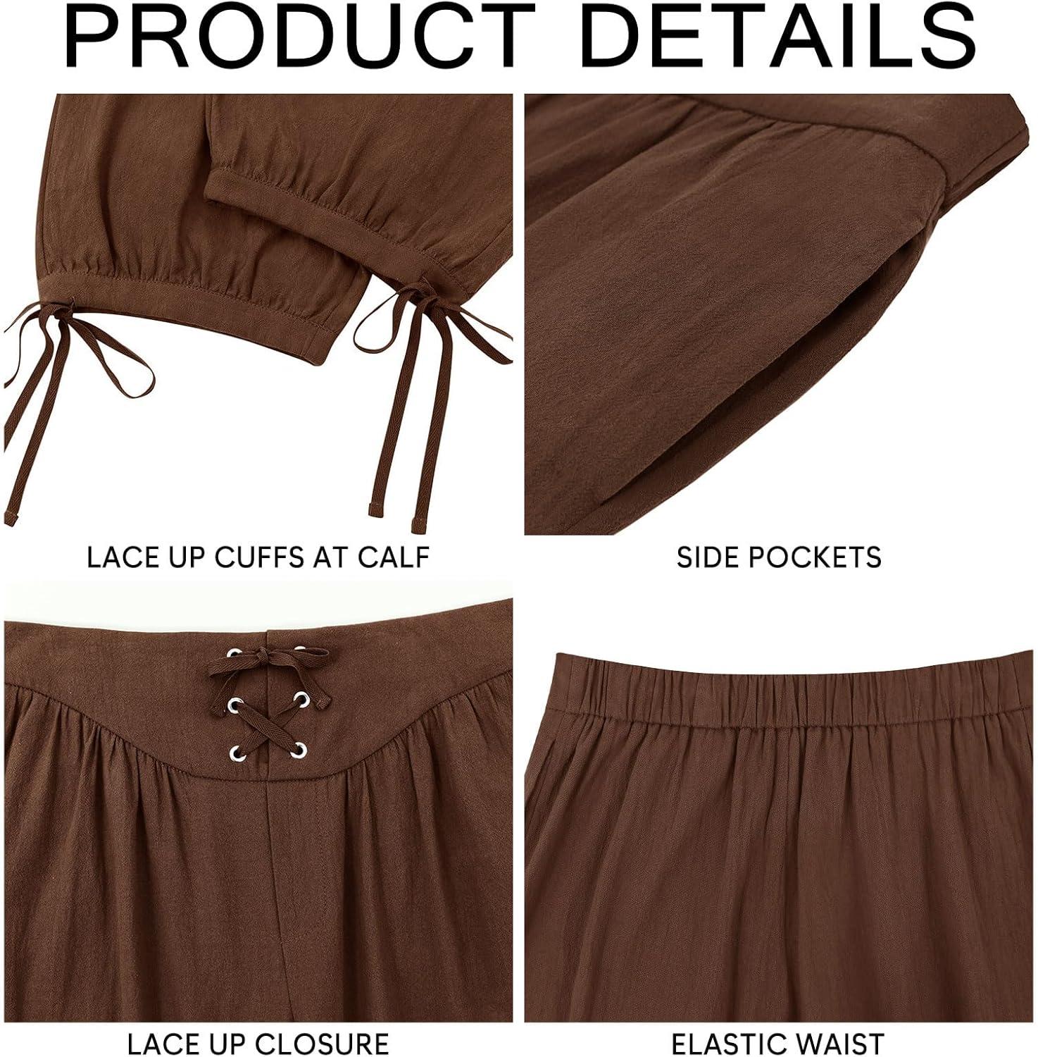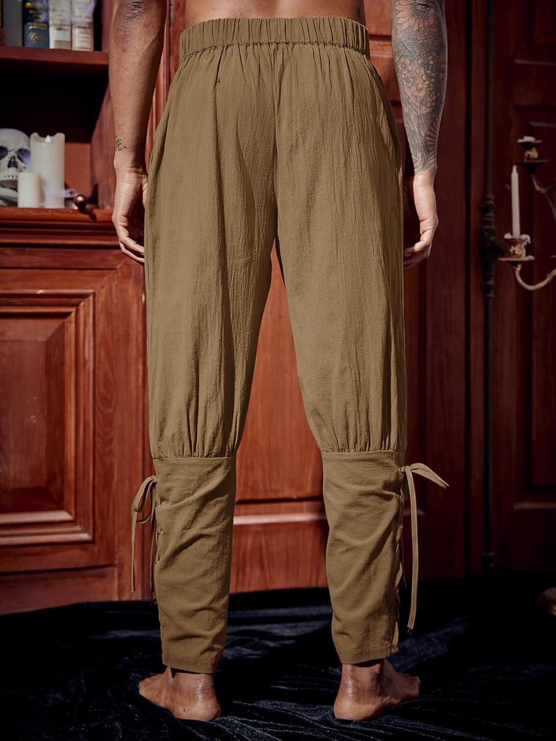 Runcati Mens Medieval Ankle Pants Renaissance Viking Pirate Lace Up Tapered Halloween Linen Costume Trousers(Brown)