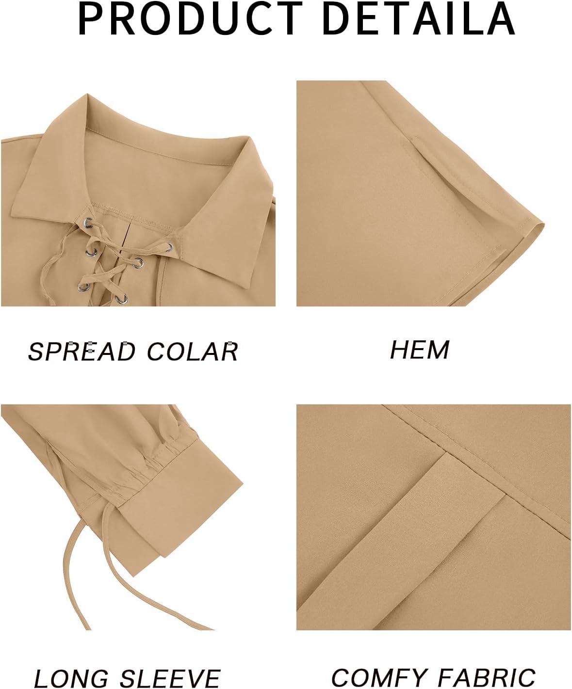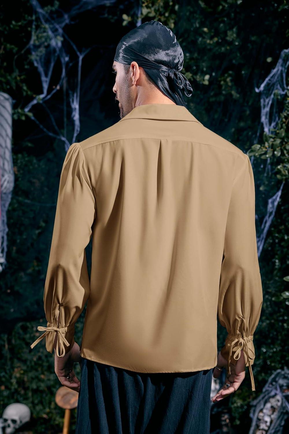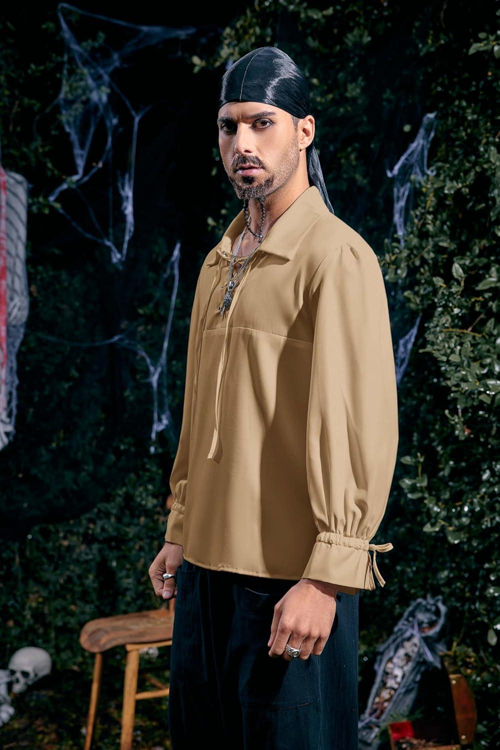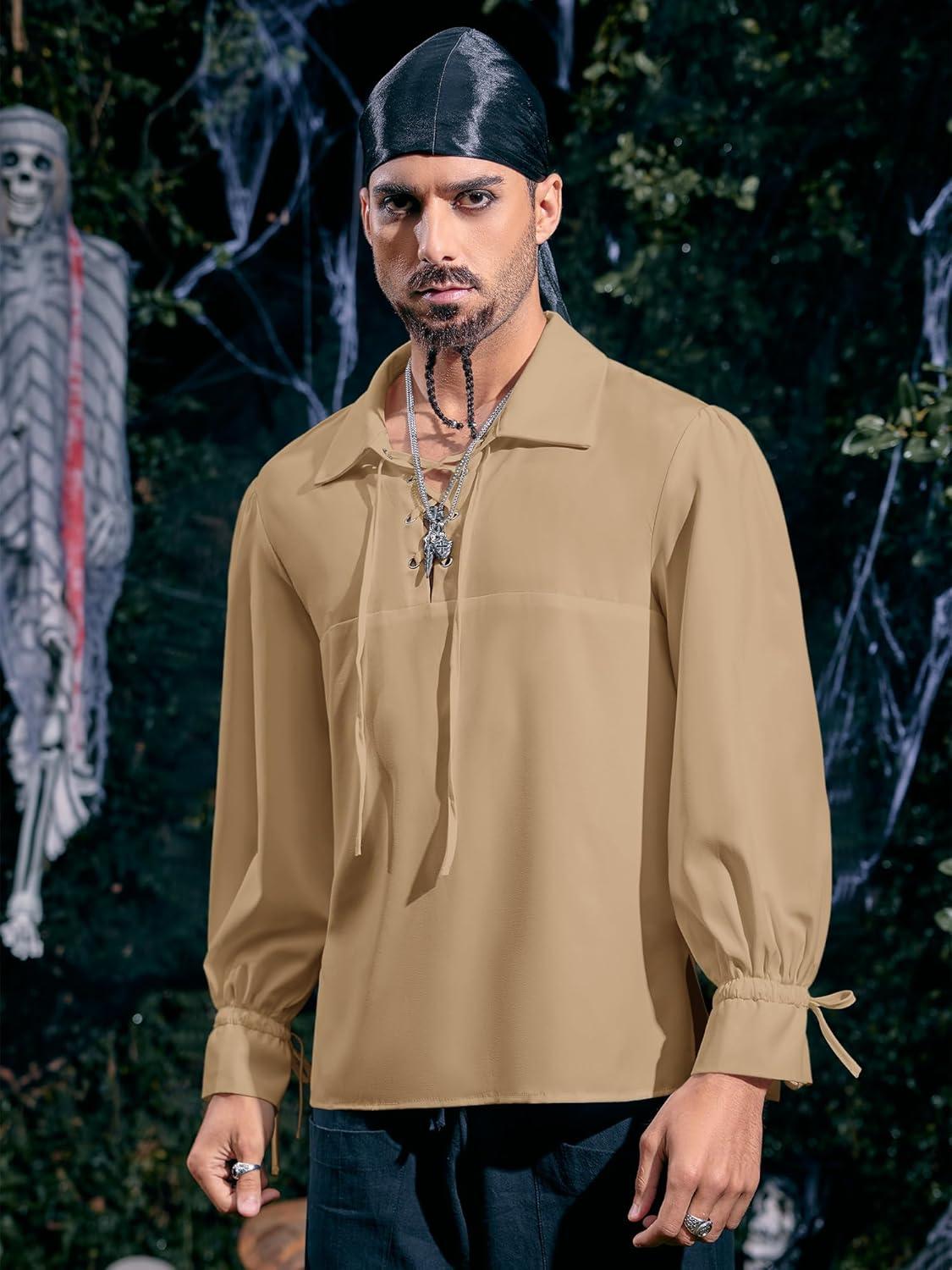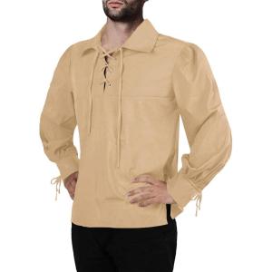 Mens Medieval Pirate Shirt Viking Renaissance Lace up Mercenary Halloween Scottish Jacobite Ghillie Tops(Khaki)