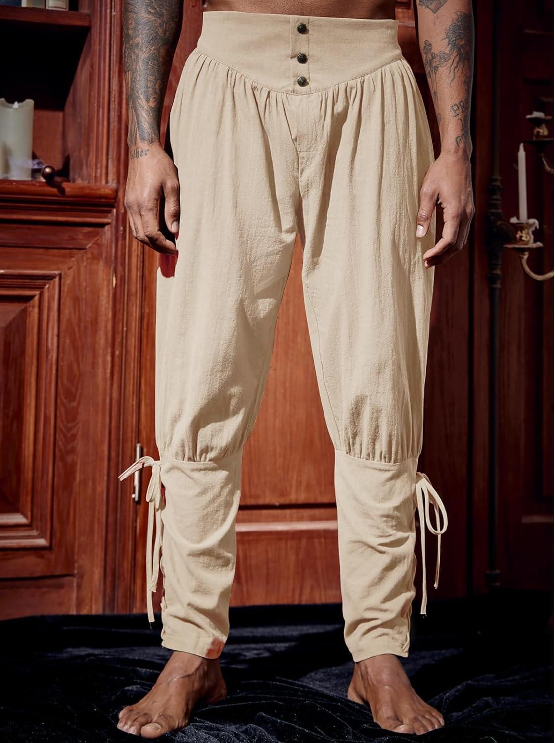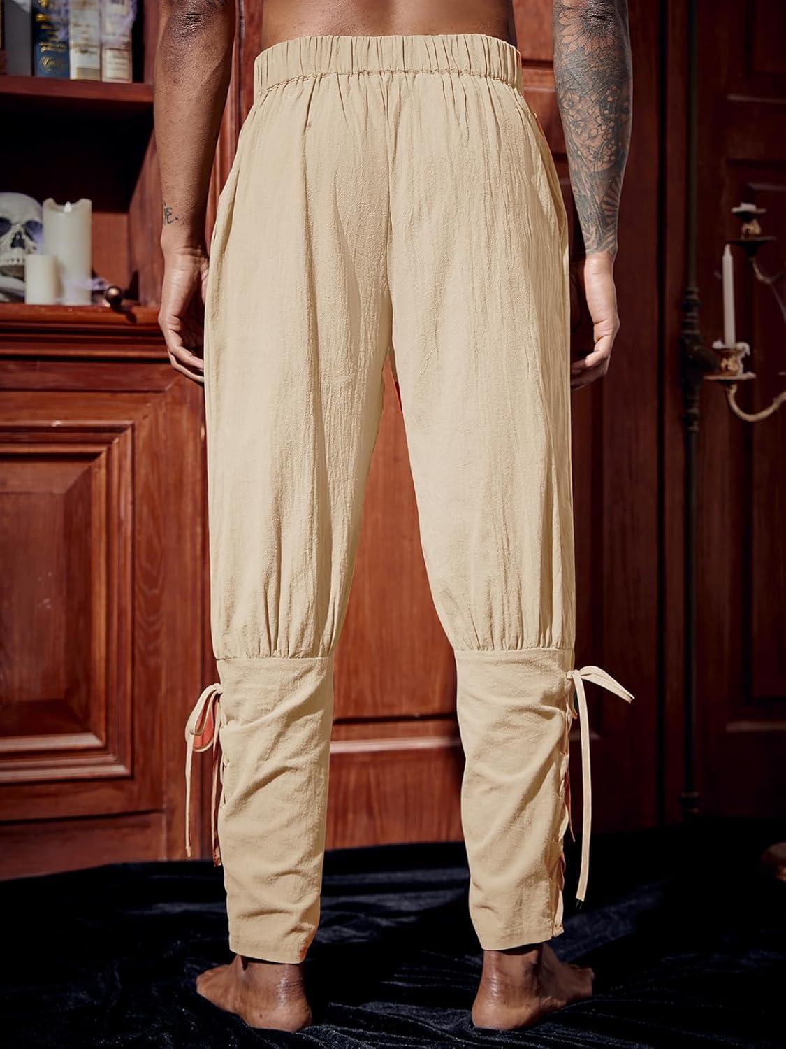 Runcati Mens Medieval Ankle Pants Renaissance Viking Pirate Lace Up Tapered Halloween Linen Costume Trousers(Beige)