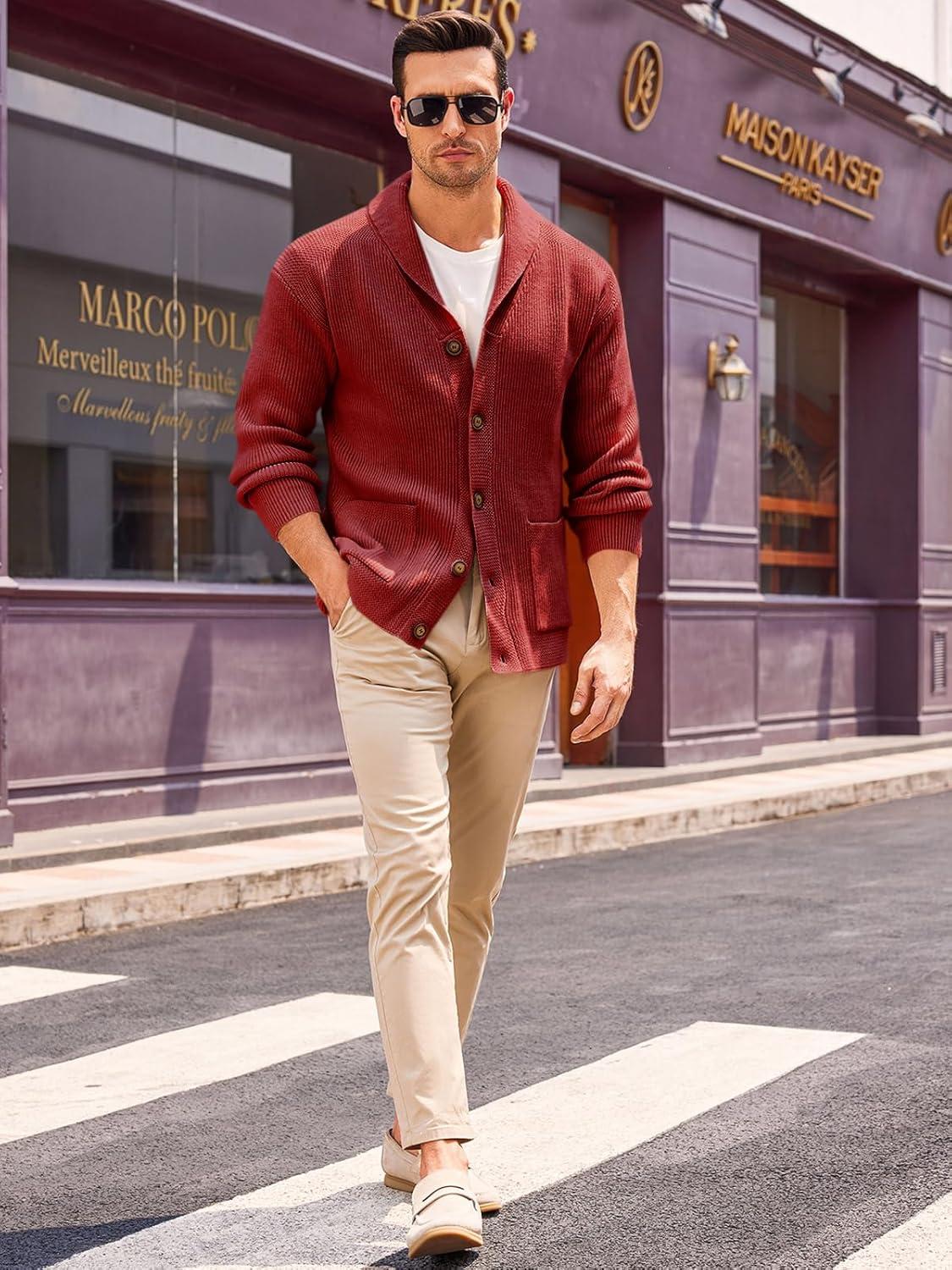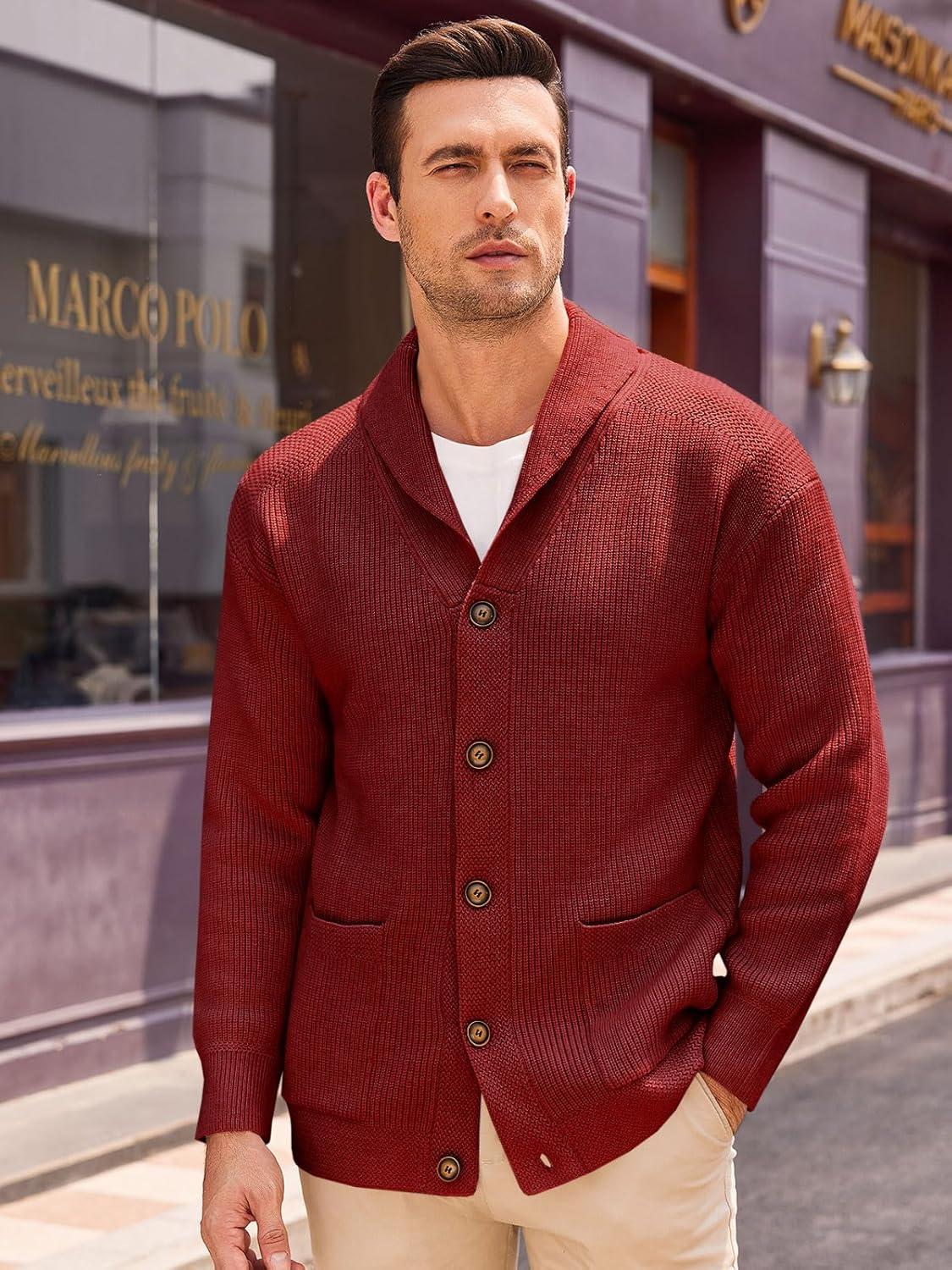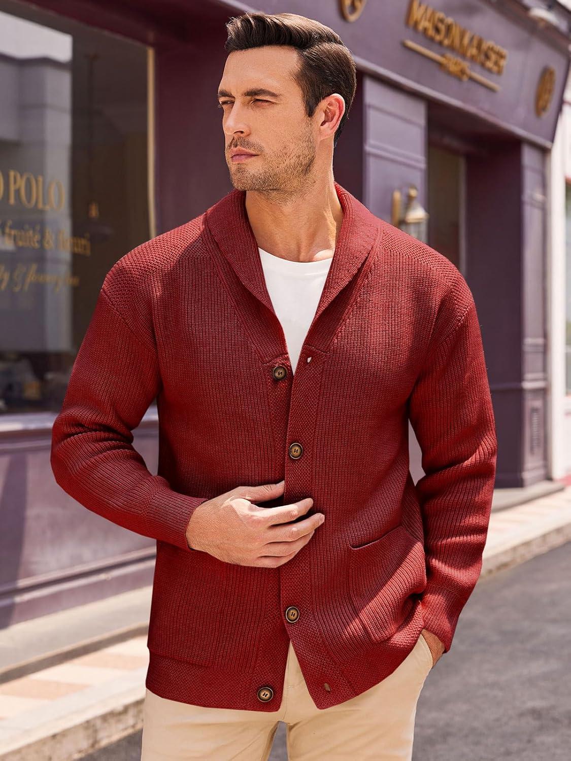 Runcati Mens Shawl Collar Cardigan Sweater Cable Knit Button Down Winter Chunky Sweaters with Pockets(Wine Red)