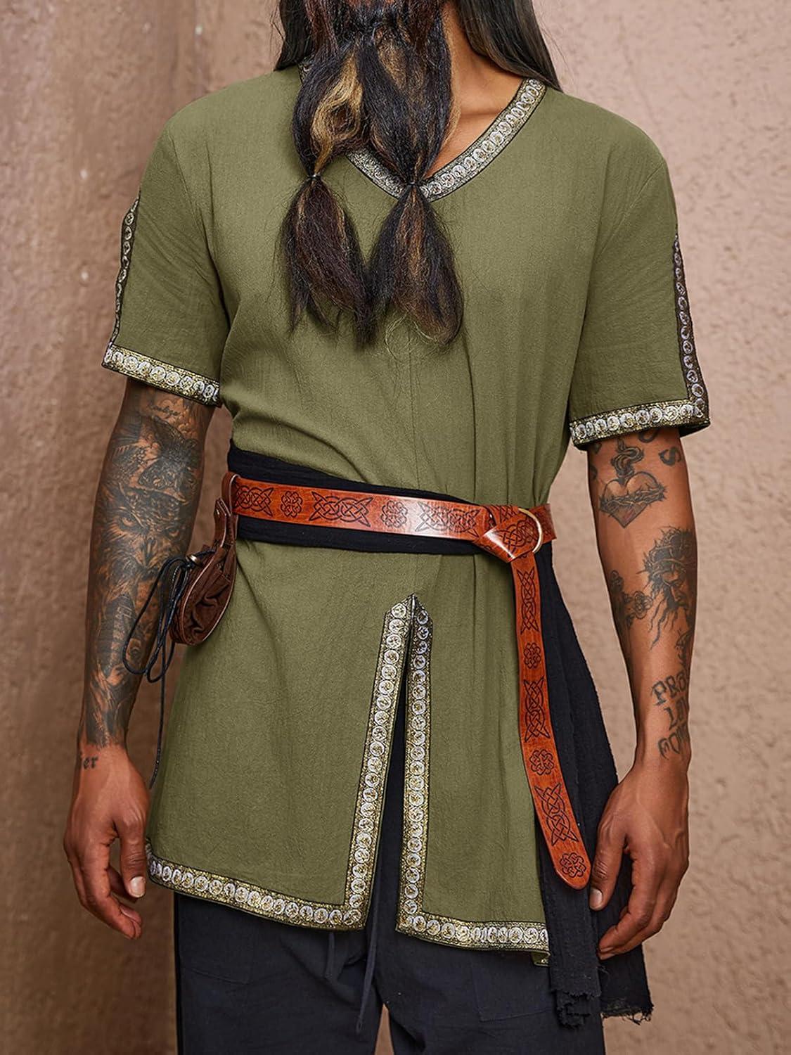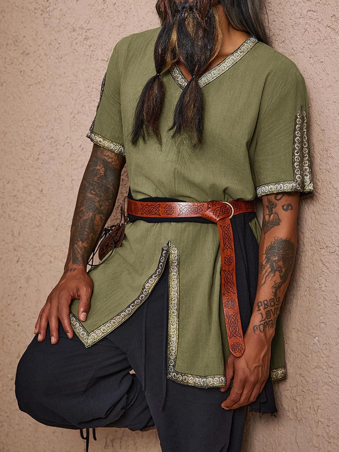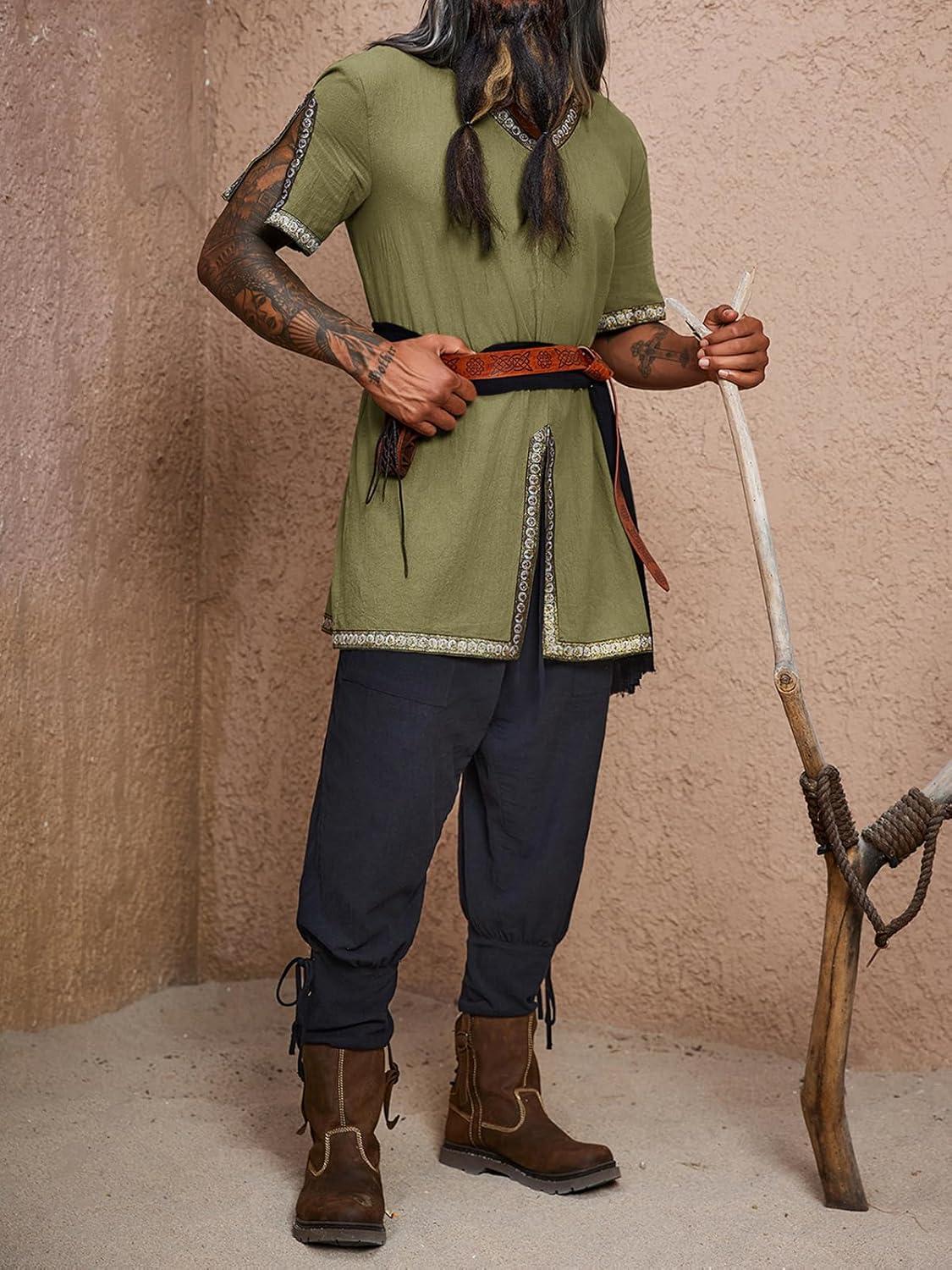 Runcati Mens Medieval Pirate Tunic Renaissance Viking Knight Costume Linen Short Sleeve LARP Halloween Tops(Army Green)
