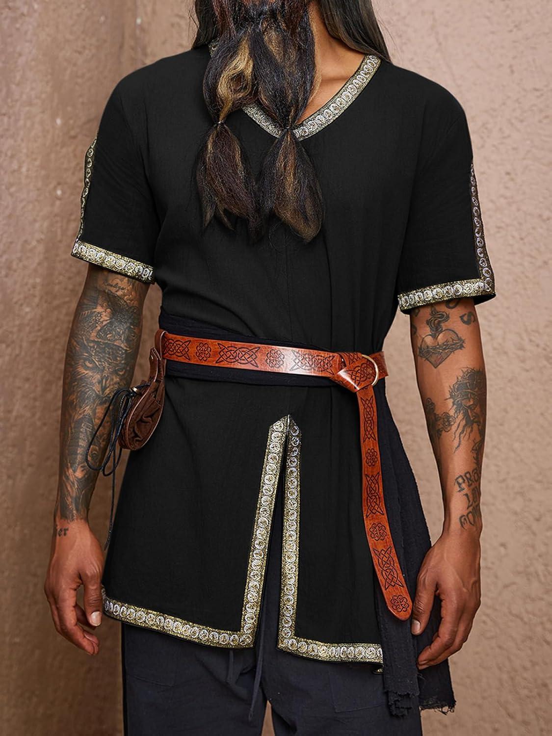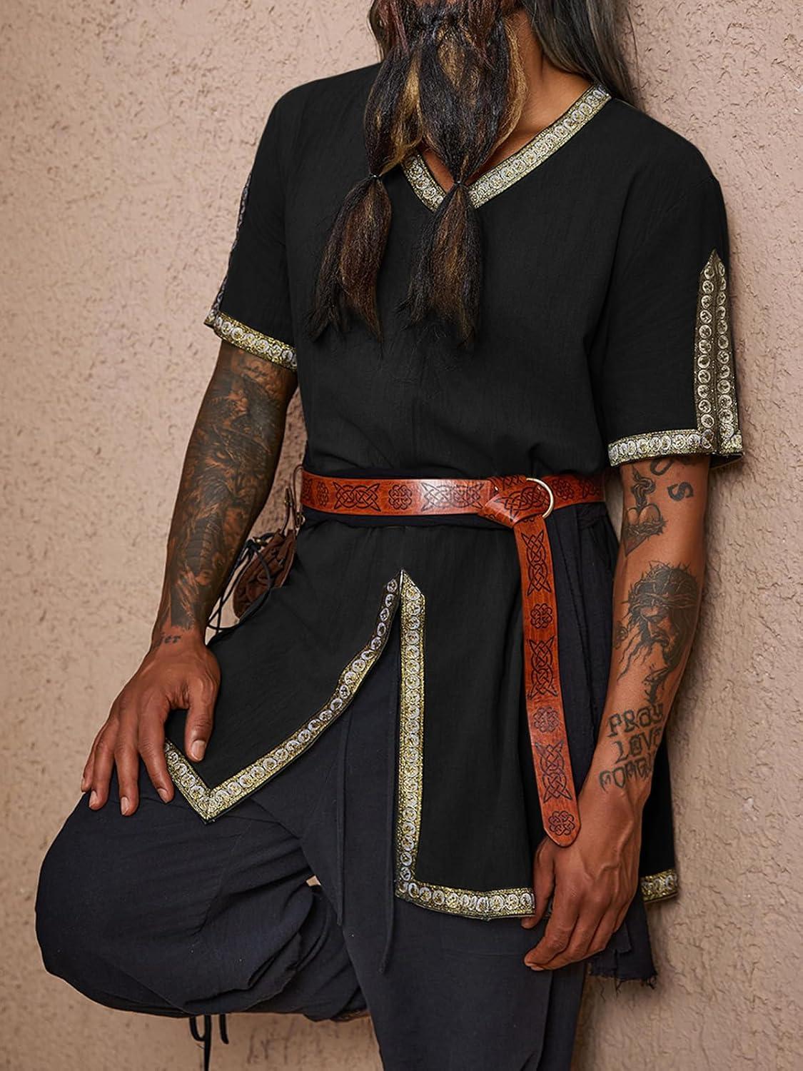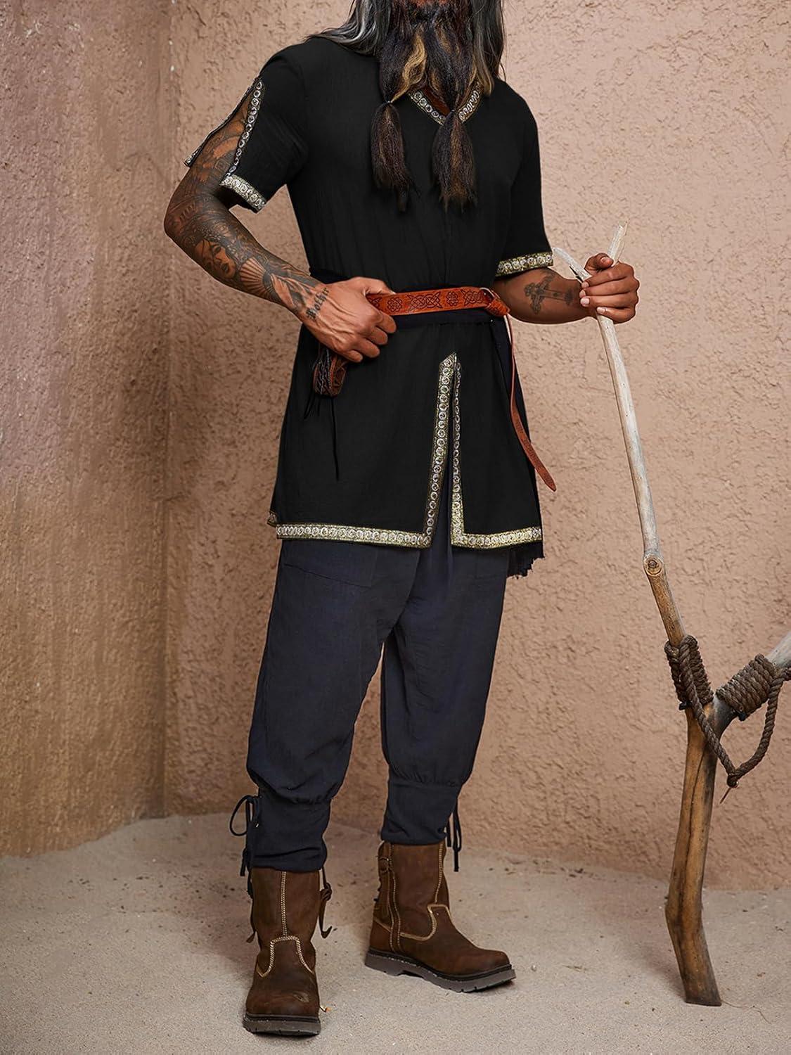 Runcati Mens Medieval Pirate Tunic Renaissance Viking Knight Costume Linen Short Sleeve LARP Halloween Tops(Black)