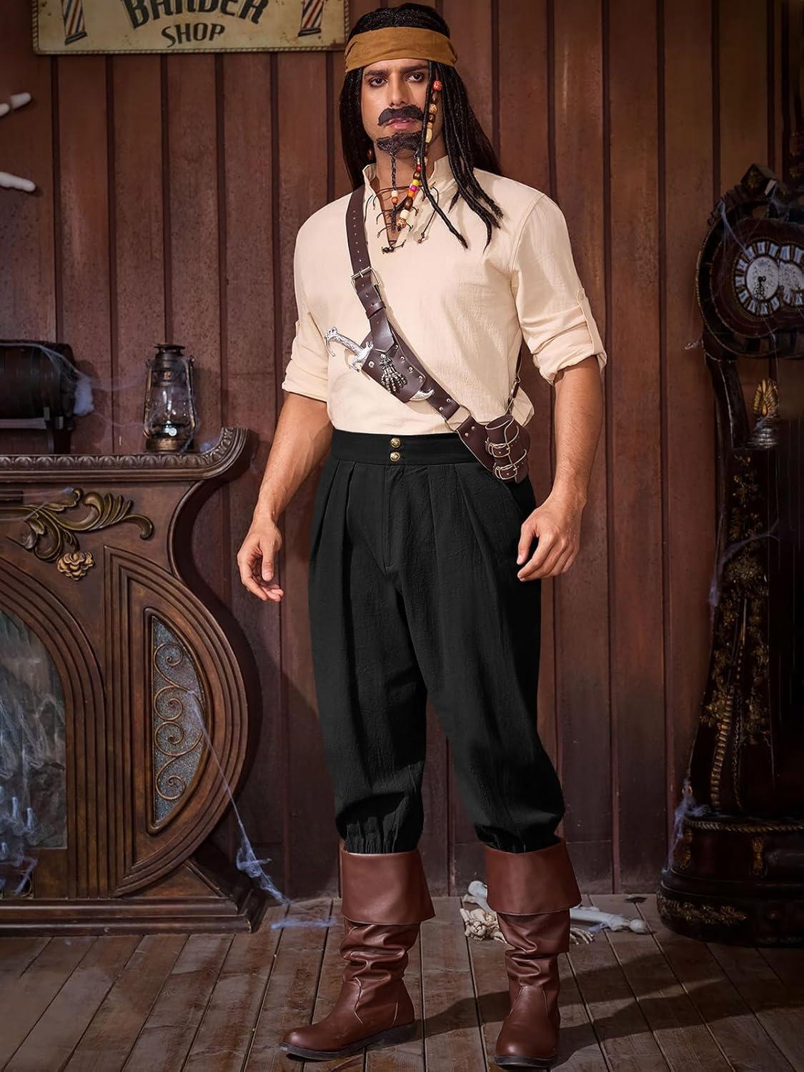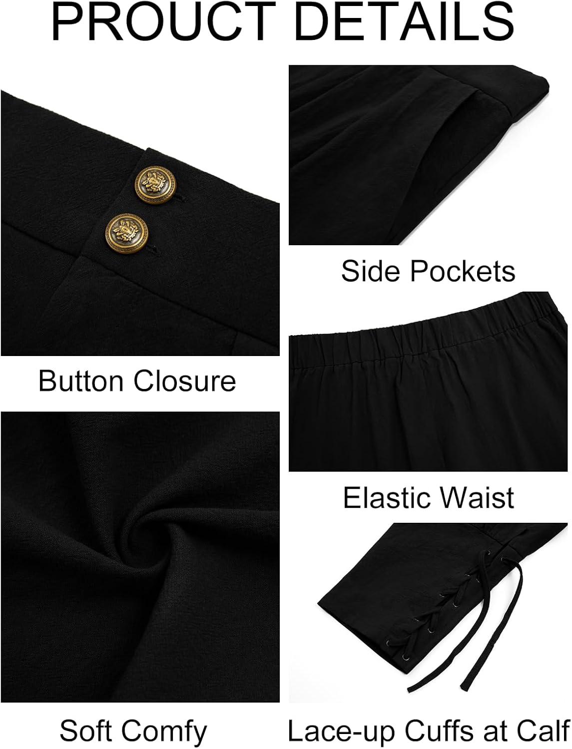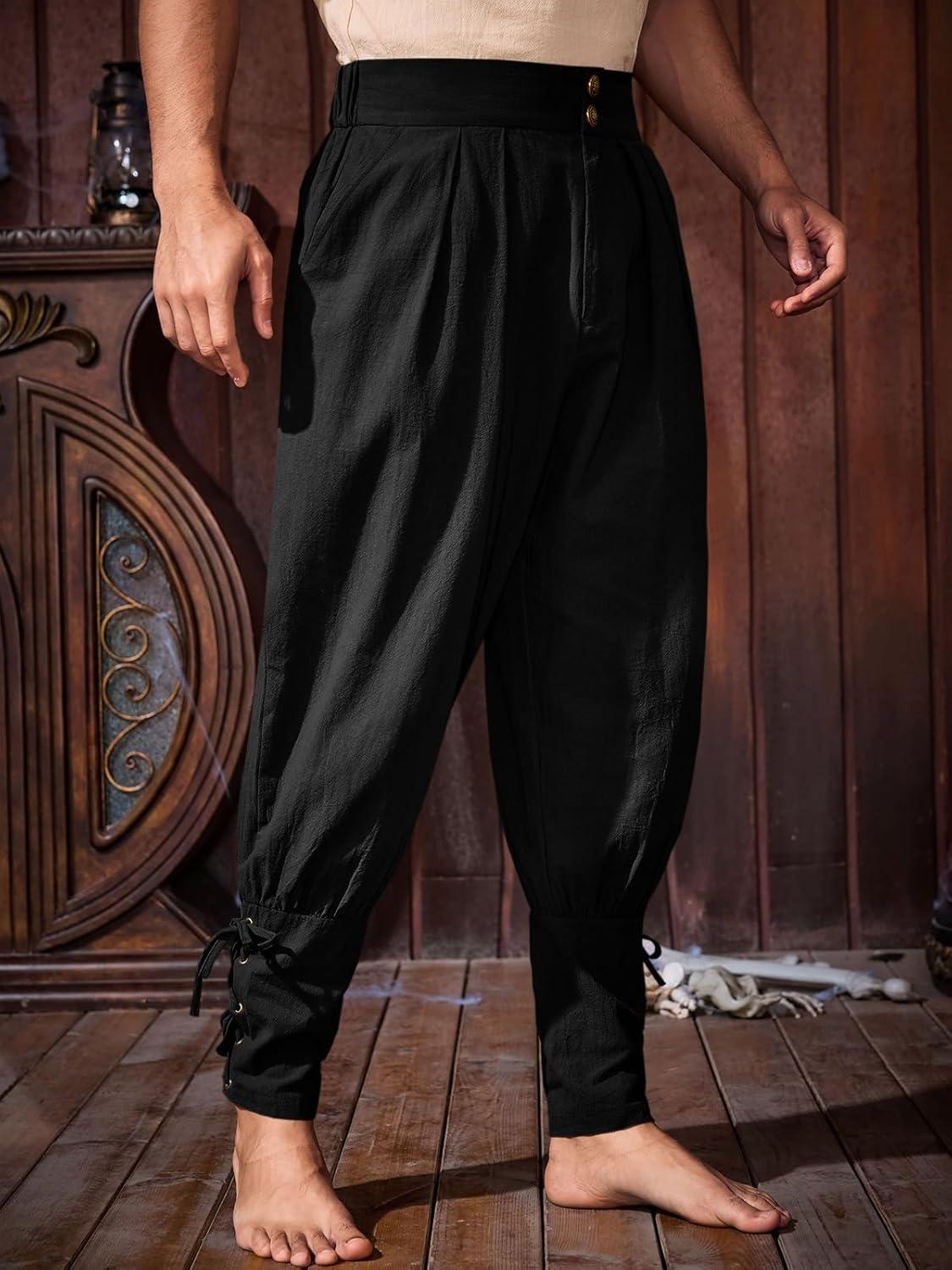 • Runcati Mens Medieval Ankle Pants Renaissance Viking Pirate Pants Lace Up Cotton Tapered Halloween Costume Trousers(Black)