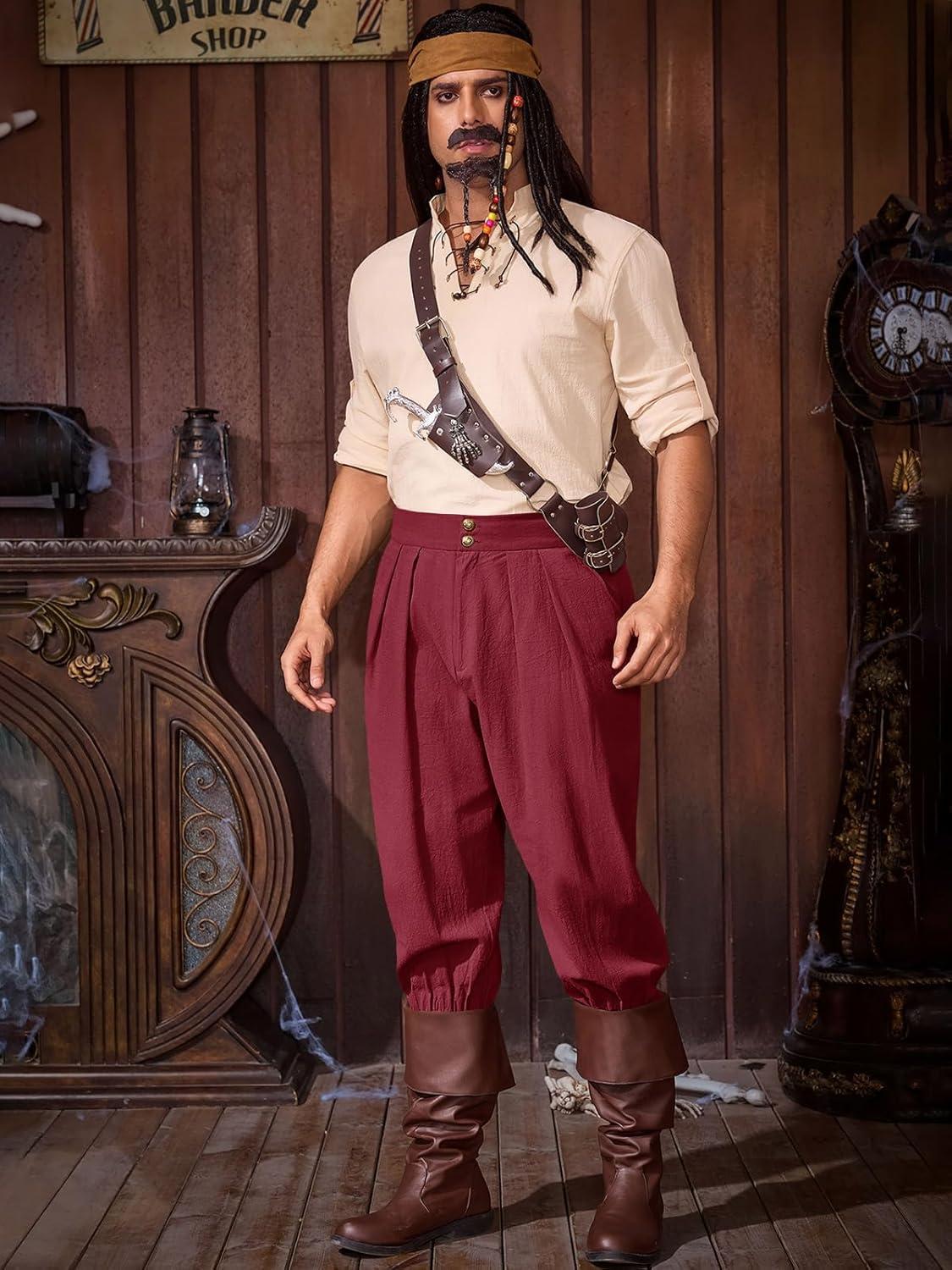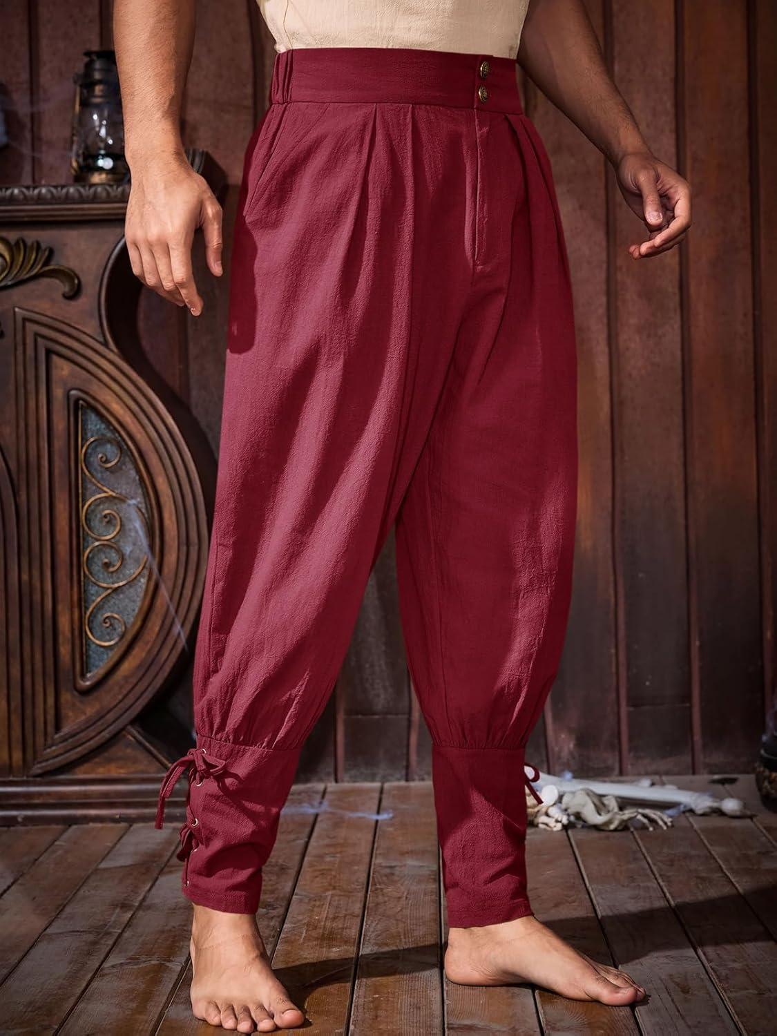 • Runcati Mens Medieval Ankle Pants Renaissance Viking Pirate Pants Lace Up Cotton Tapered Halloween Costume Trousers(Claret)