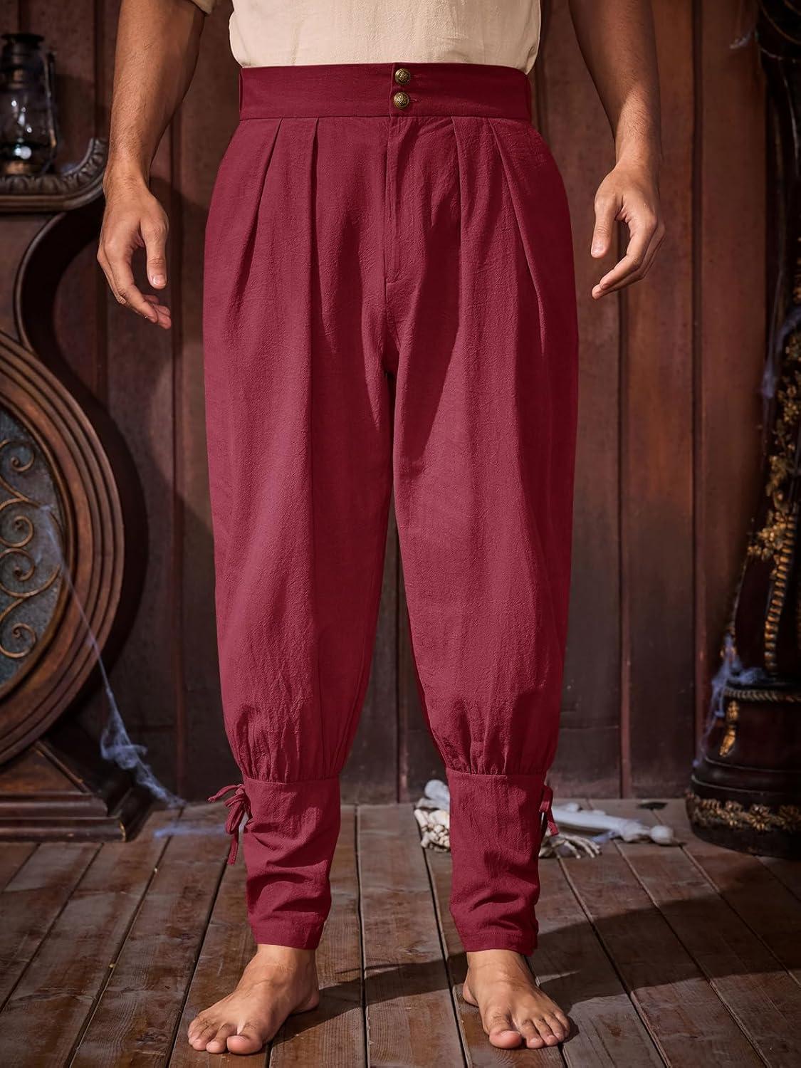 • Runcati Mens Medieval Ankle Pants Renaissance Viking Pirate Pants Lace Up Cotton Tapered Halloween Costume Trousers(Purplish Red)