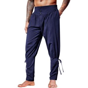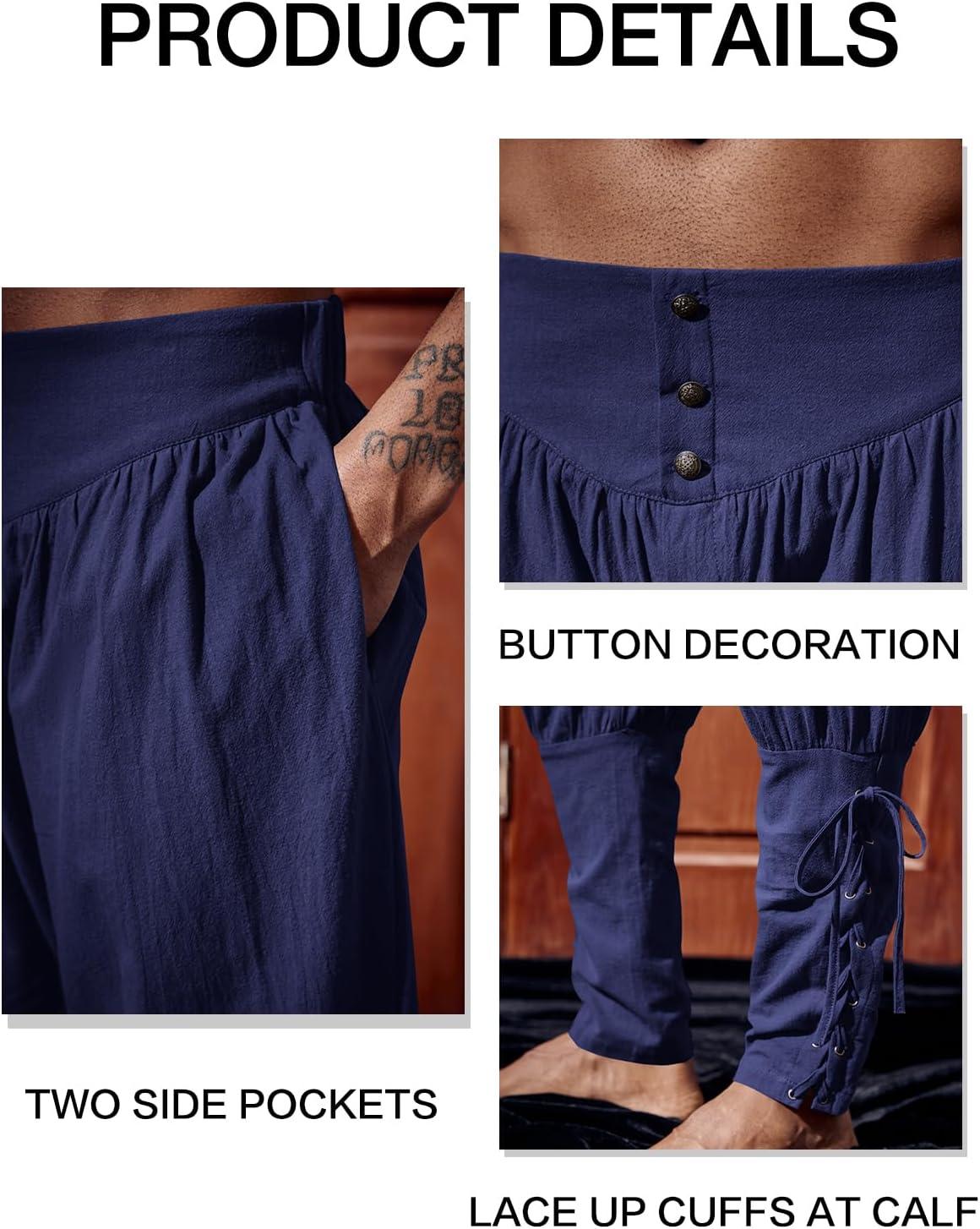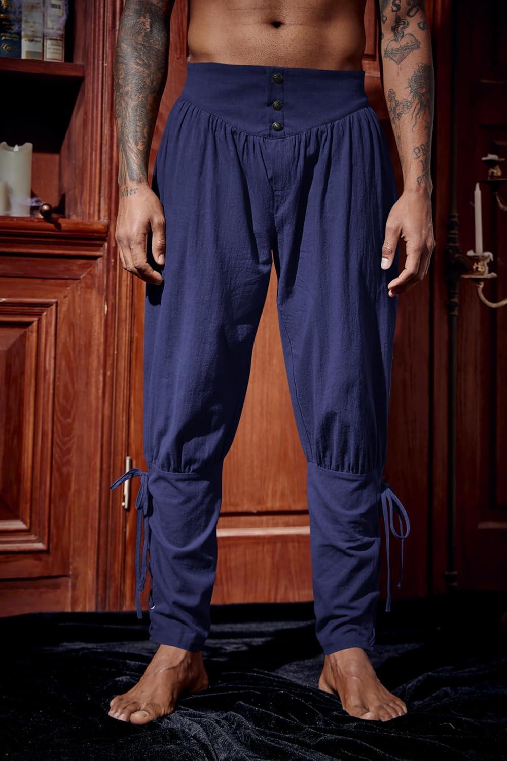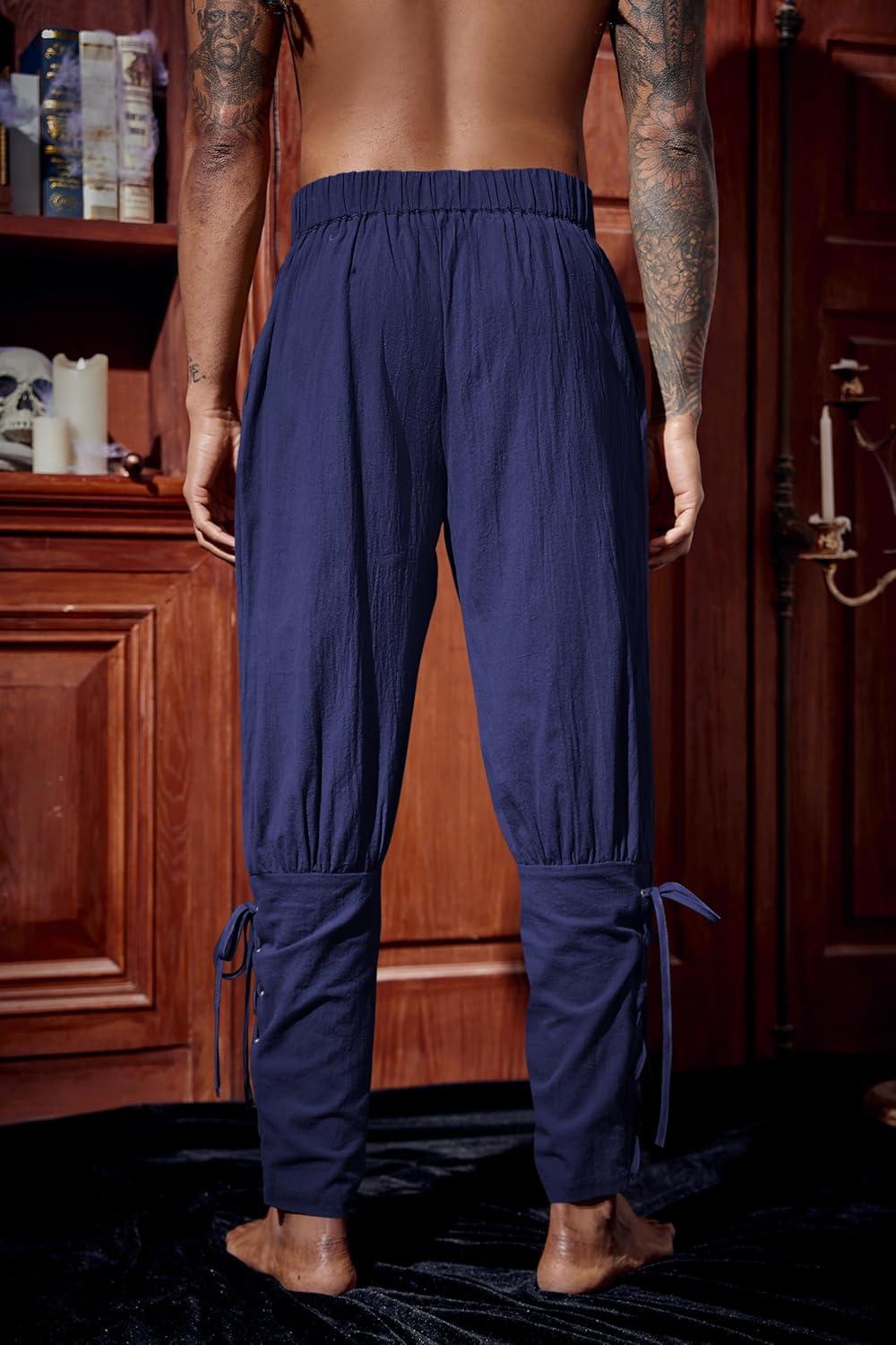 • Runcati Mens Medieval Ankle Pants Renaissance Viking Pirate Lace Up Tapered Halloween Linen Costume Trousers(Navy)