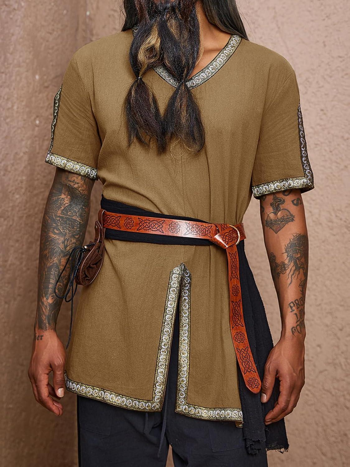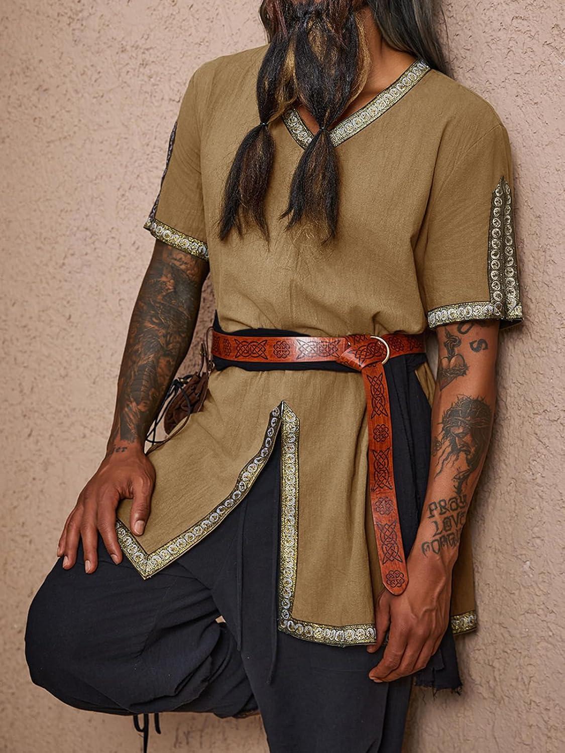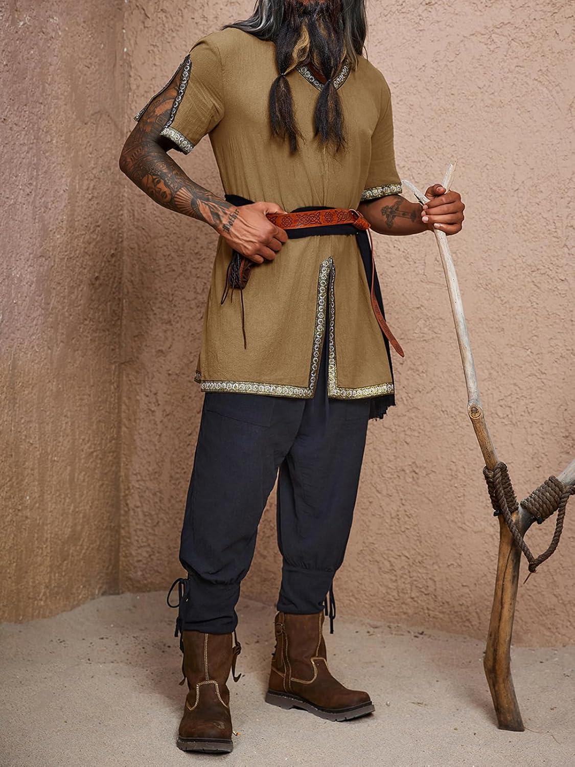 • Runcati Mens Medieval Pirate Tunic Renaissance Viking Knight Costume Linen Short Sleeve LARP Halloween Tops(Brown)