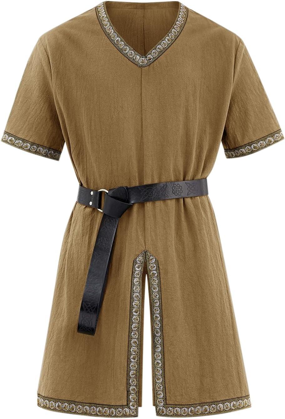 Runcati Mens Medieval Pirate Tunic Renaissance Viking Knight Costume Linen Short Sleeve LARP Halloween Tops(Brown)