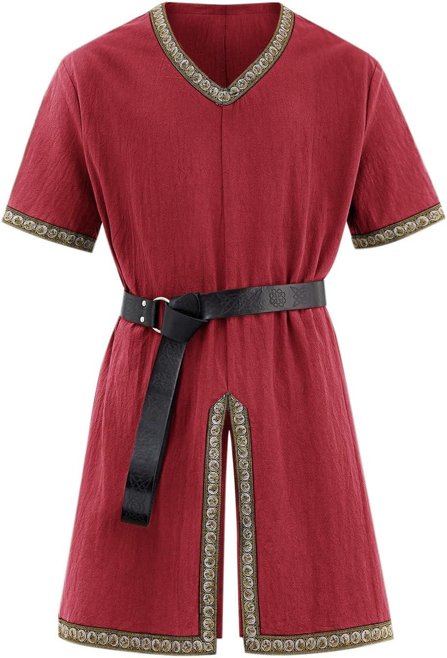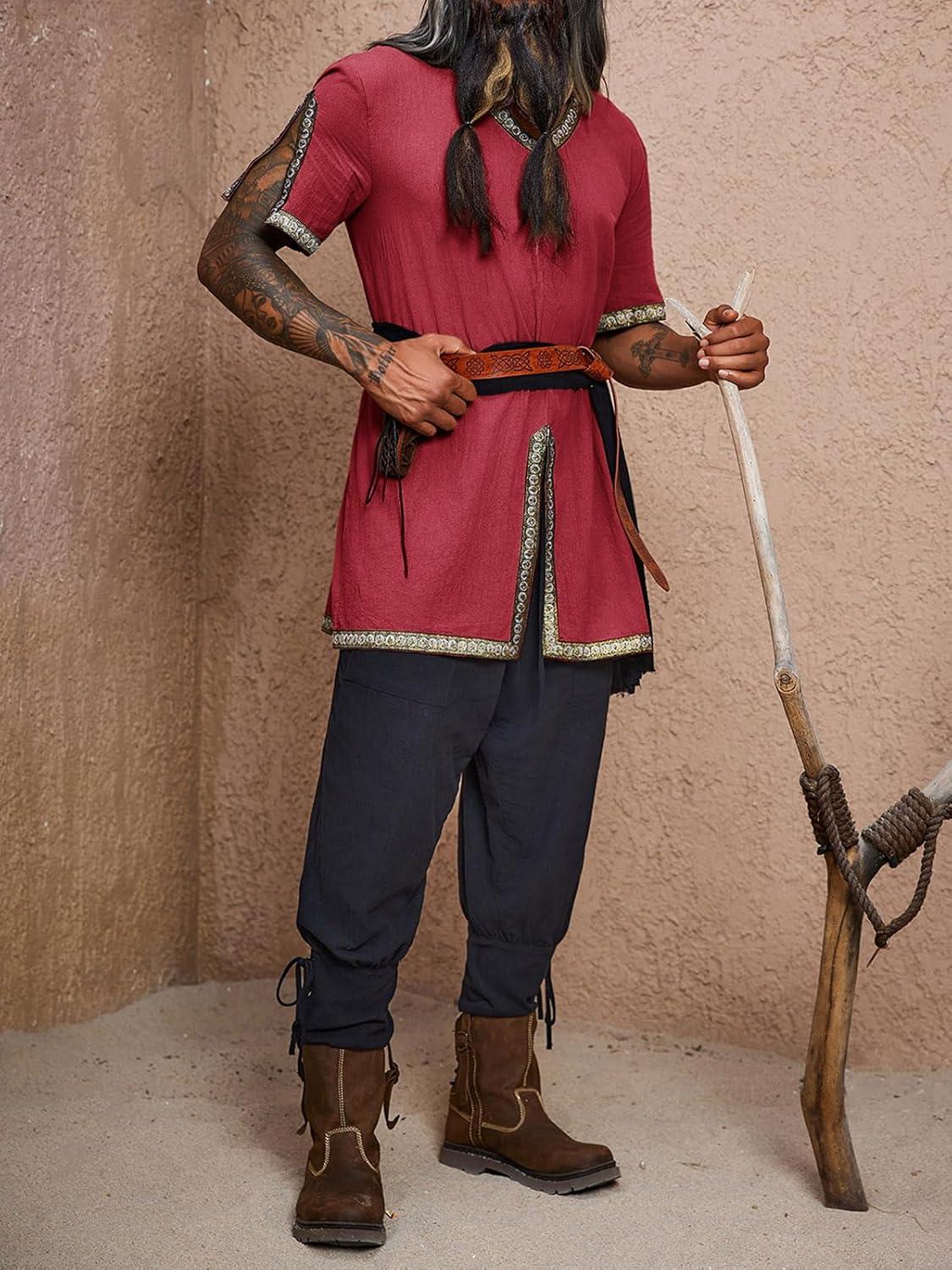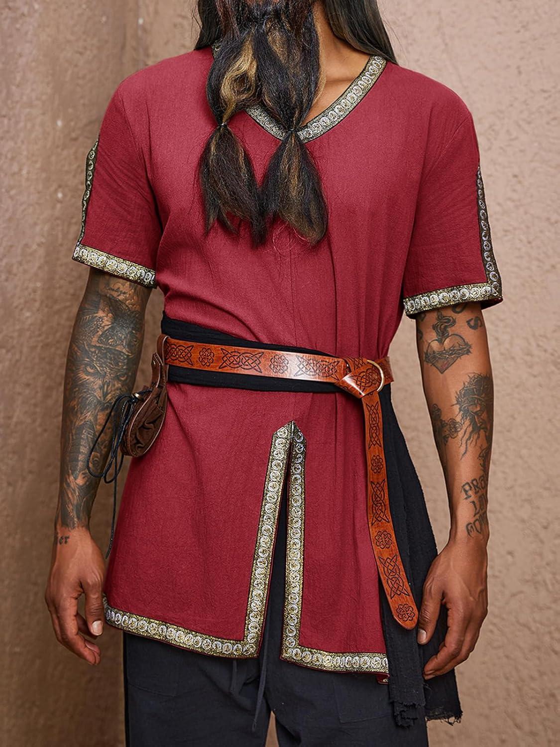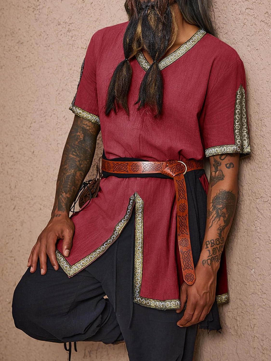 • Runcati Mens Medieval Pirate Tunic Renaissance Viking Knight Costume Linen Short Sleeve LARP Halloween Tops(Burgundy)