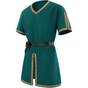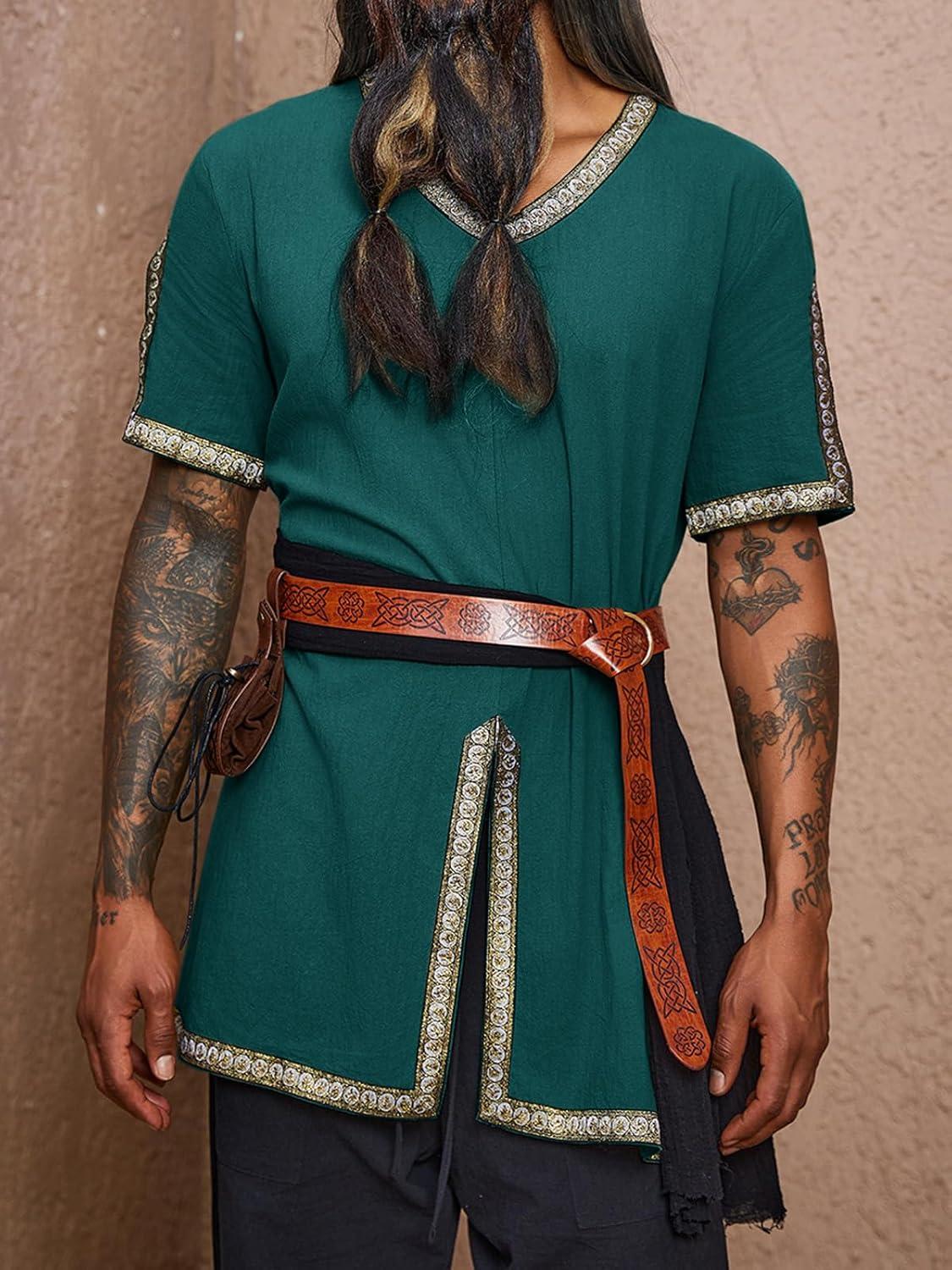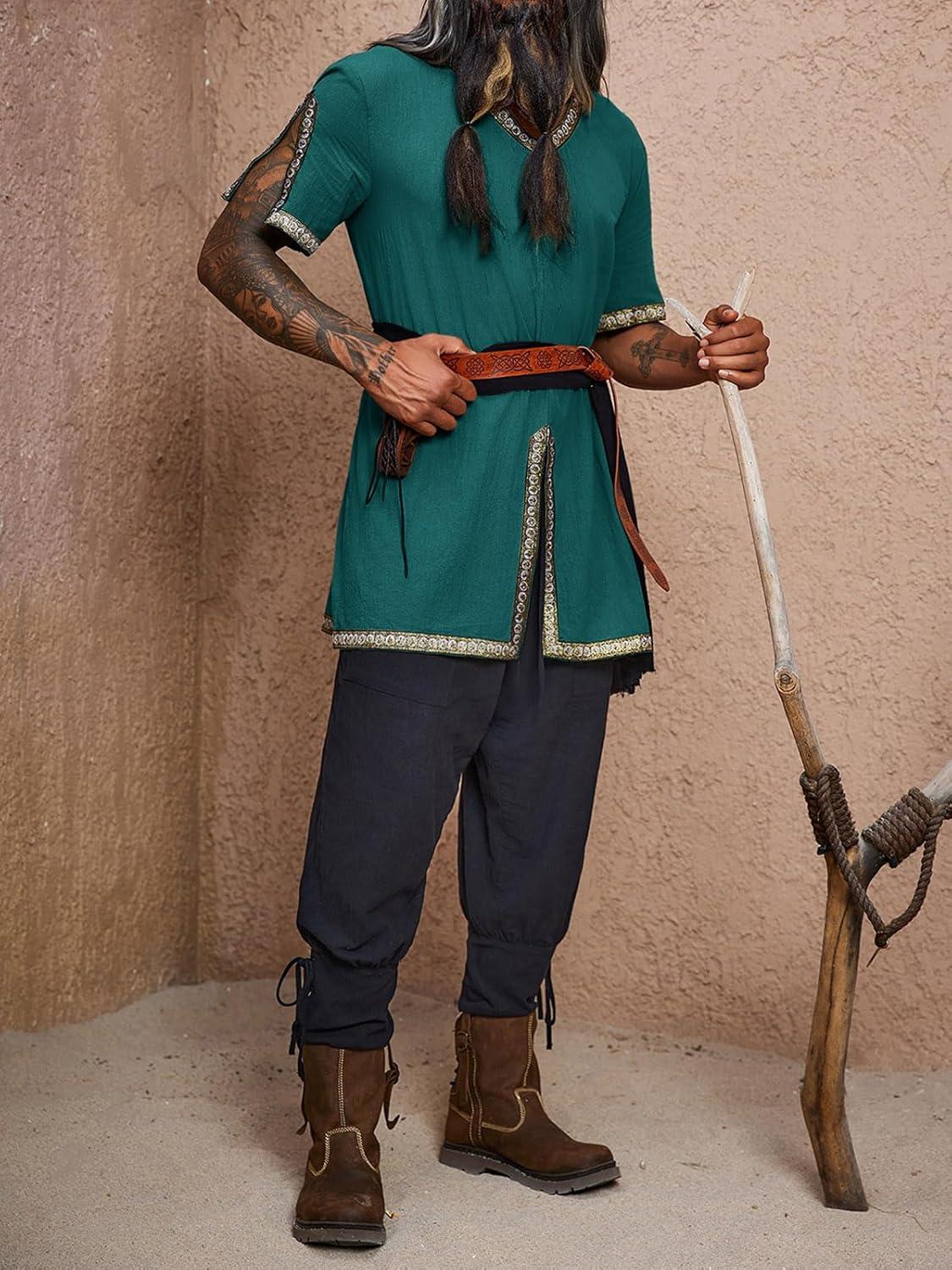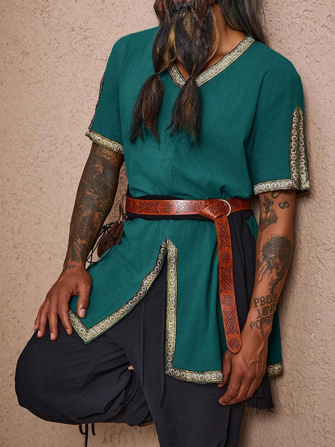 • Runcati Mens Medieval Pirate Tunic Renaissance Viking Knight Costume Linen Short Sleeve LARP Halloween Tops(Dark Green)
