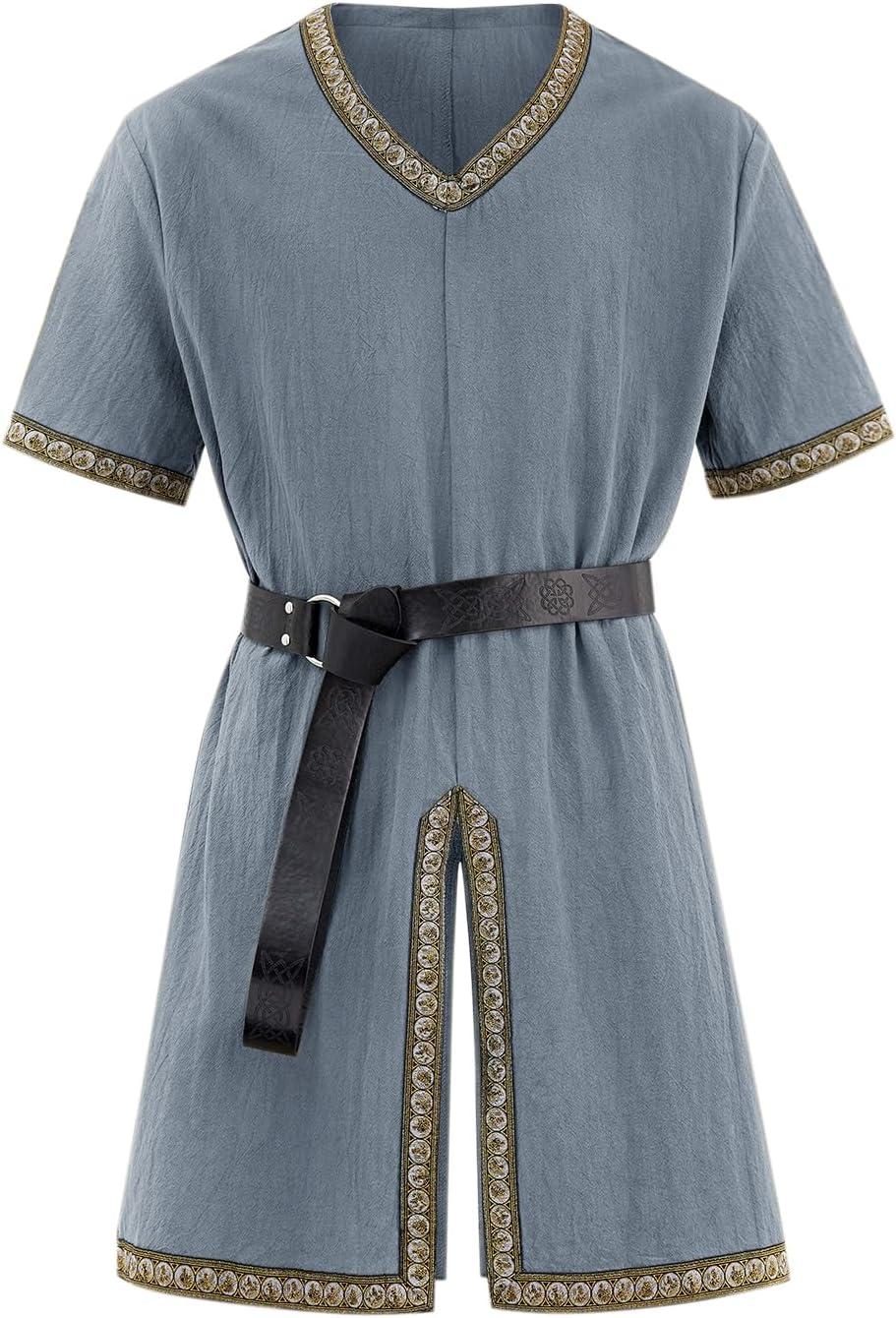 • Runcati Mens Medieval Pirate Tunic Renaissance Viking Knight Costume Linen Short Sleeve LARP Halloween Tops(Grey)