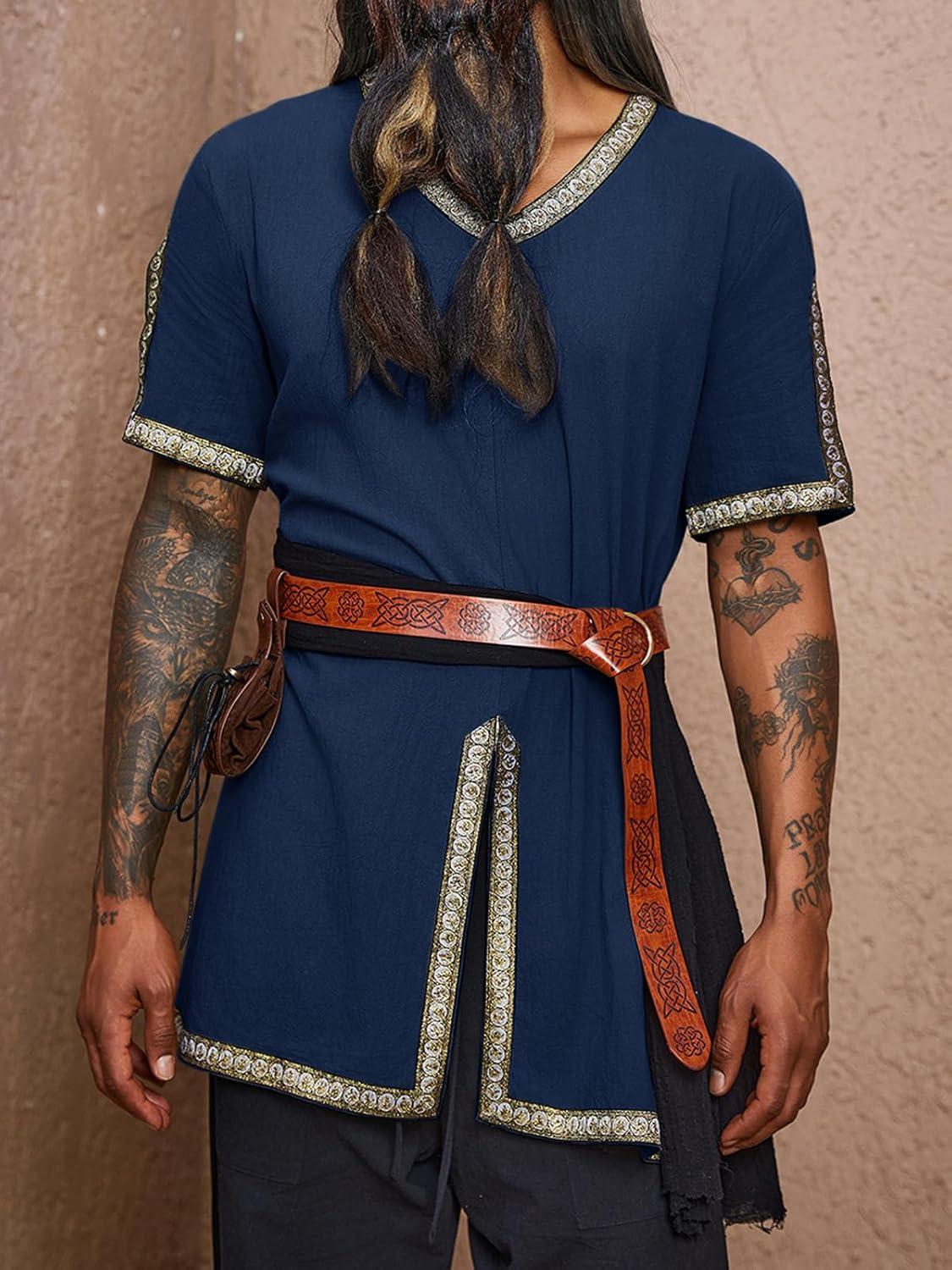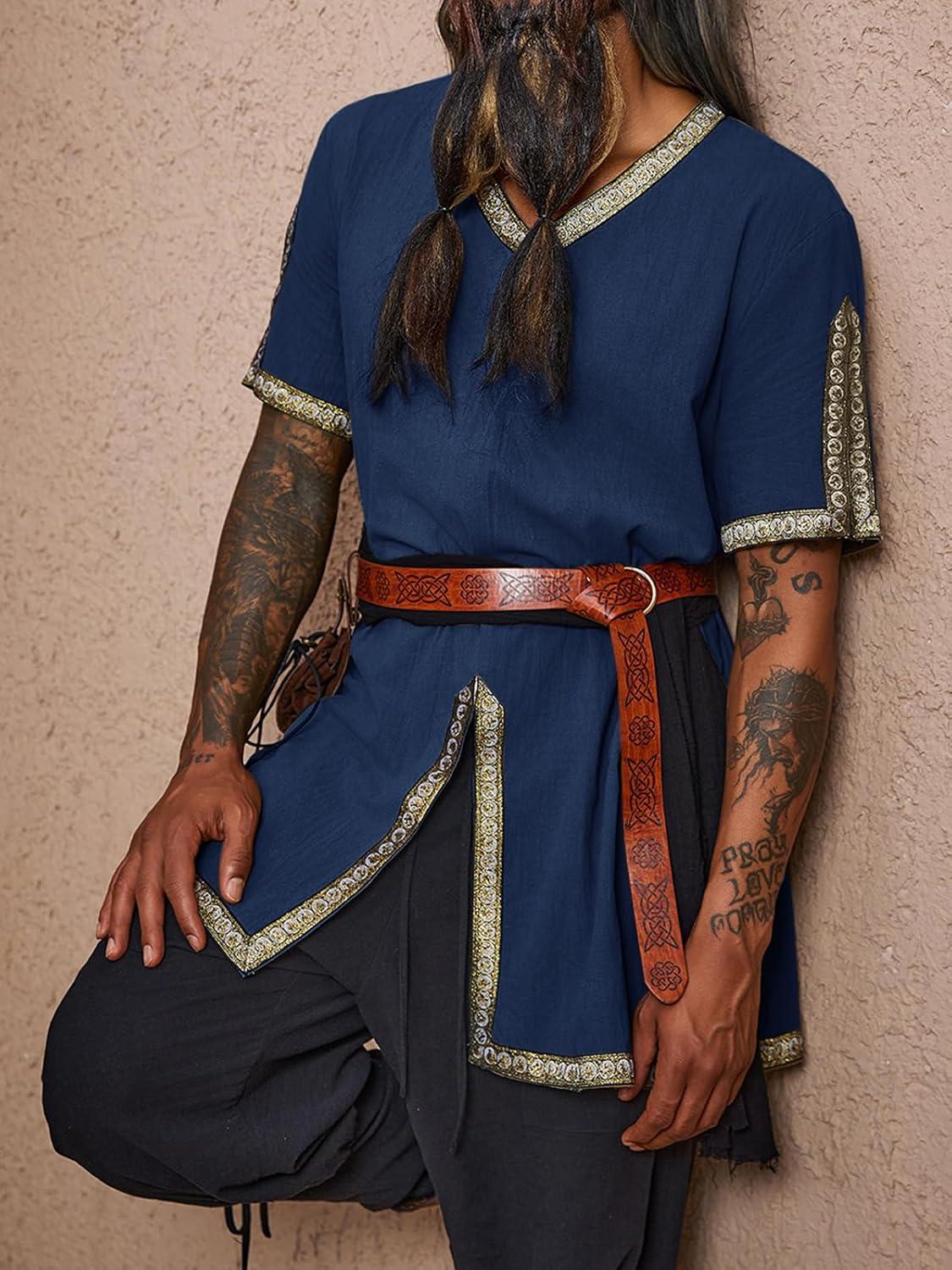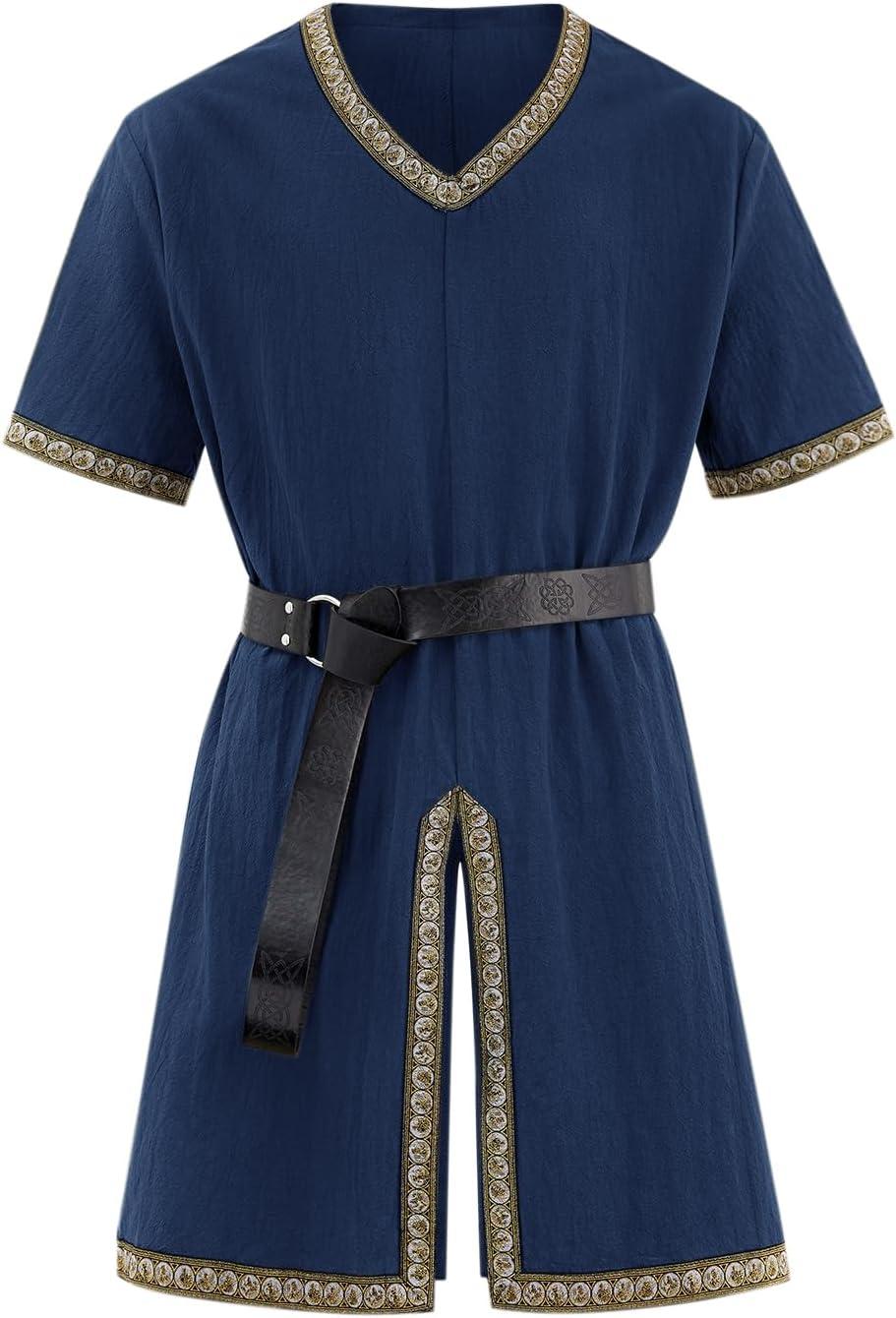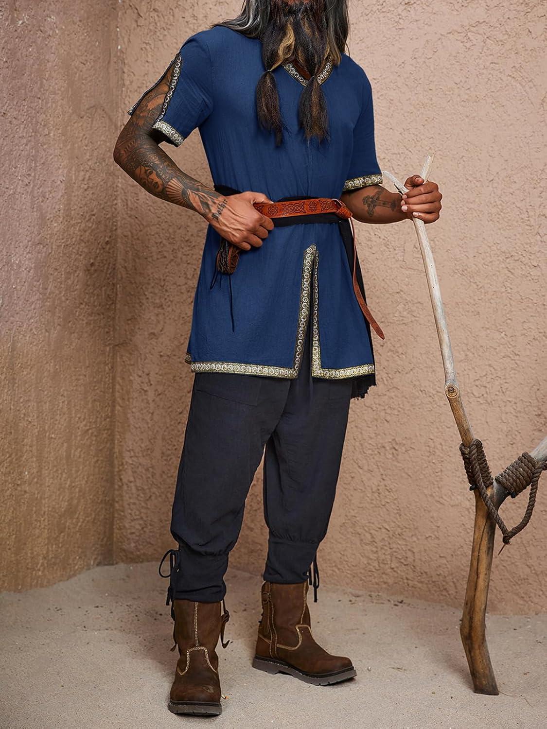 • Runcati Mens Medieval Pirate Tunic Renaissance Viking Knight Costume Linen Short Sleeve LARP Halloween Tops(Navy)