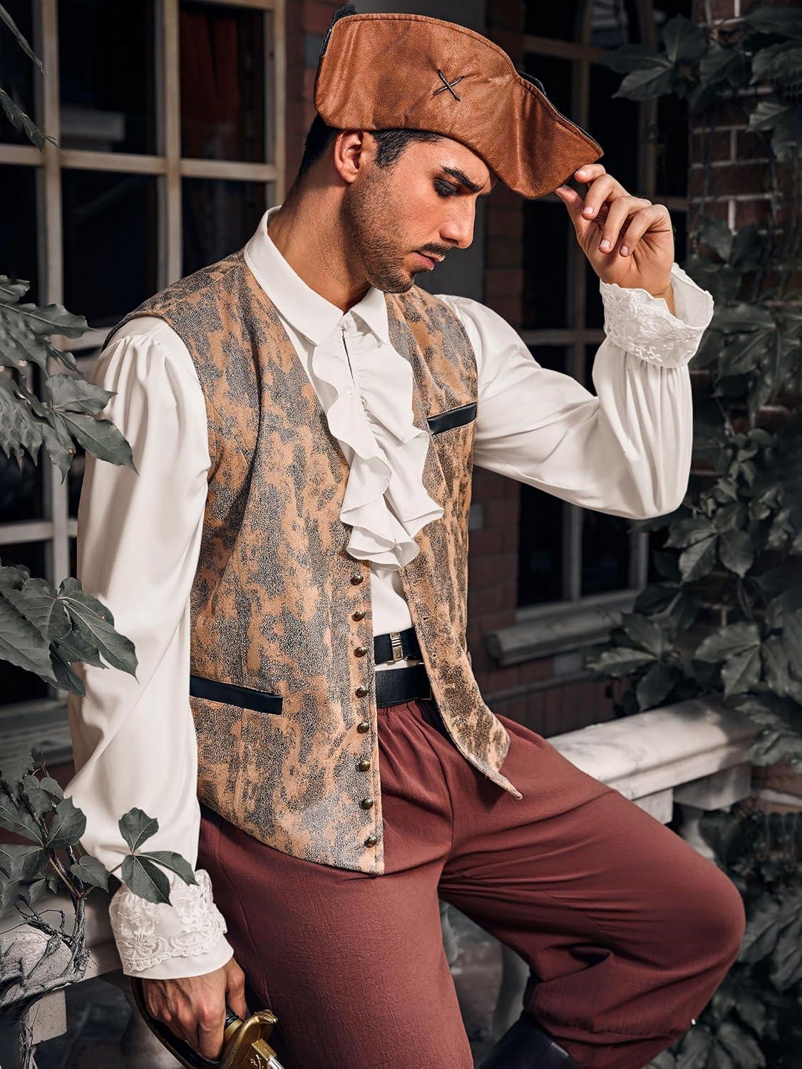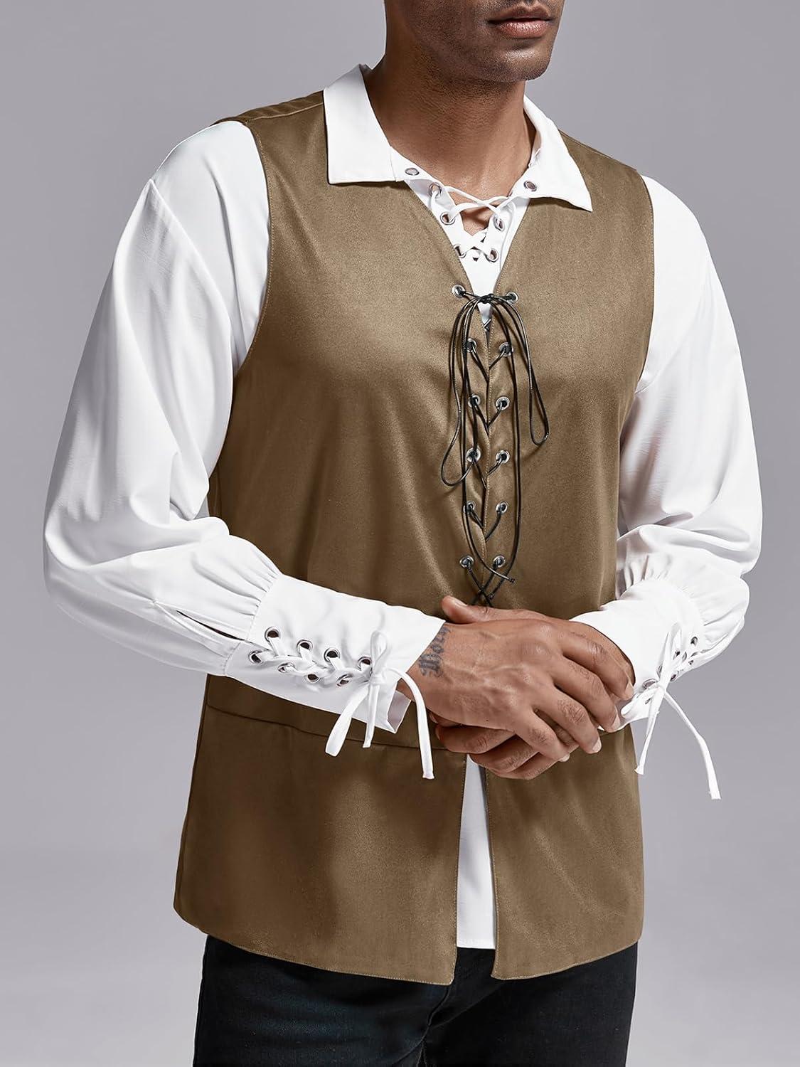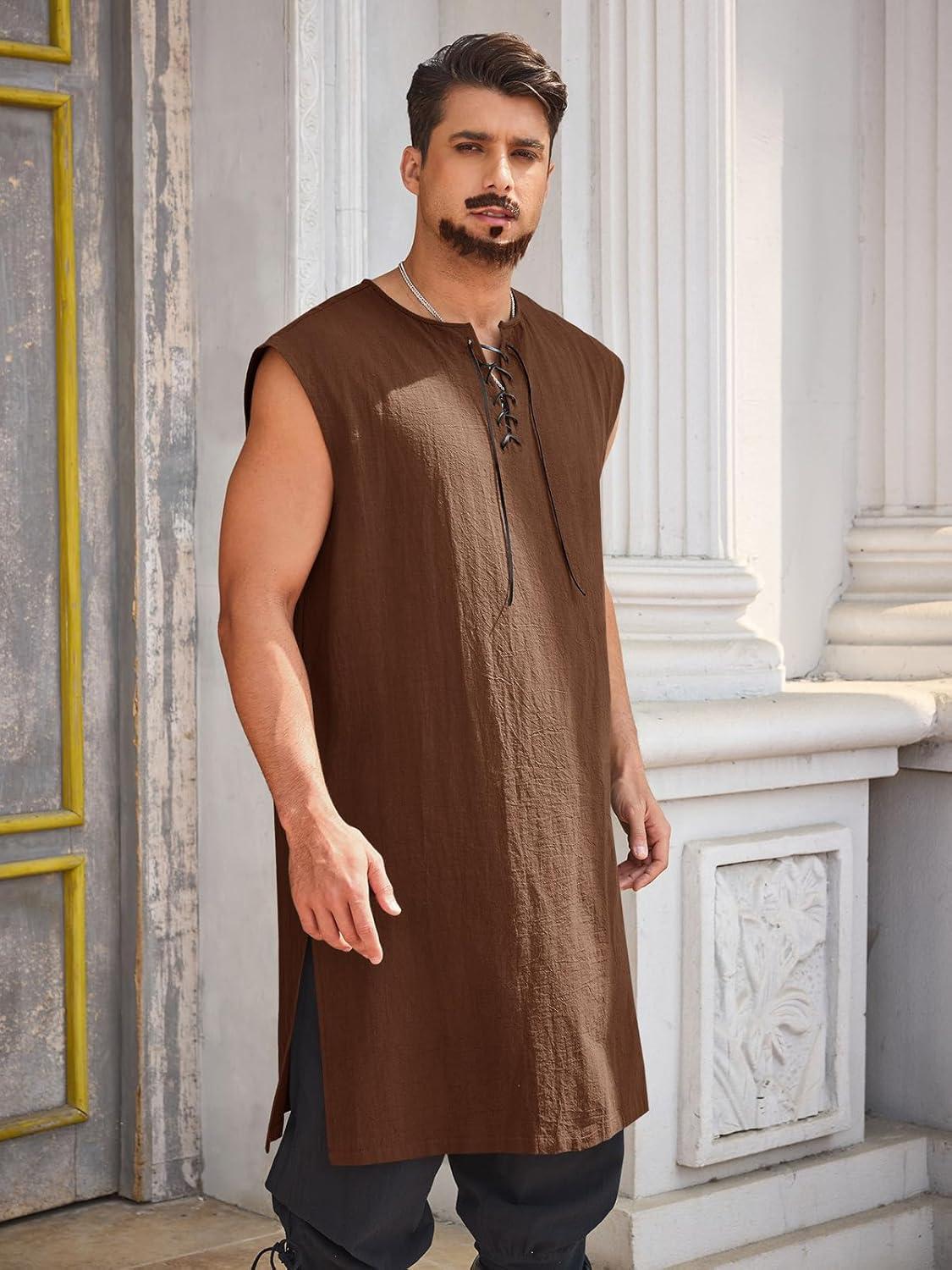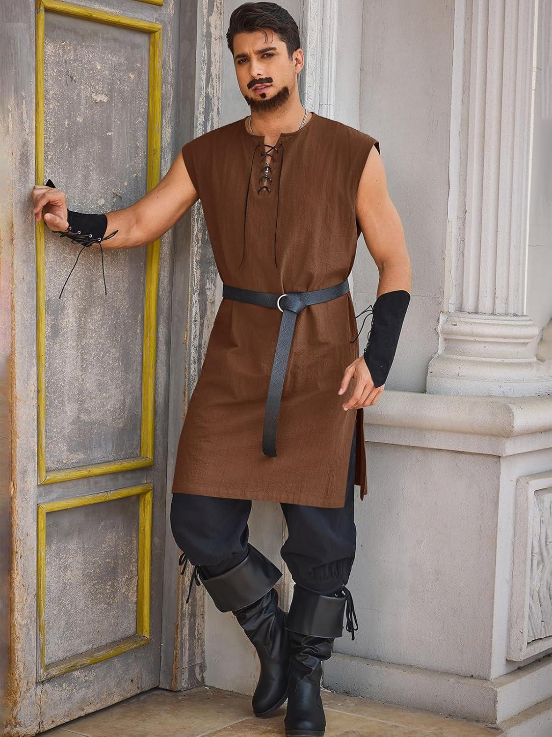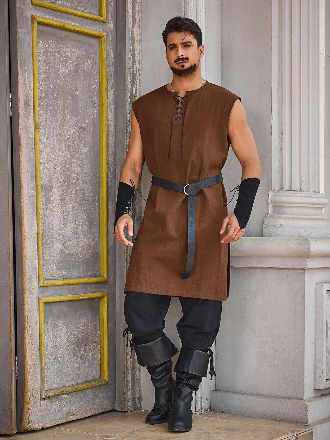 • Runcati Mens Pirate Costume Tunic Renaissance Medieval Knight Warrior Sleeveless Lace Up Shirts Viking LARP Halloween Tabard(Brown)