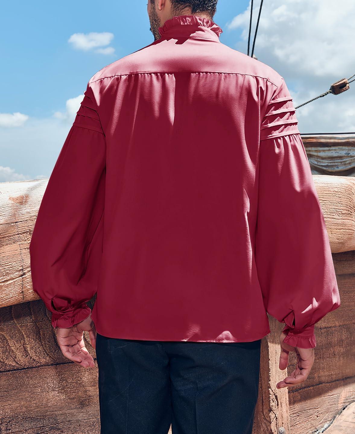 Runcati Mens Pirate Medieval Shirts Ruffle Steampunk Victorian Cosplay Costume Gothic Renaissance Shirt Viking Tops(Red)