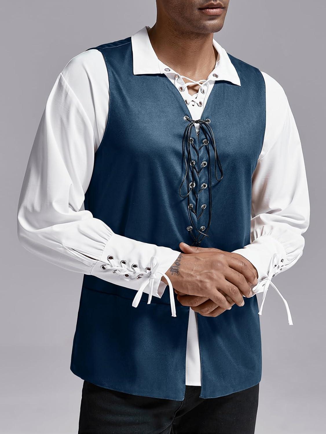 • Runcati Mens Medieval Renaissance Vest Pirate Gothic Halloween Costume Suede Lace Up Reversible Waistcoat(Blue)
