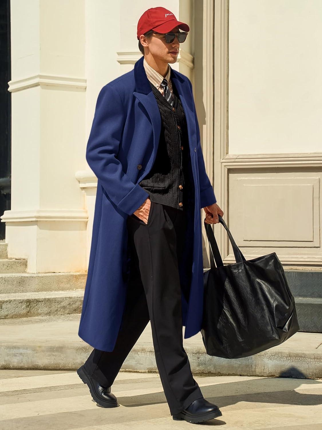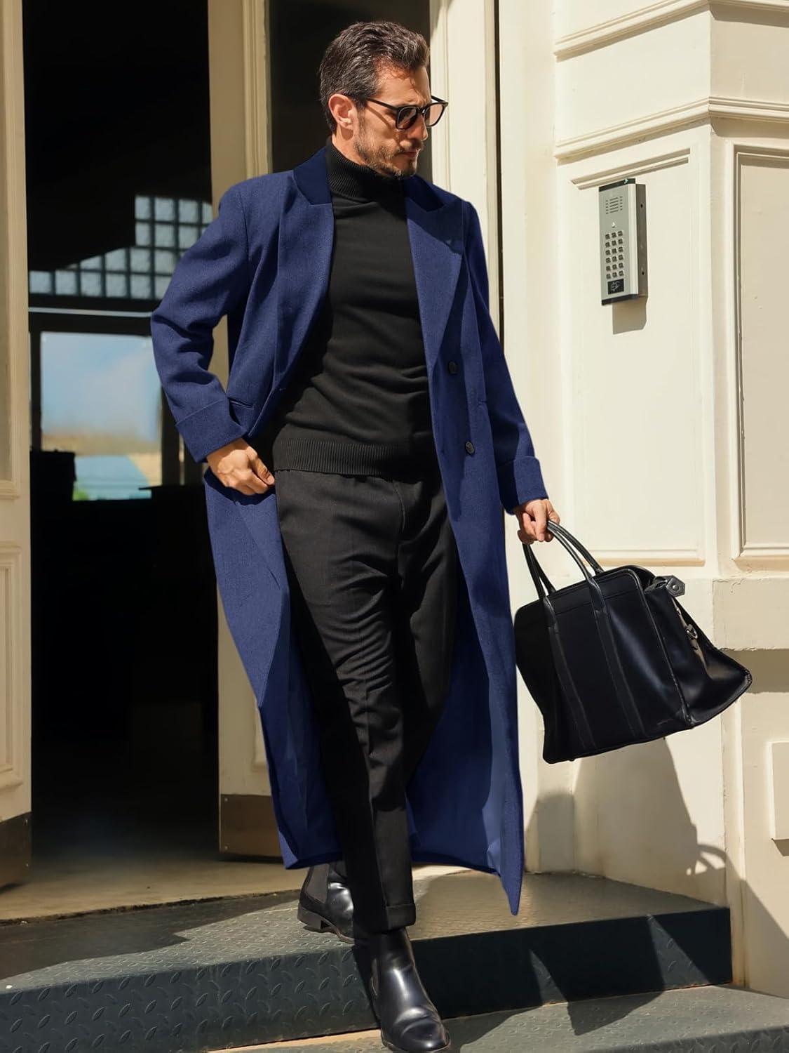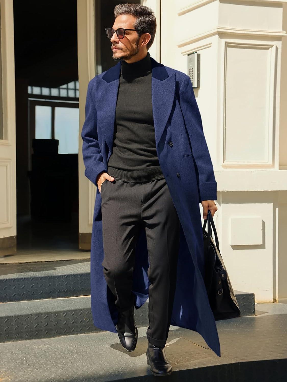 Runcati Mens Trench Coat Notch Lapel Slim Fit Double Breasted Long Pea Coat Winter Warm Overcoat(Navy)