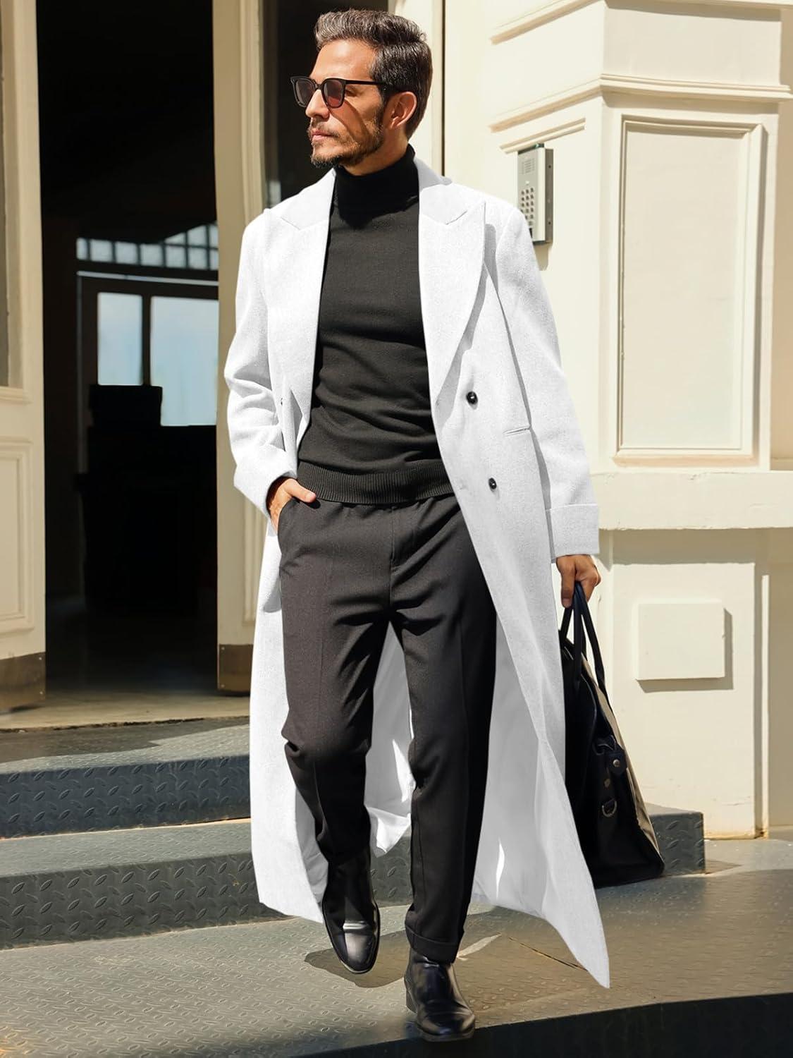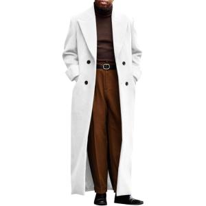 Runcati Mens Full Length Trench Coat Notched Lapel Long Jacket Double Breasted Classic Winter Overcoat(White)