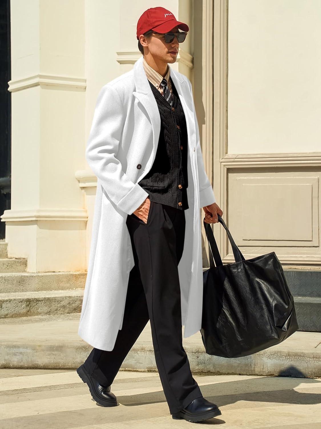 Runcati Mens Trench Coat Notch Lapel Slim Fit Double Breasted Long Pea Coat Winter Warm Overcoat(White)