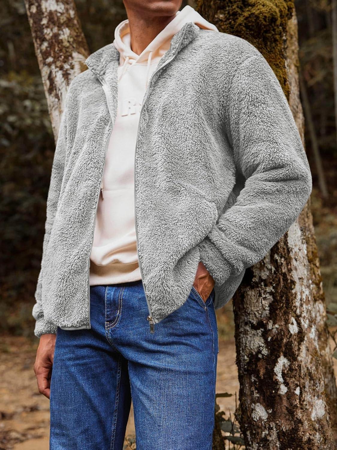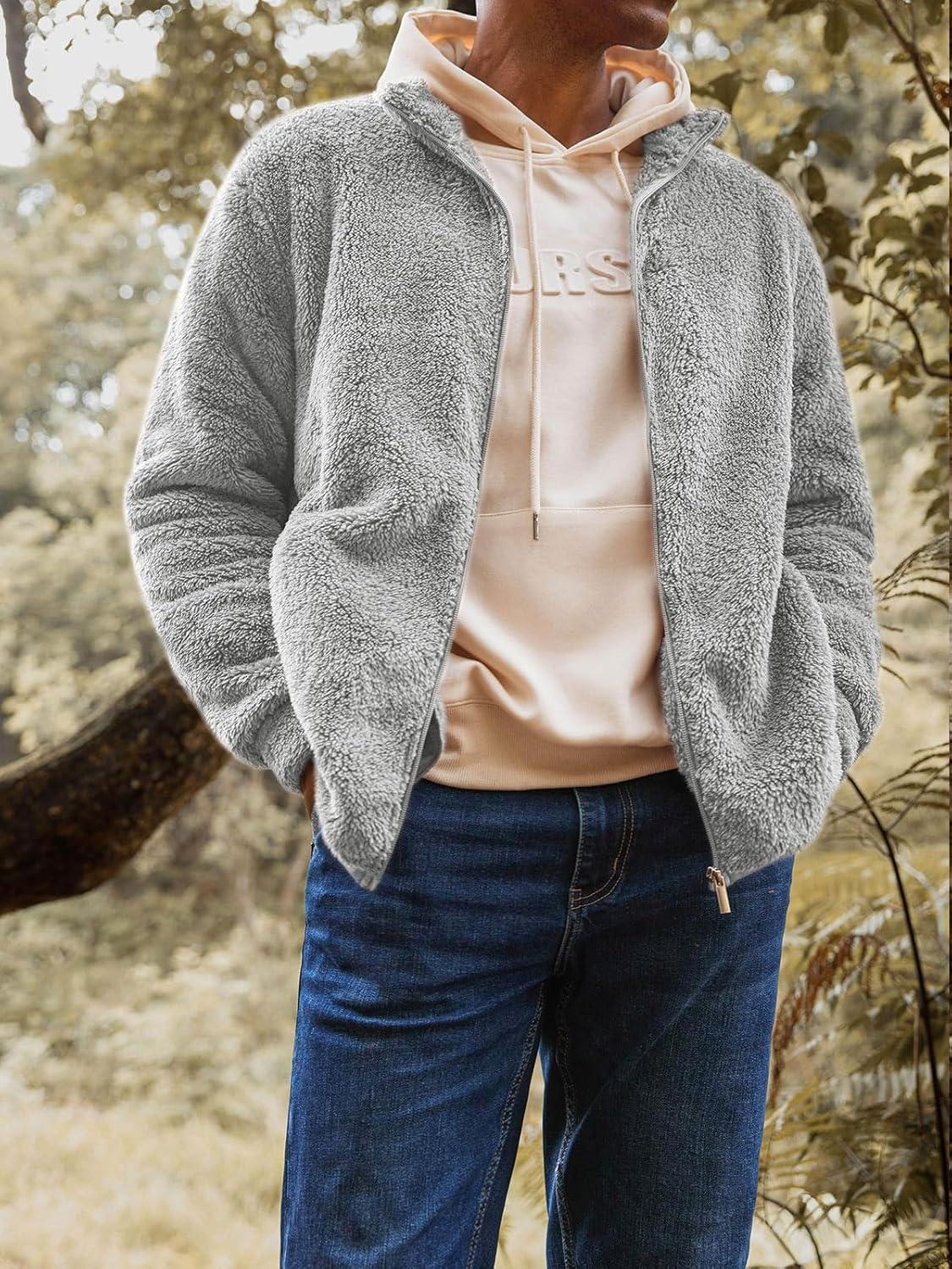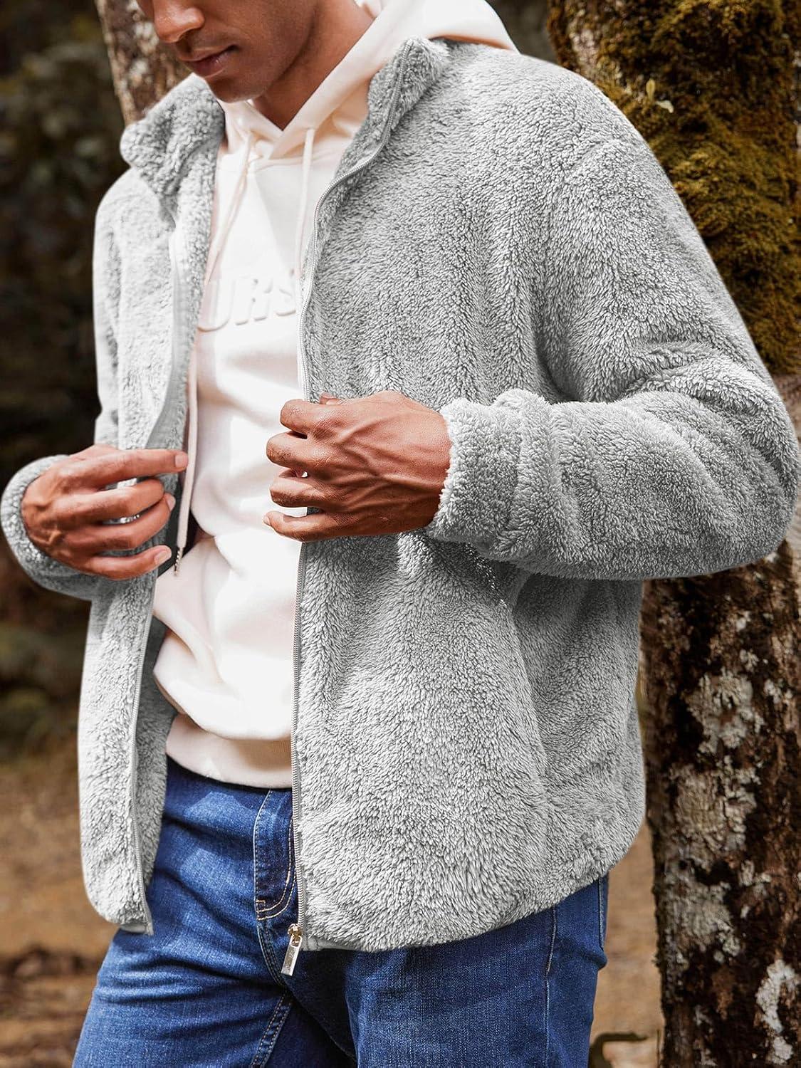 Runcati Mens Fuzzy Sherpa Jacket Cardigan Fleece Long Sleeve Full Zip Open Front Thermal Coat Fall Winter Outwear(Grey)