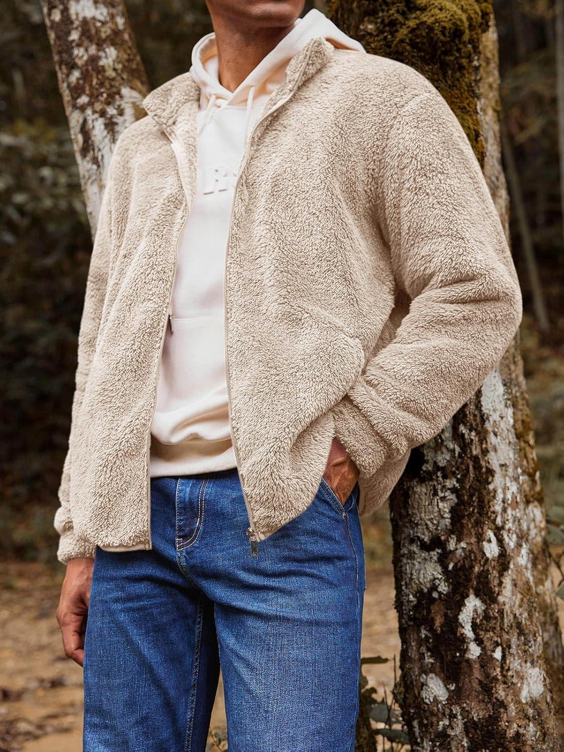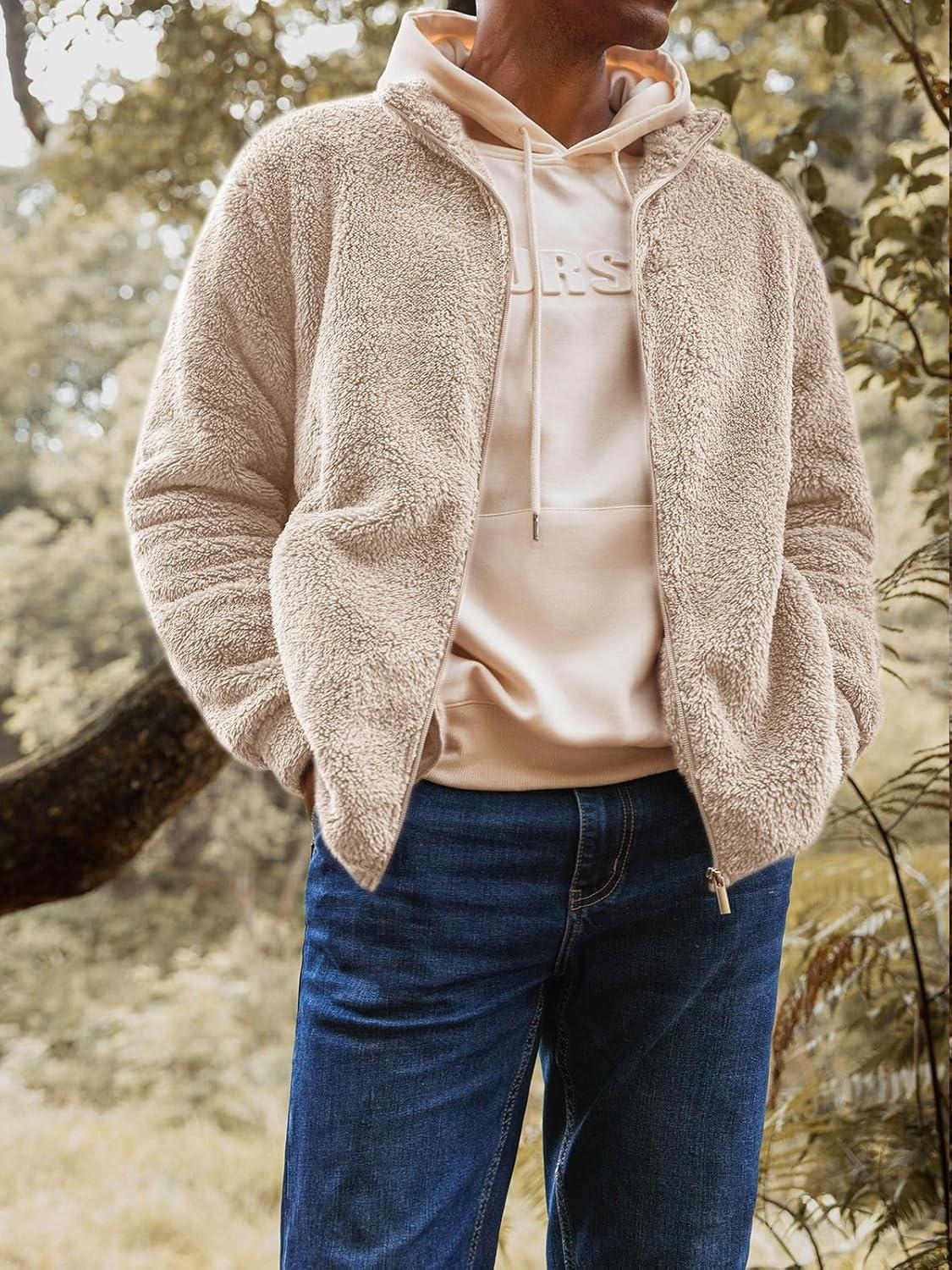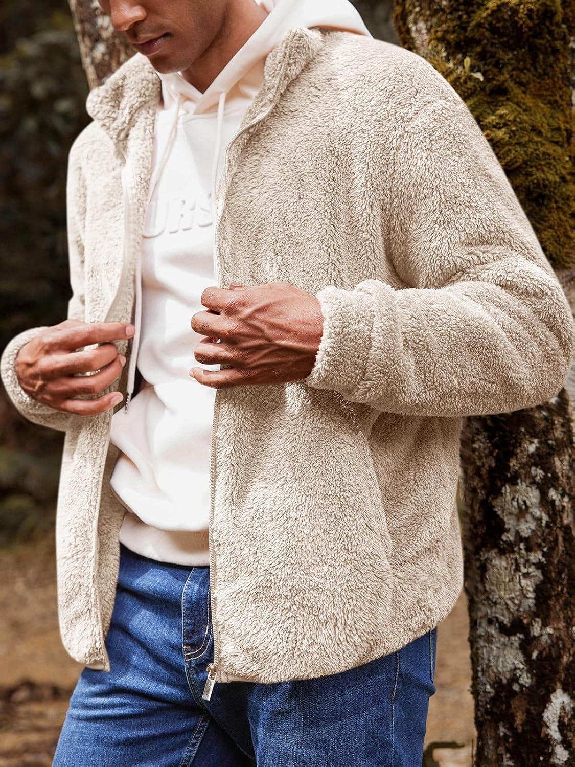 Runcati Mens Fuzzy Sherpa Jacket Cardigan Fleece Long Sleeve Full Zip Open Front Thermal Coat Fall Winter Outwear(Khaki)