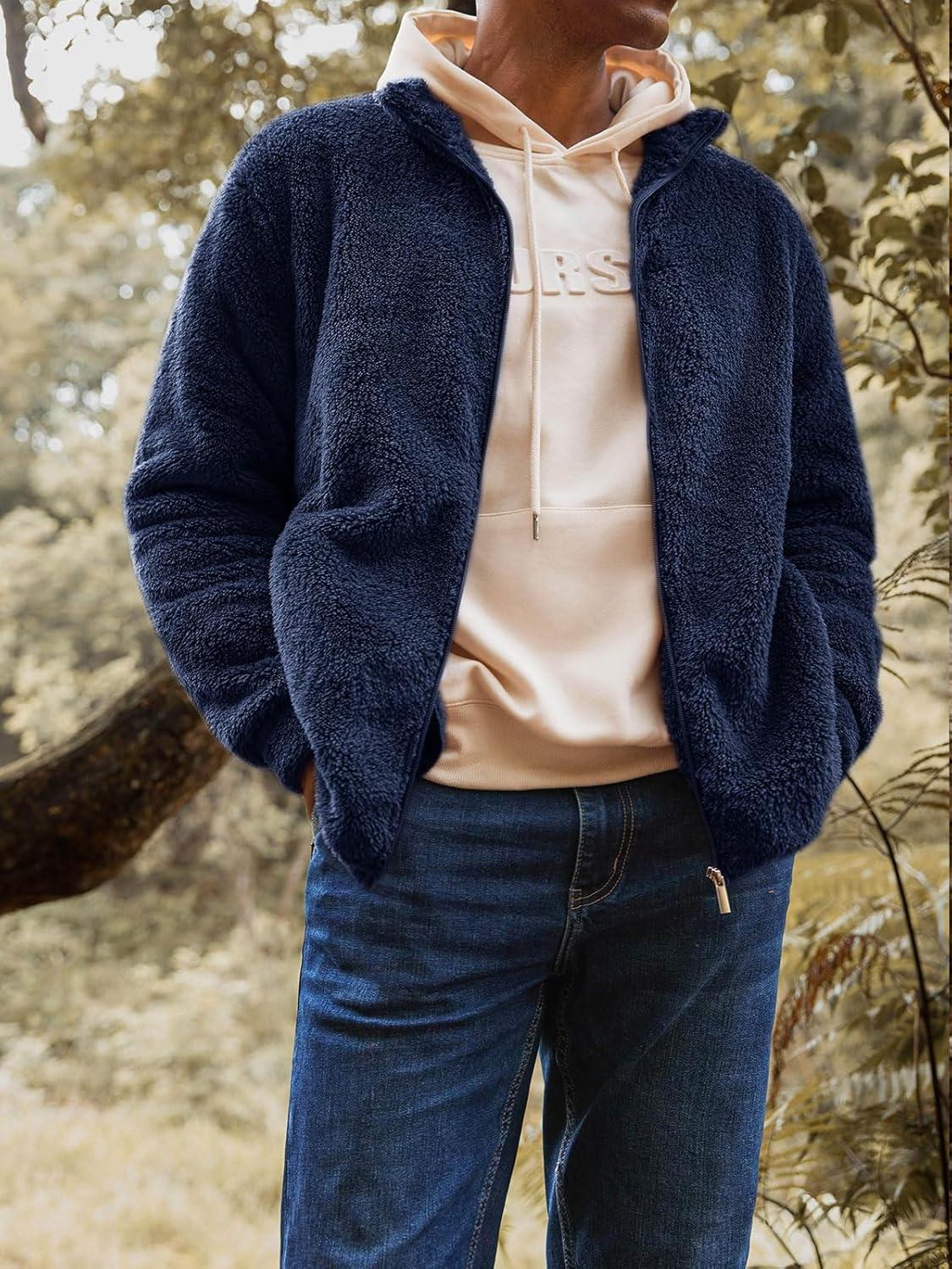 Runcati Mens Fuzzy Sherpa Jacket Cardigan Fleece Long Sleeve Full Zip Open Front Thermal Coat Fall Winter Outwear(Navy)