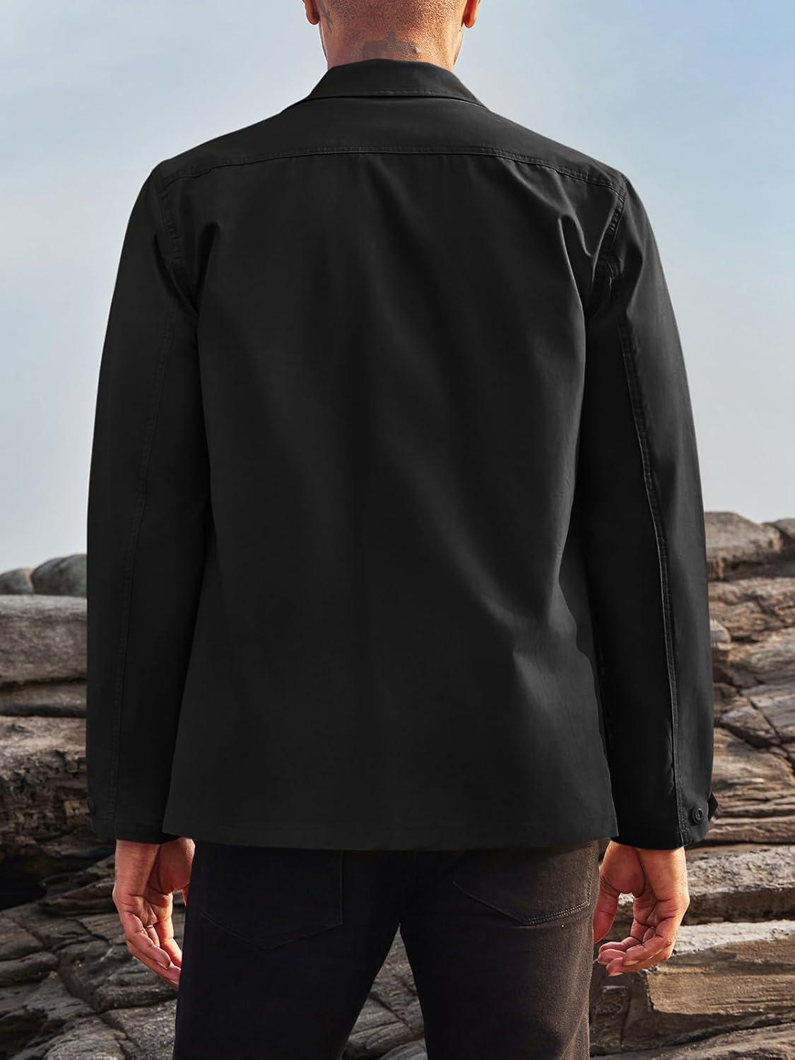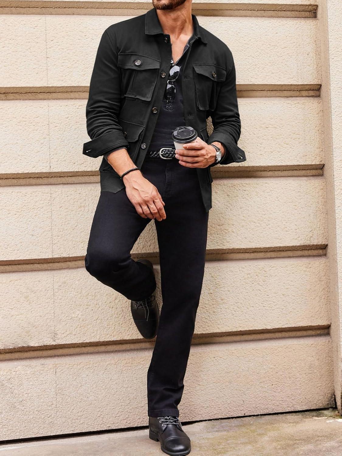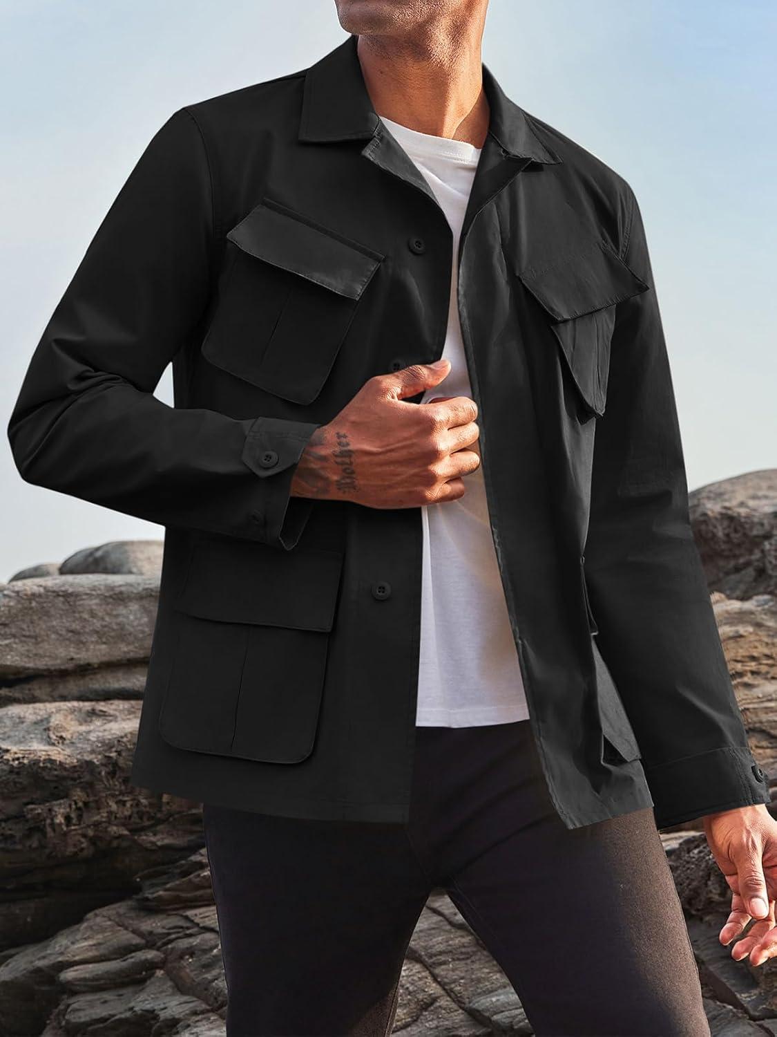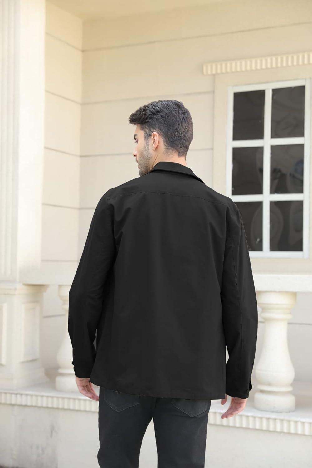 Runcati Mens Lightweight Safari Jacket Casual Button Up Jacket Windproof Work Coat with Pockets(Black)