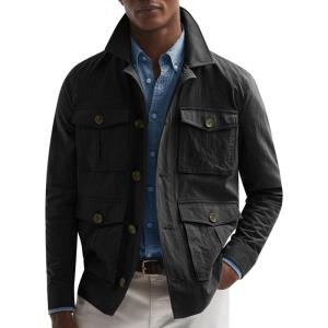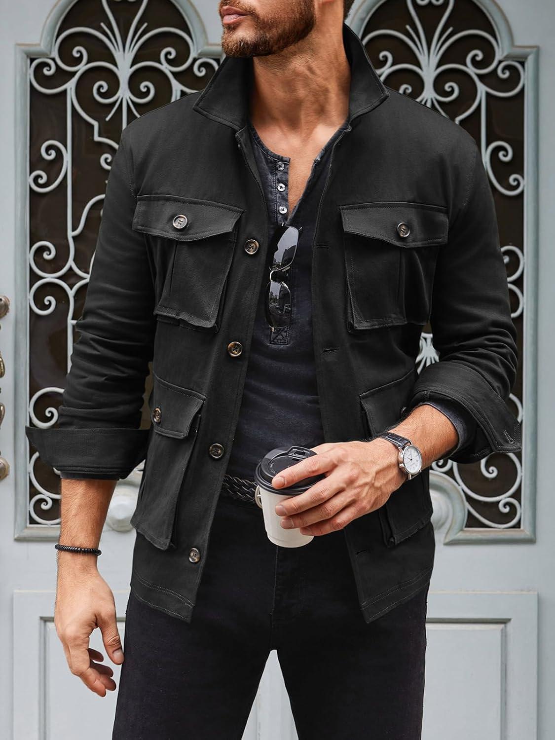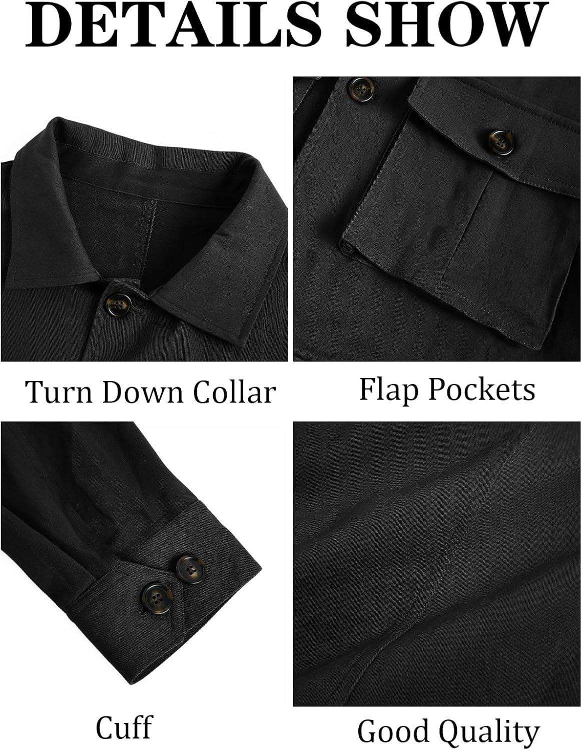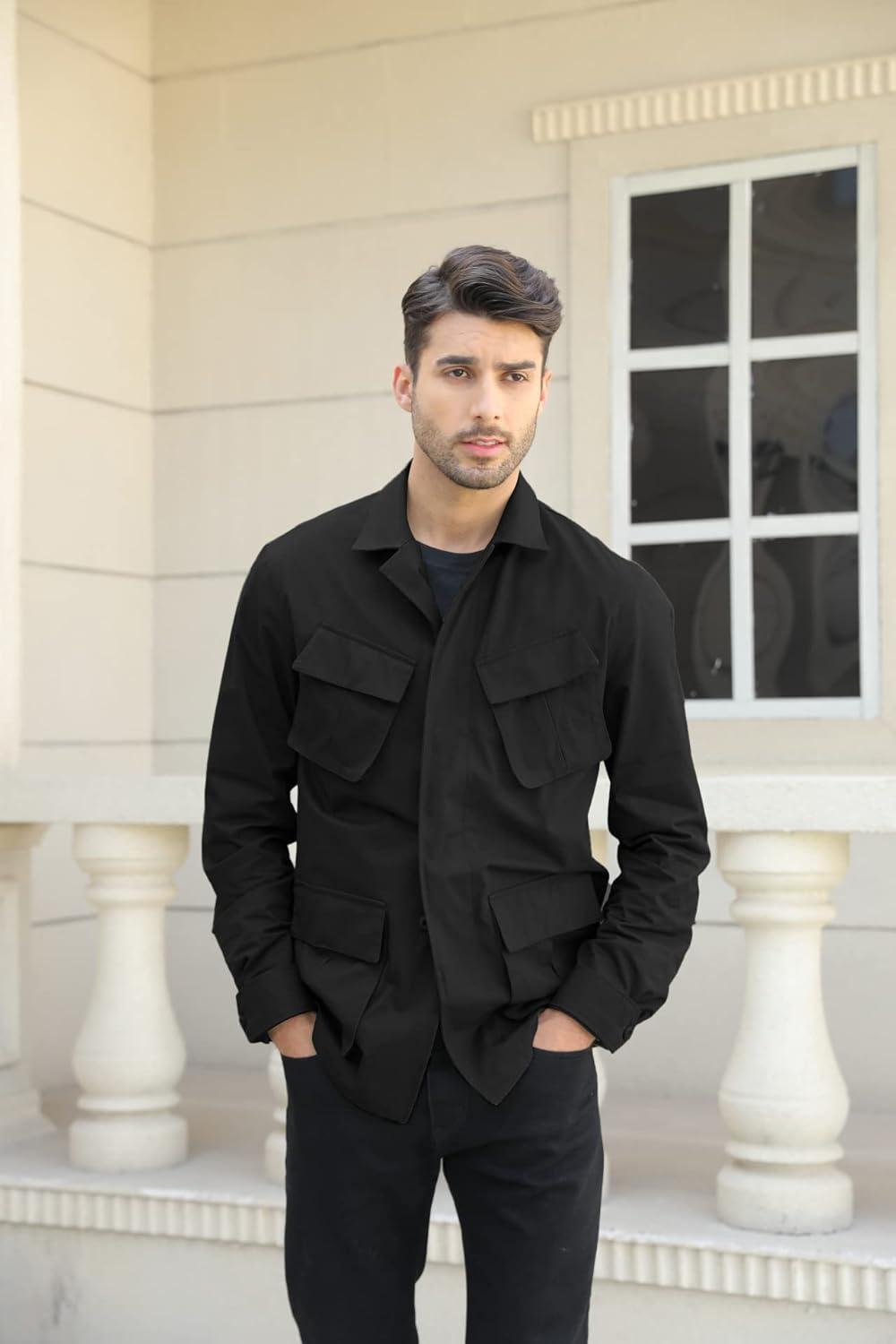 Runcati Mens Lightweight Safari Jacket Button Up Cotton Outdoor Military Cargo Long Sleeve Outwear(Black)