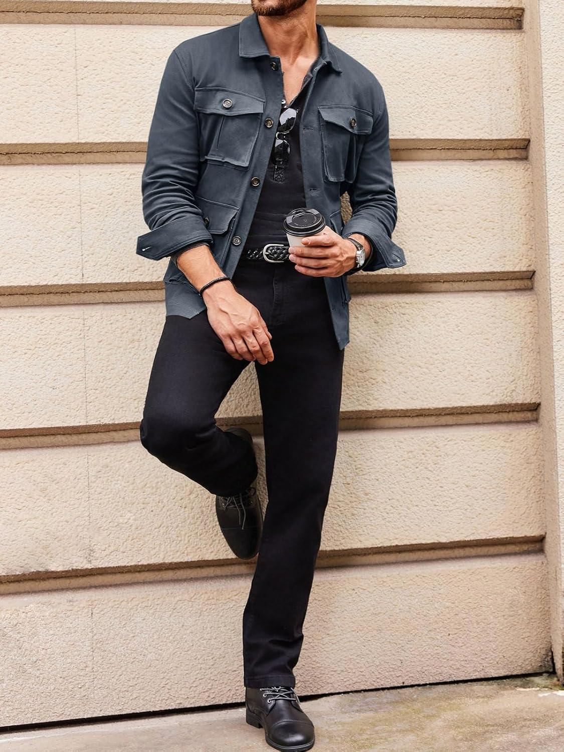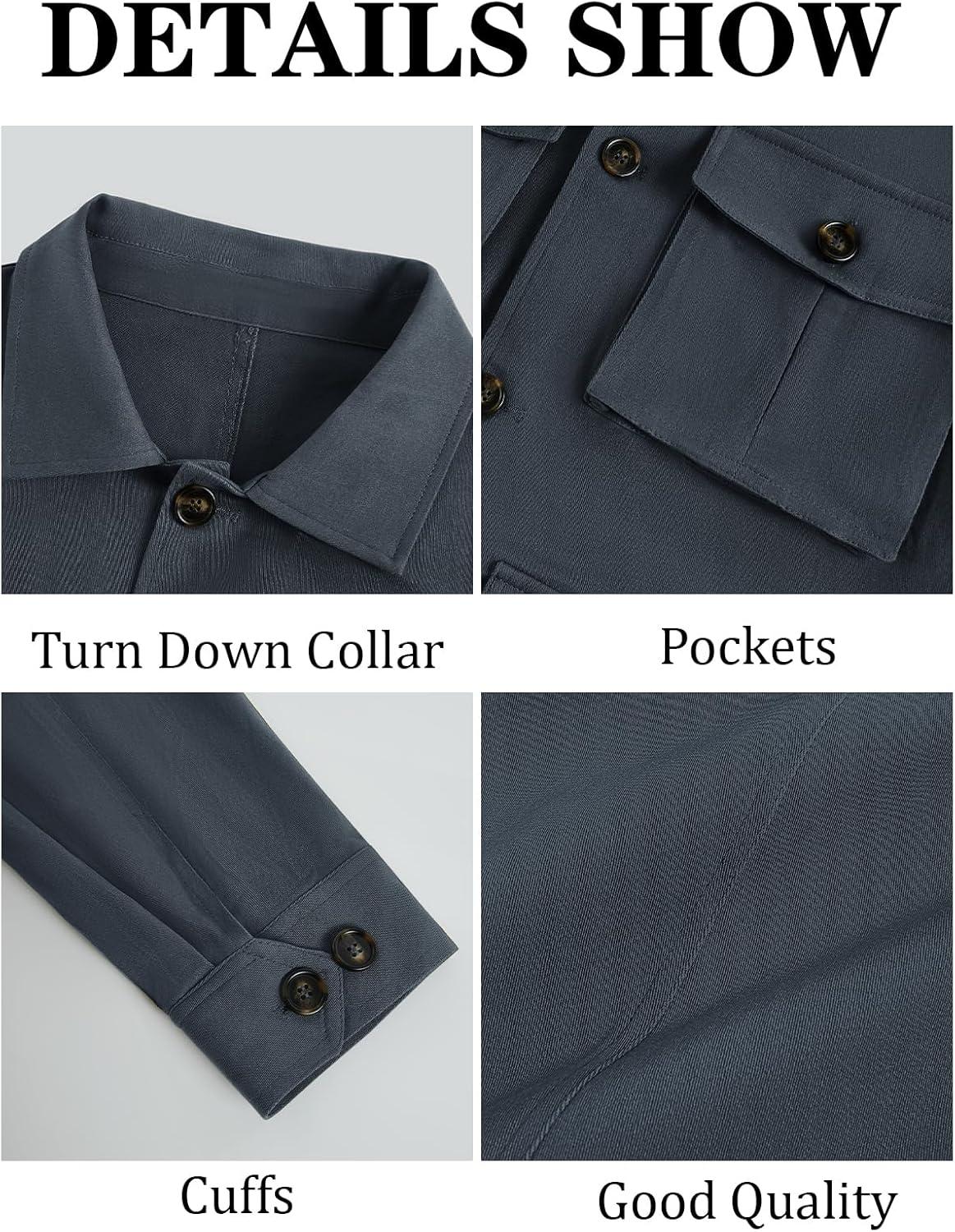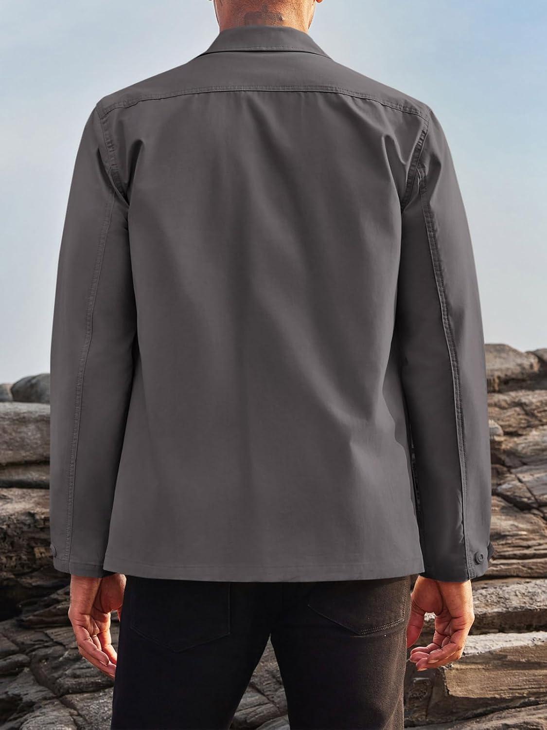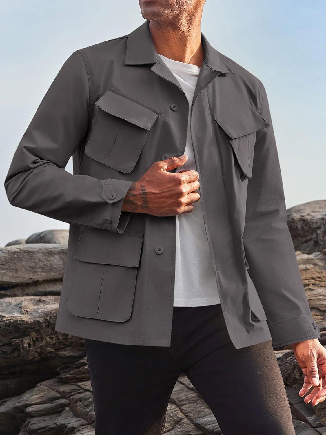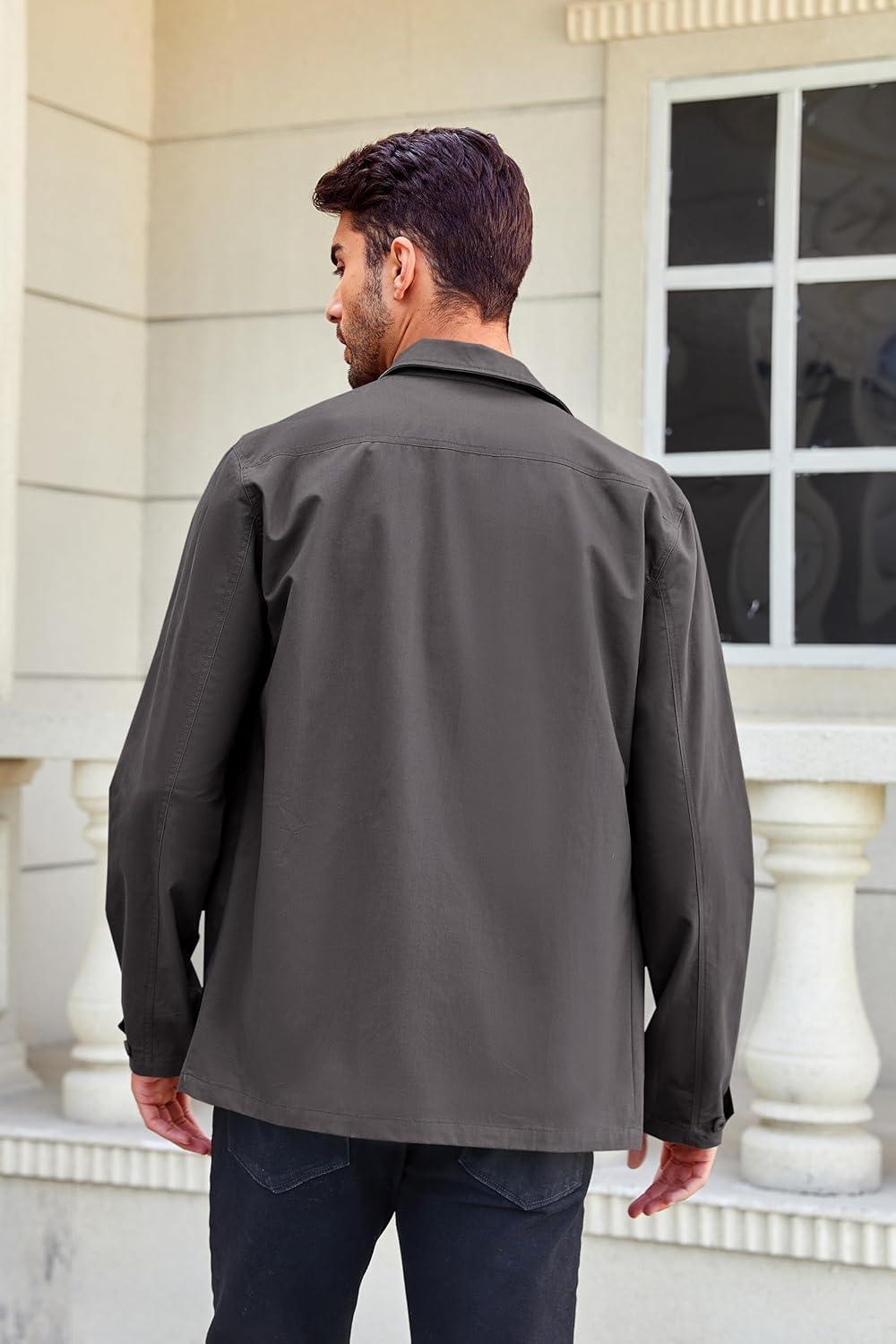 Runcati Mens Lightweight Safari Jacket Casual Button Up Jacket Windproof Work Coat with Pockets(Dark Grey)