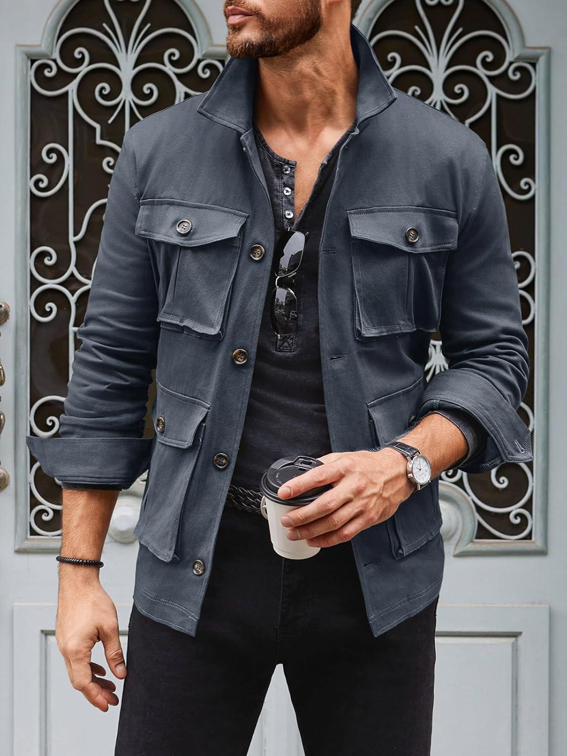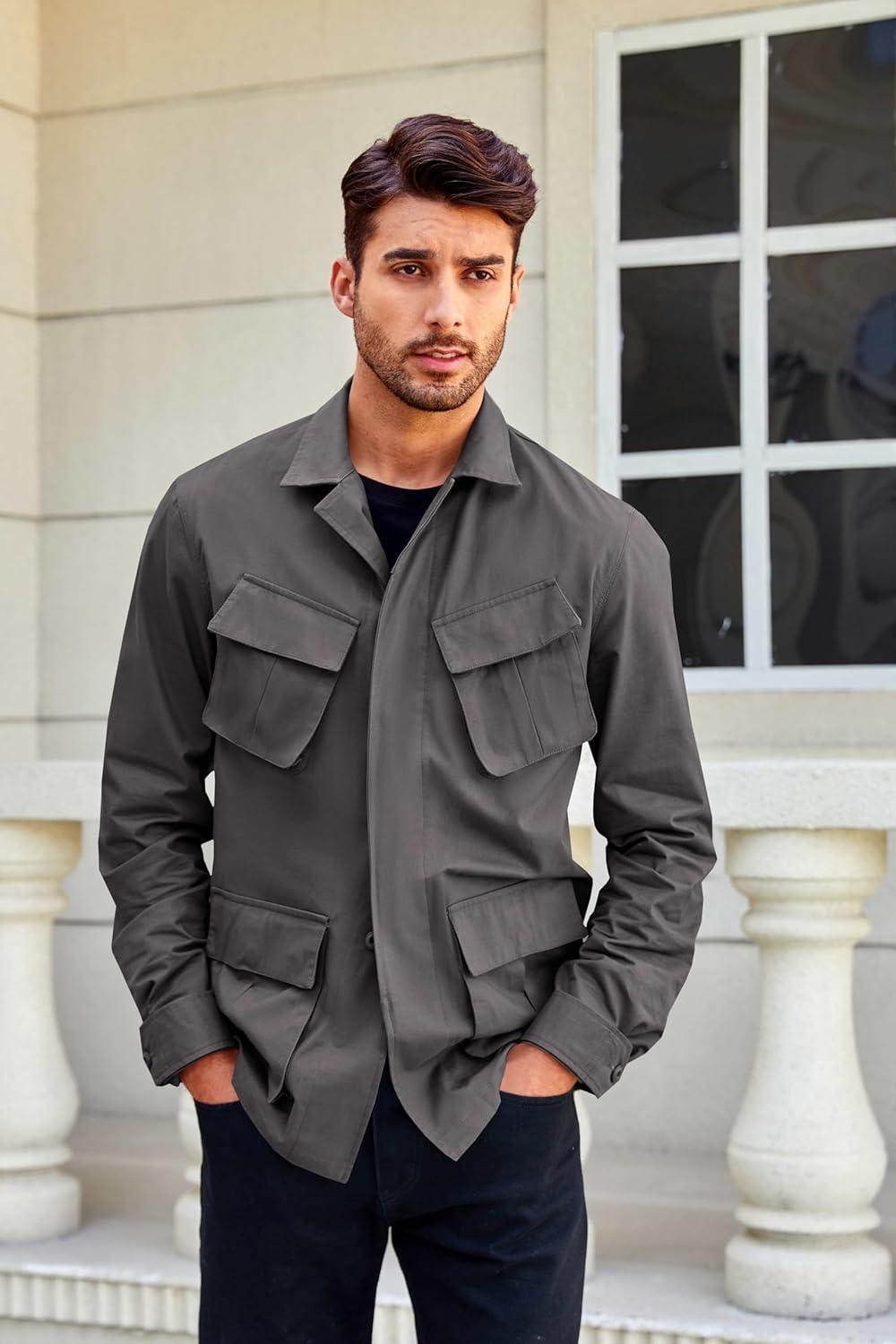 Runcati Mens Lightweight Safari Jacket Button Up Cotton Outdoor Military Cargo Long Sleeve Outwear(Grey)