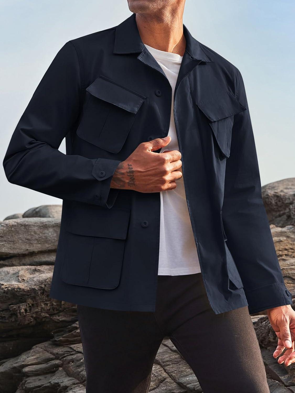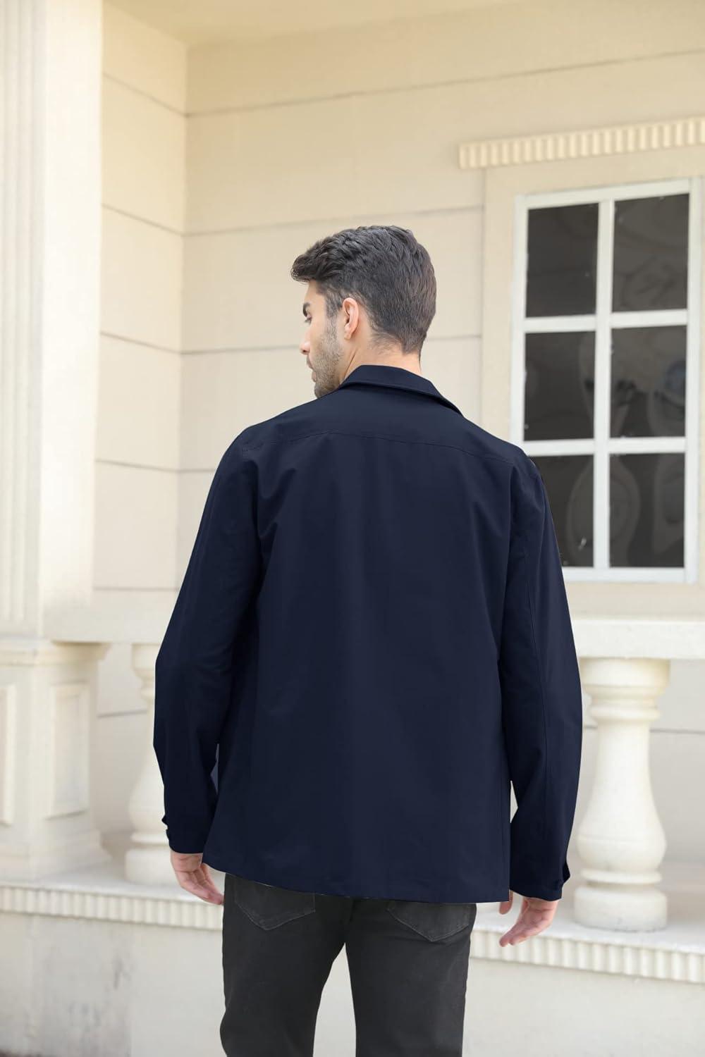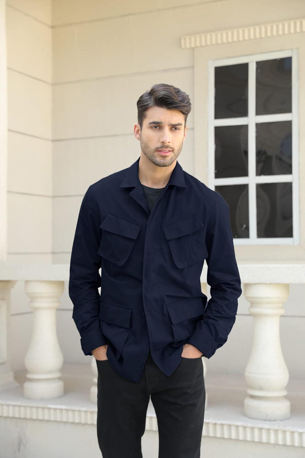 Runcati Mens Lightweight Safari Jacket Casual Button Up Jacket Windproof Work Coat with Pockets(Navy Blue)