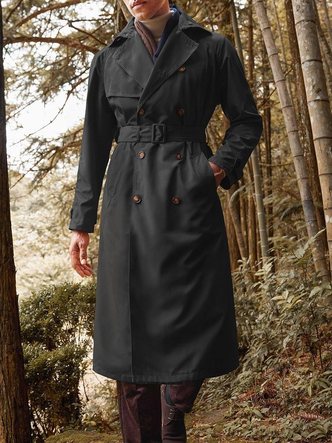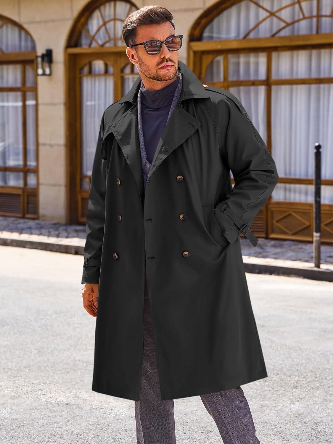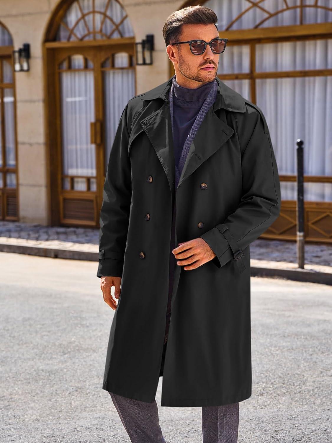 Runcati Mens Full Length Trench Coat Notched Lapel Long Jacket Double Breasted Classic Winter Overcoat(Black)