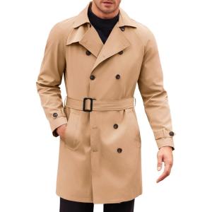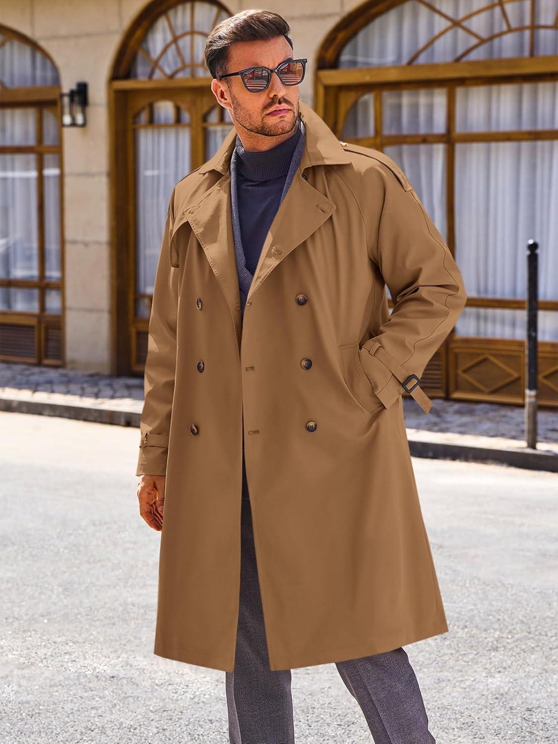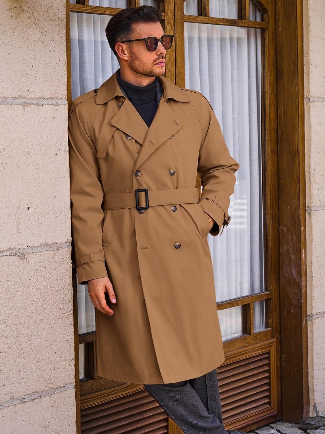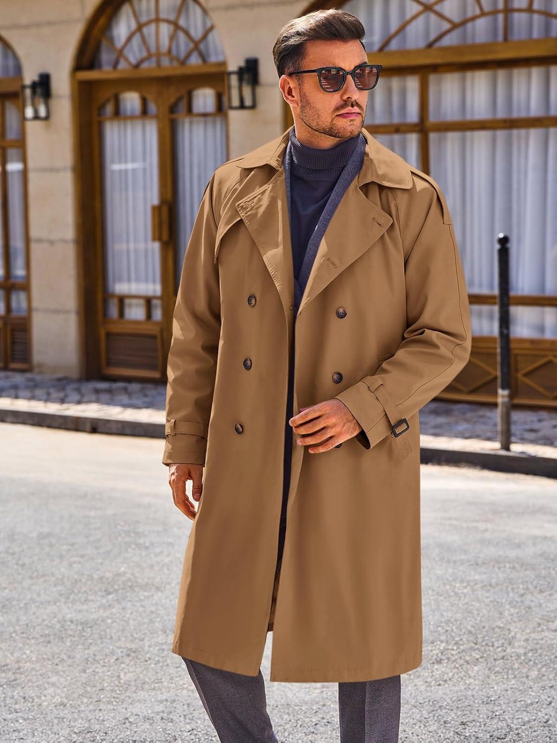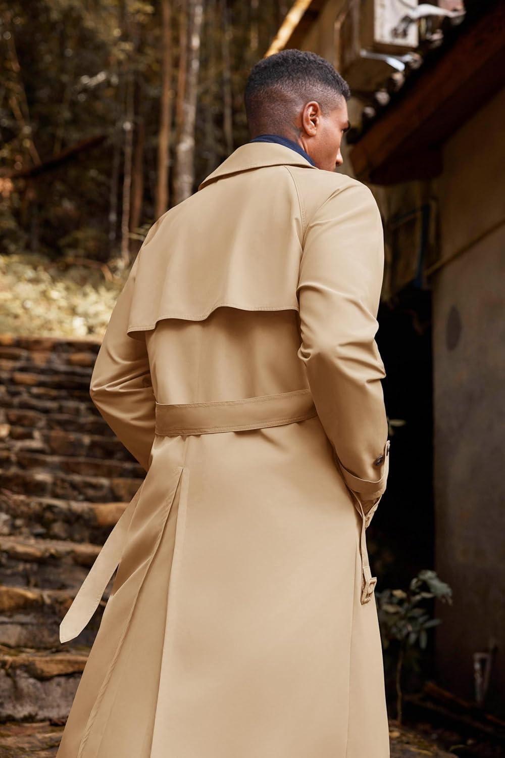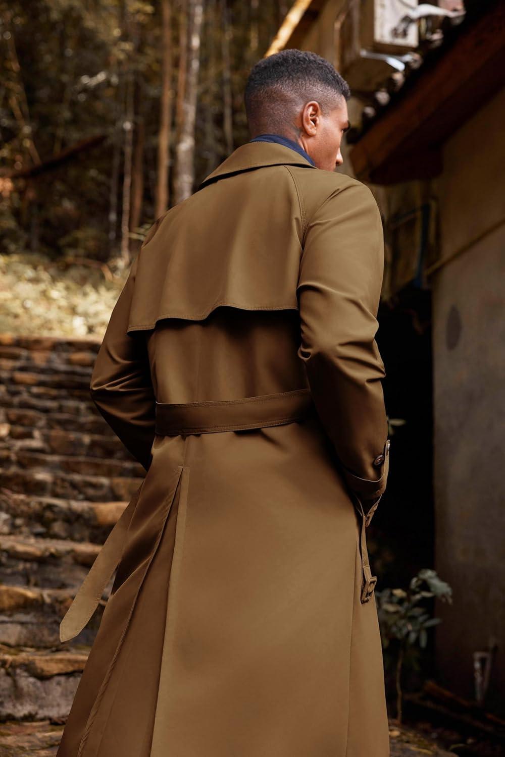 Runcati Mens Trench Coat Double Breasted Long Jacket Casual Windbreaker Notched Lapel Belted Overcoat(Khaki)