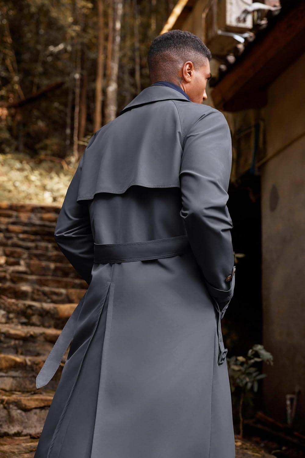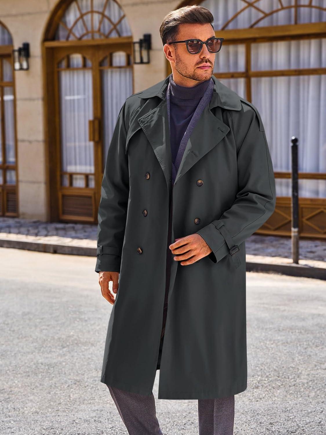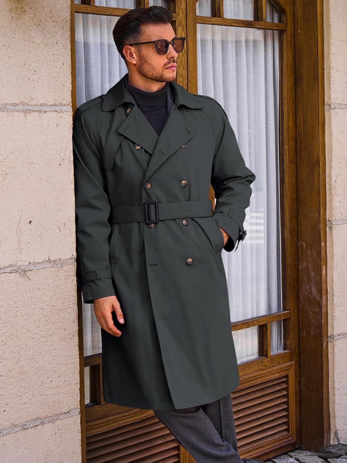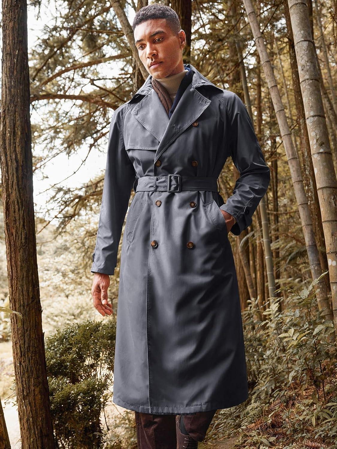 Runcati Mens Trench Coat Double Breasted Long Jacket Casual Windbreaker Notched Lapel Belted Overcoat(Dark Grey)