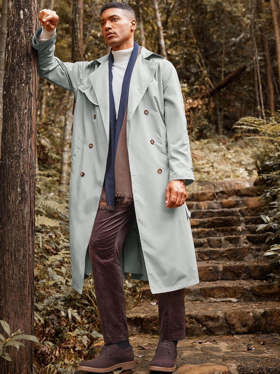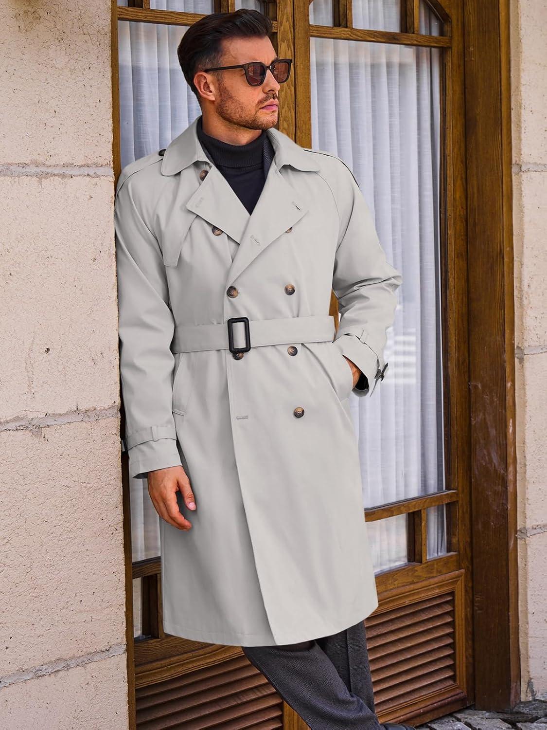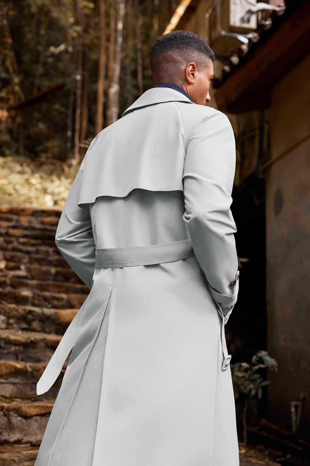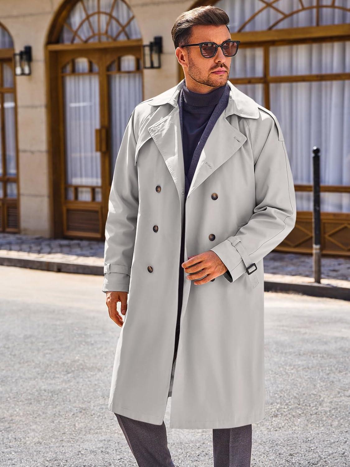 Runcati Mens Trench Coat Double Breasted Long Jacket Casual Windbreaker Notched Lapel Belted Overcoat(Grey)