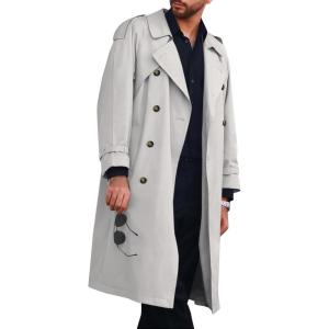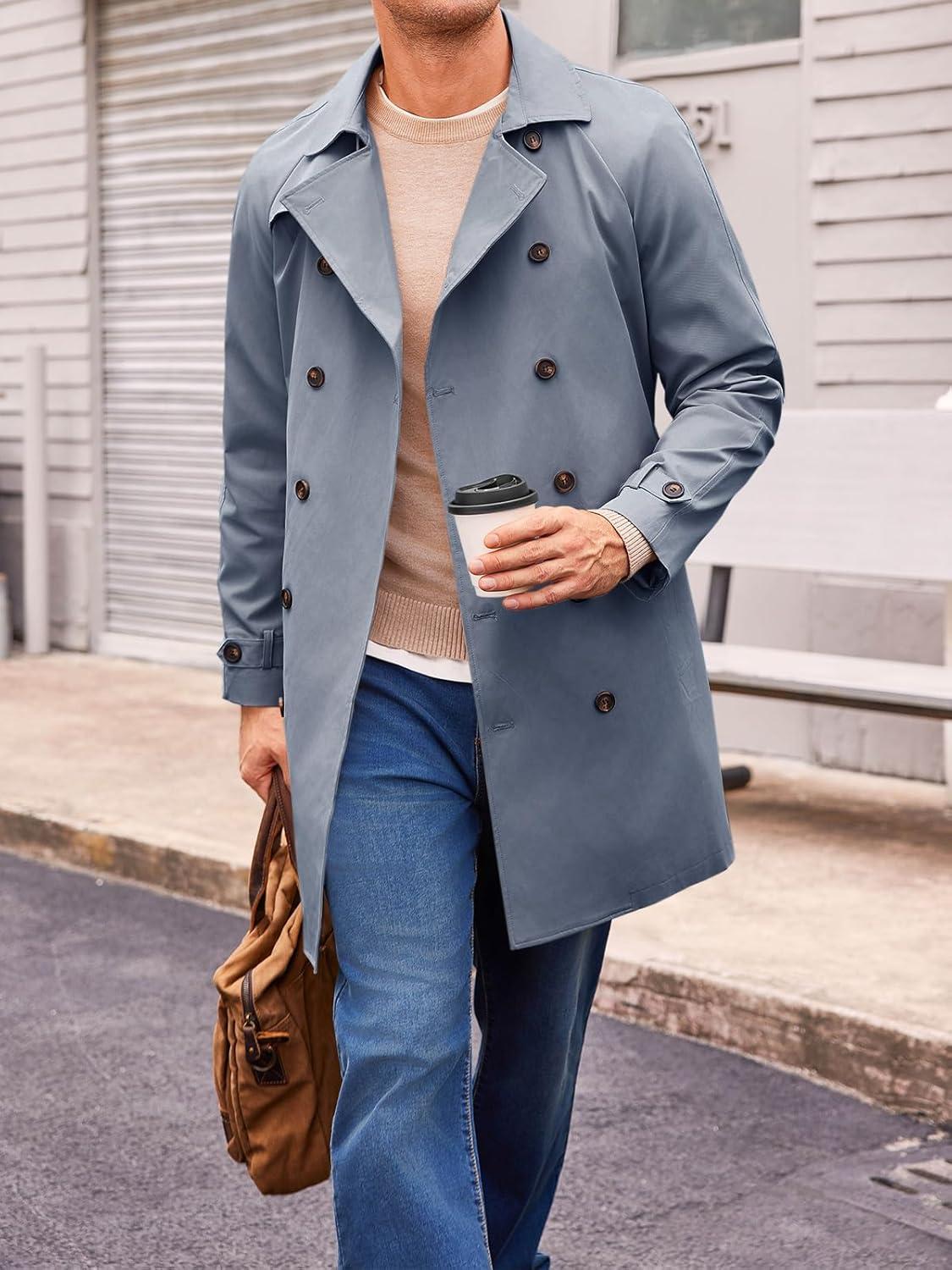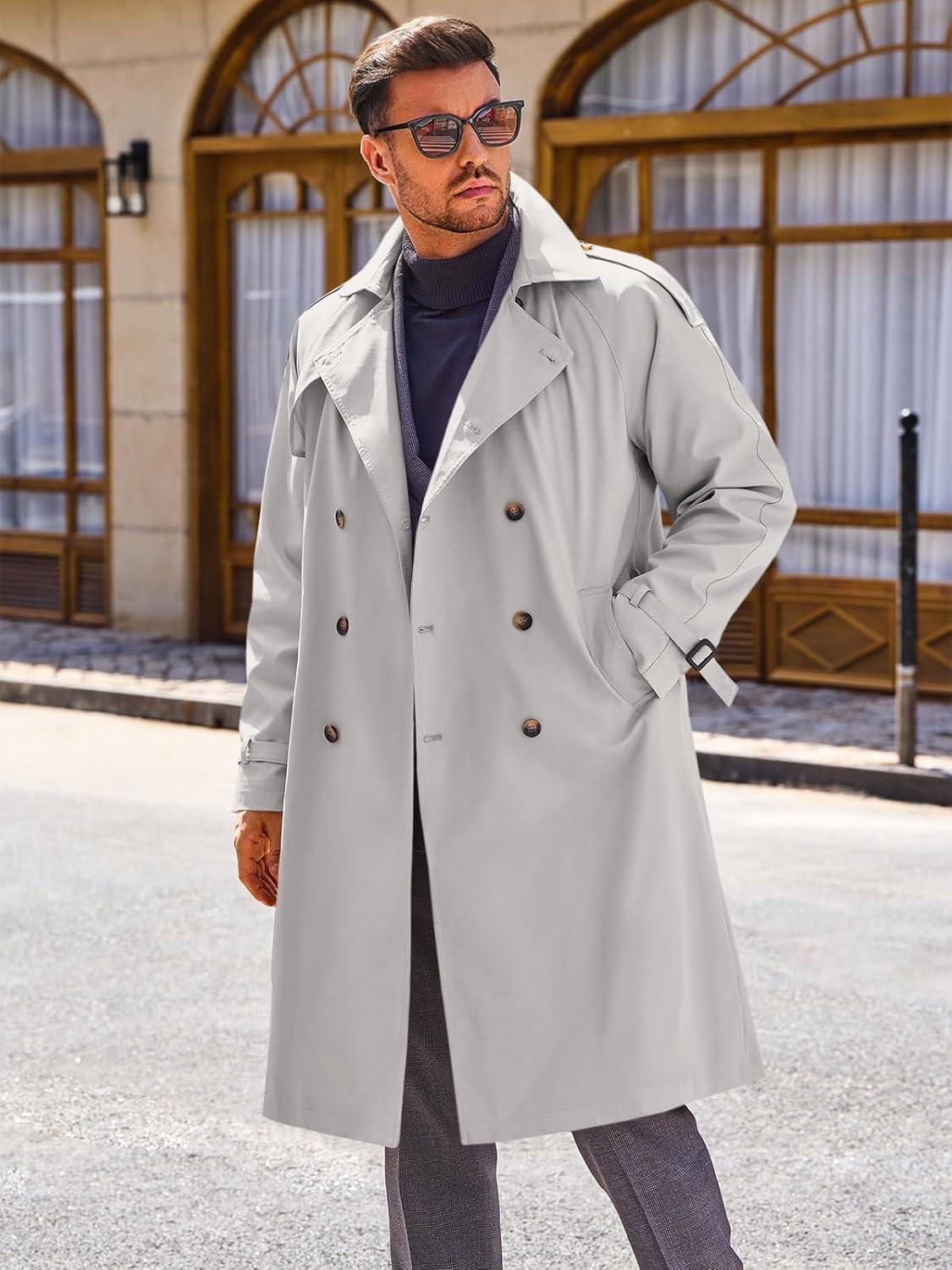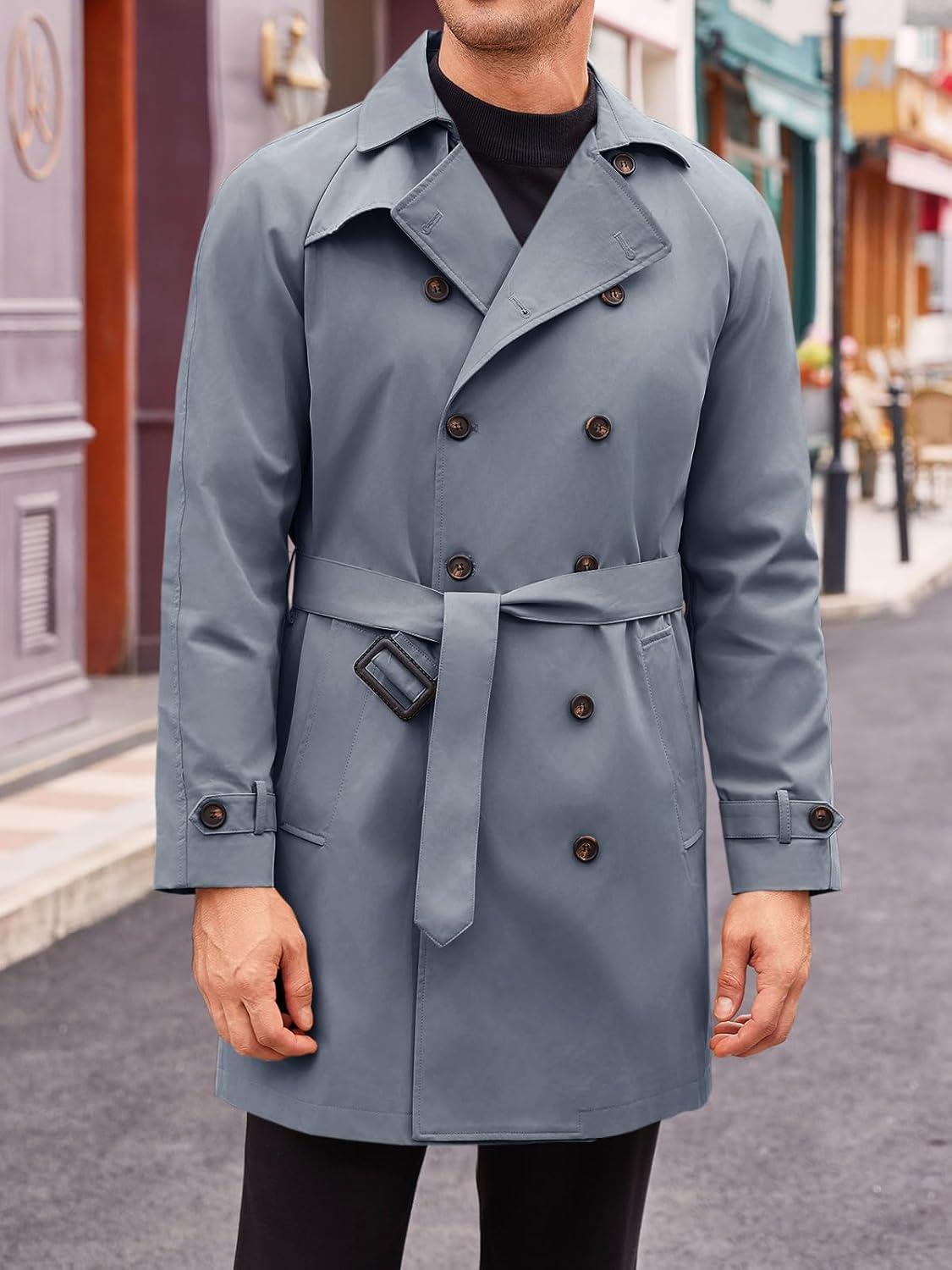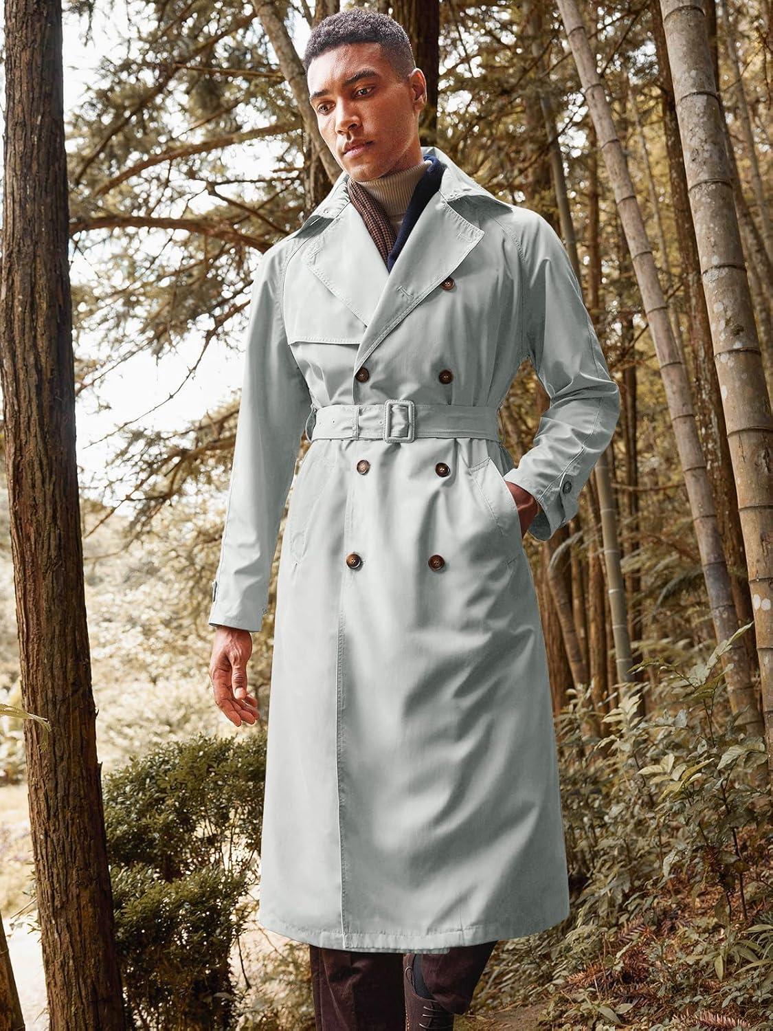 Runcati Mens Trench Coat Double Breasted Long Jacket Casual Windbreaker Notched Lapel Belted Overcoat(Grey)
