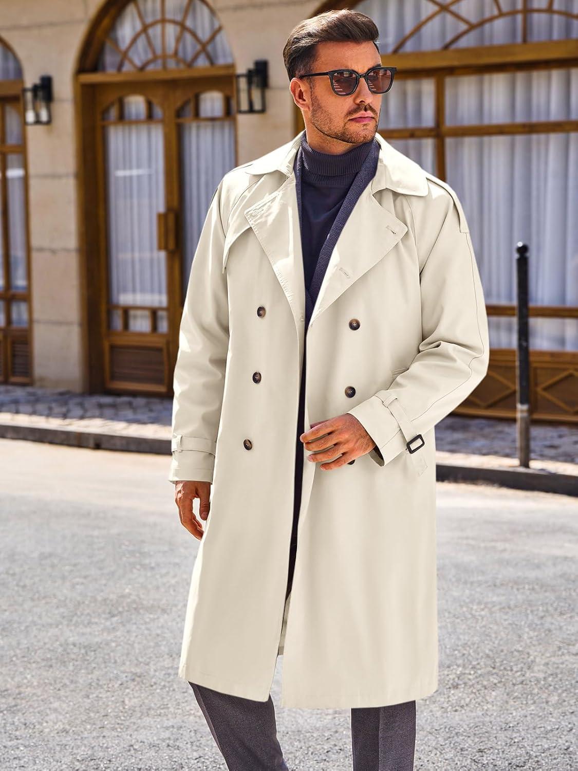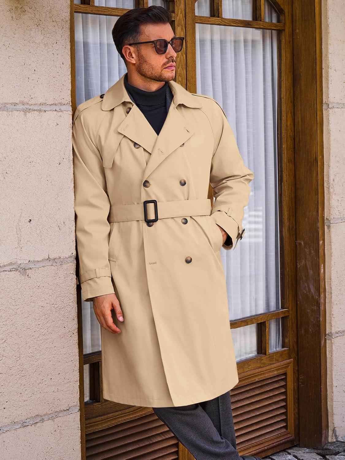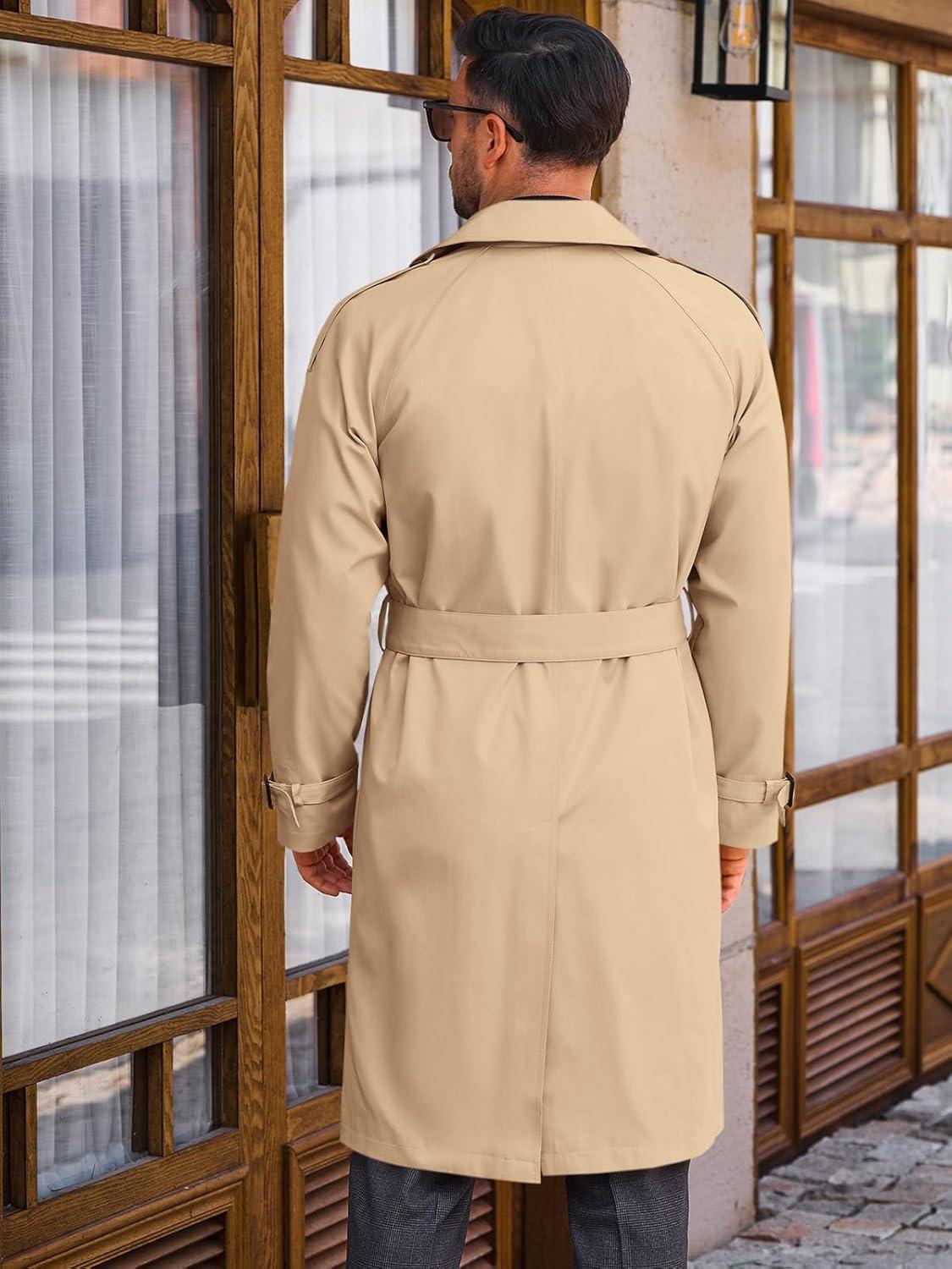 Runcati Mens Trench Coat Double Breasted Long Jacket Casual Windbreaker Notched Lapel Belted Overcoat(Beige)
