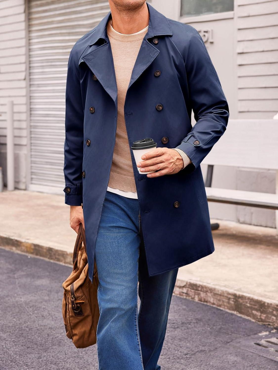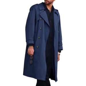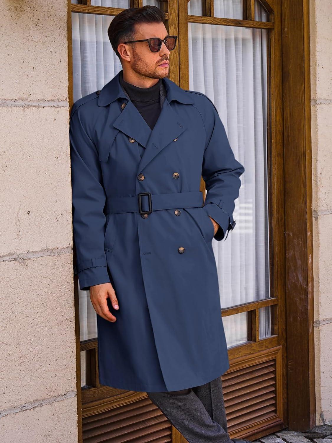 Runcati Mens Trench Coat Double Breasted Long Jacket Casual Windbreaker Notched Lapel Belted Overcoat(Navy Blue)