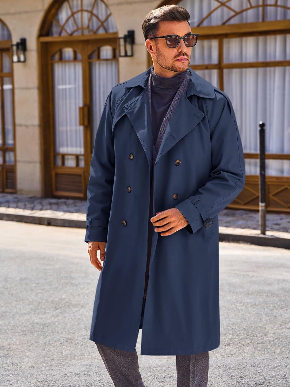Runcati Mens Full Length Trench Coat Notched Lapel Long Jacket Double Breasted Classic Winter Overcoat(Navy Blue)