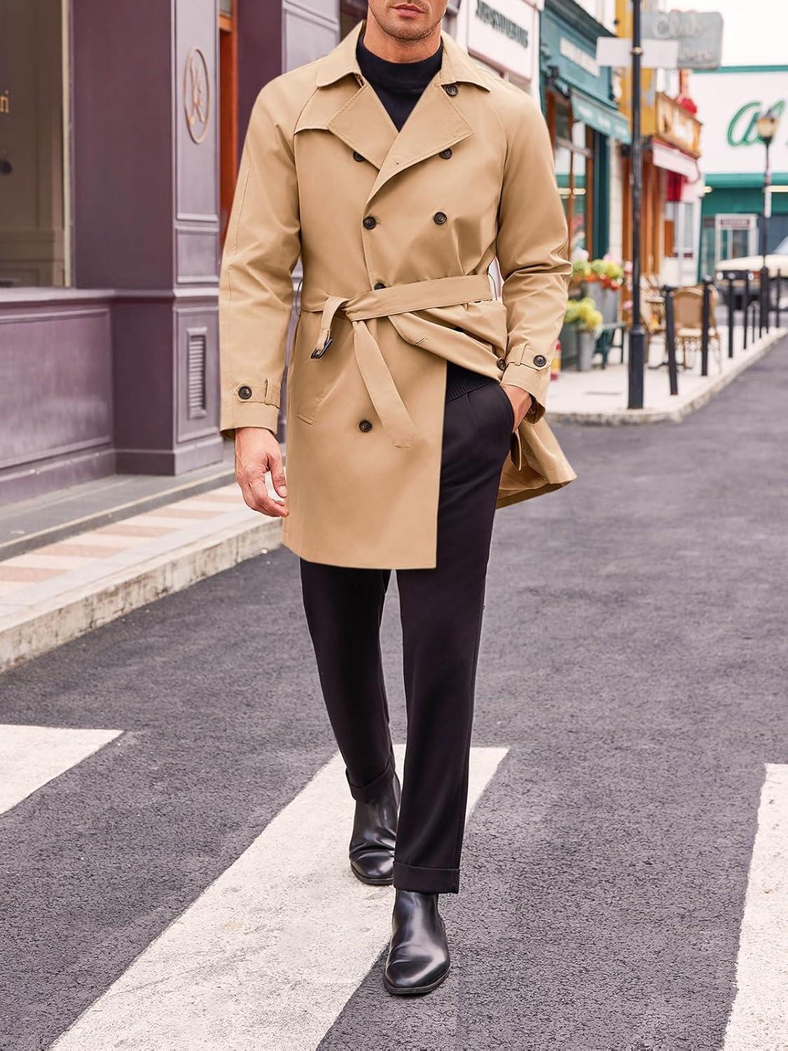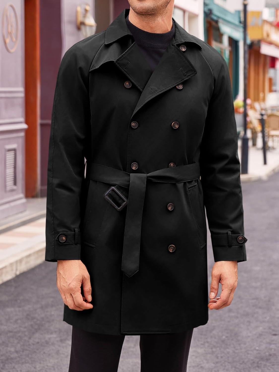 Runcati Mens Trench Coat Double Breasted Mid Long Jacket Casual Belted Overcoat Notched Lapel Windbreaker(Black)