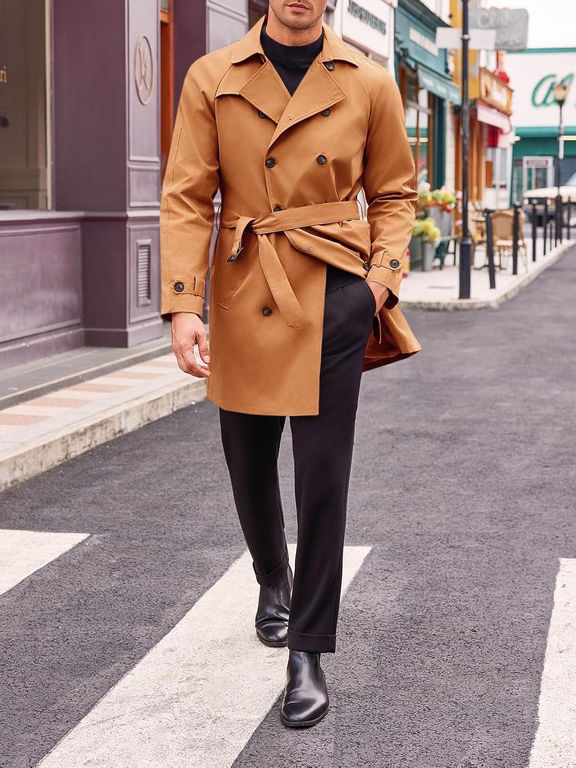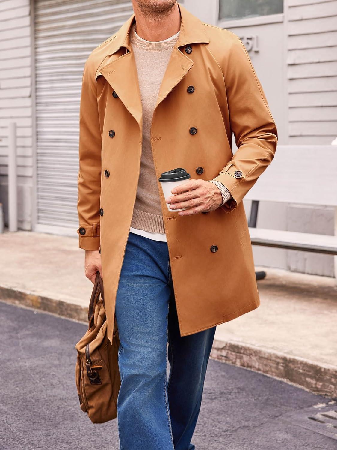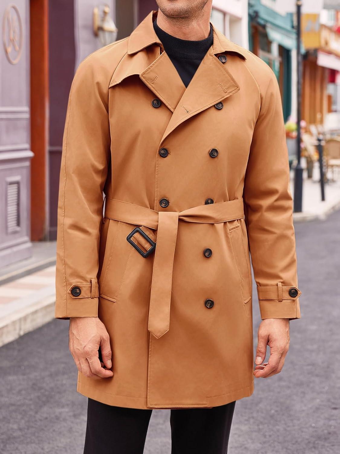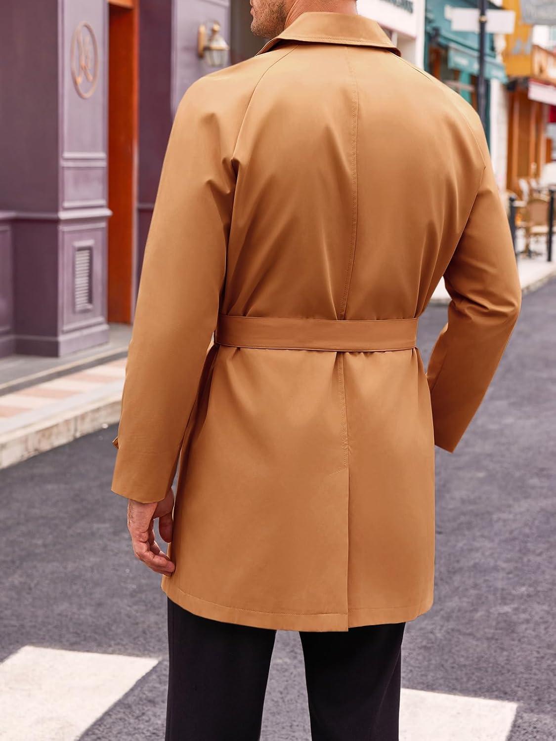 Runcati Mens Trench Coat Double Breasted Mid Long Jacket Casual Belted Overcoat Notched Lapel Windbreaker(Brown)