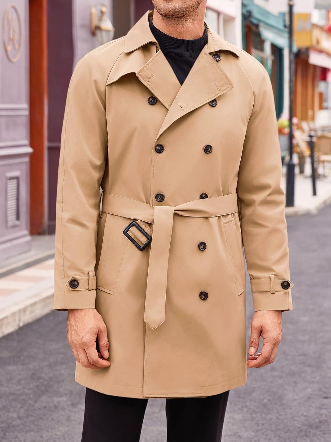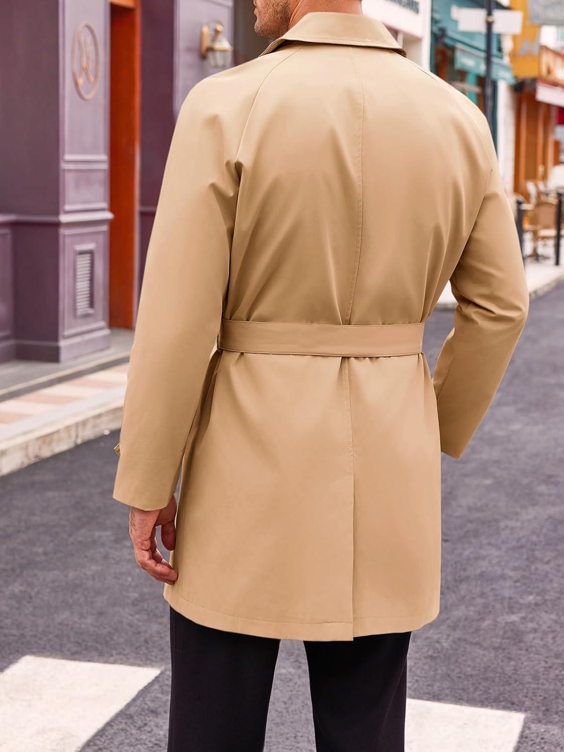 Runcati Mens Trench Coat Double Breasted Belted Windbreaker Jackets Lapel Lightweight Long Jacket Casual Overcoat(Khaki)