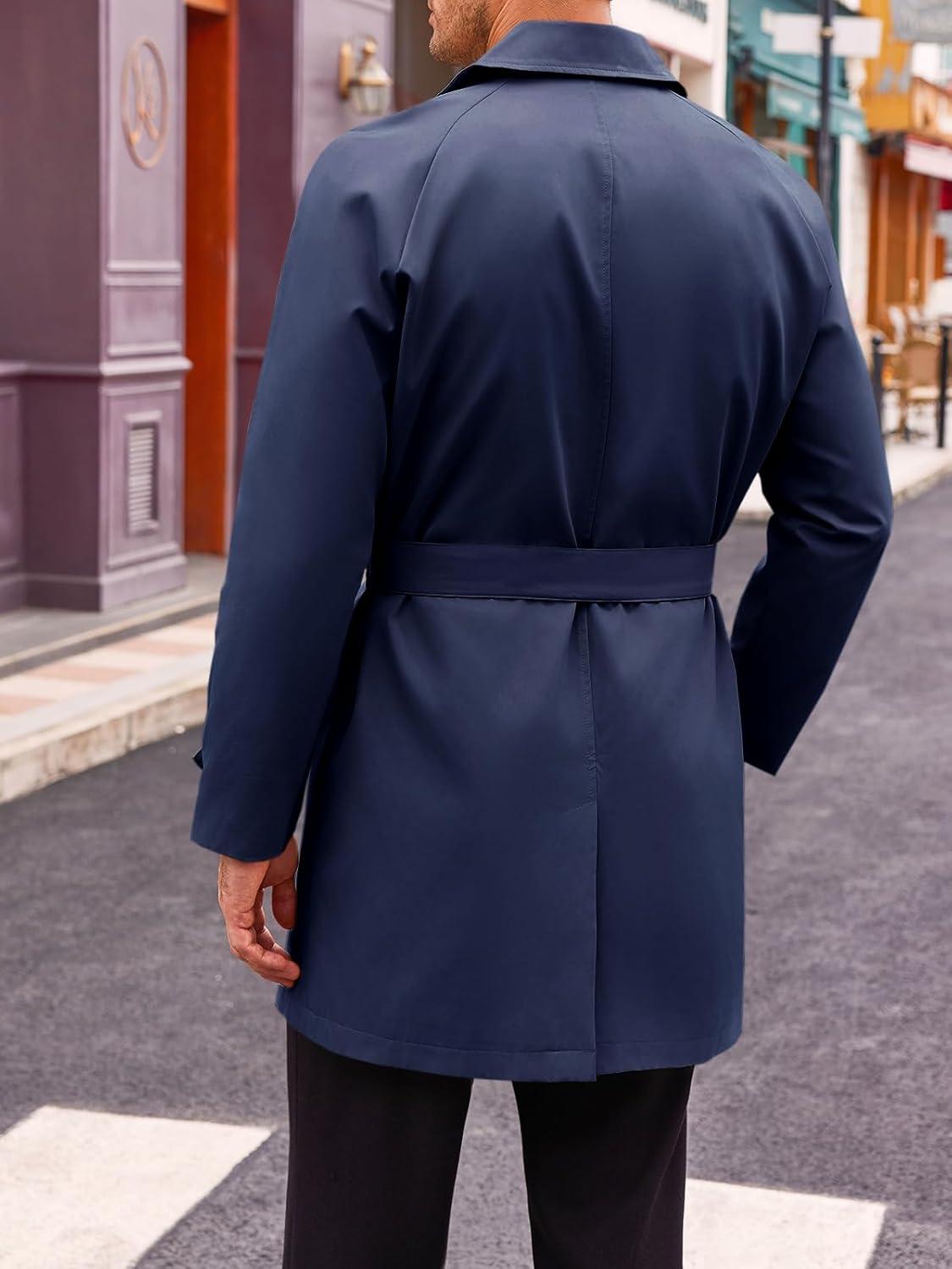 Runcati Mens Trench Coat Double Breasted Mid Long Jacket Casual Belted Overcoat Notched Lapel Windbreaker(Navy Blue)