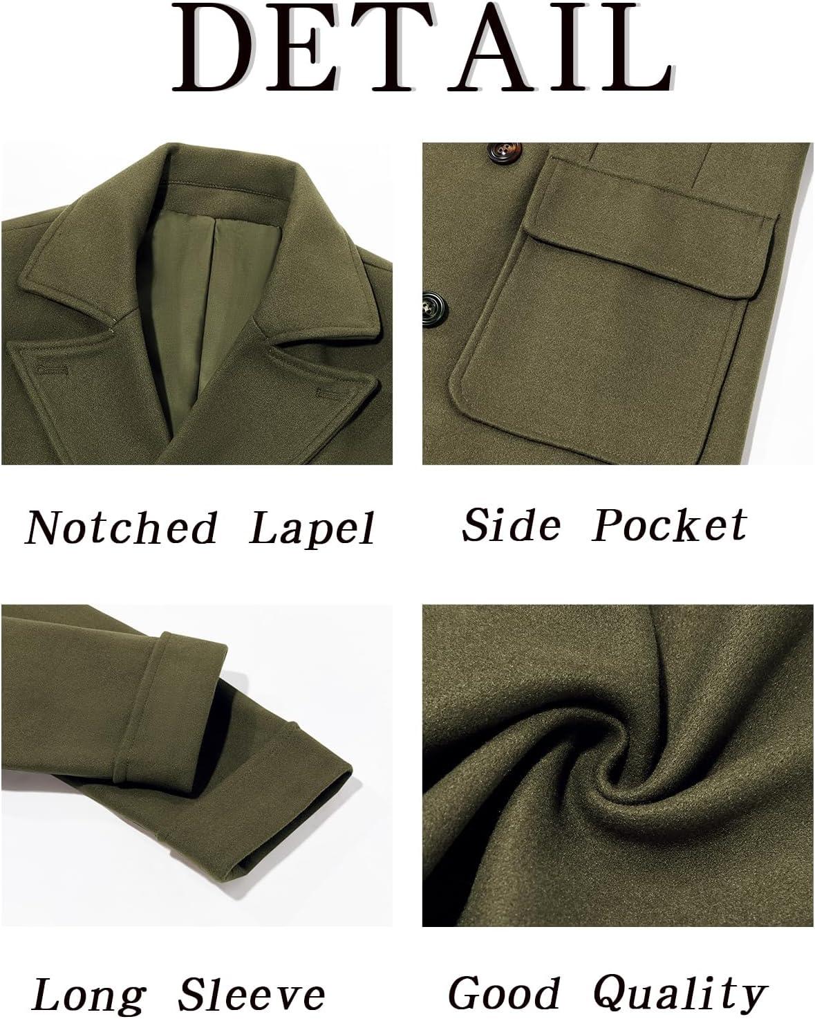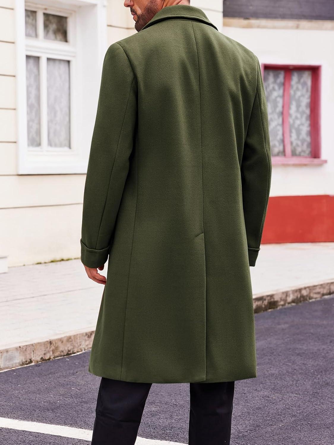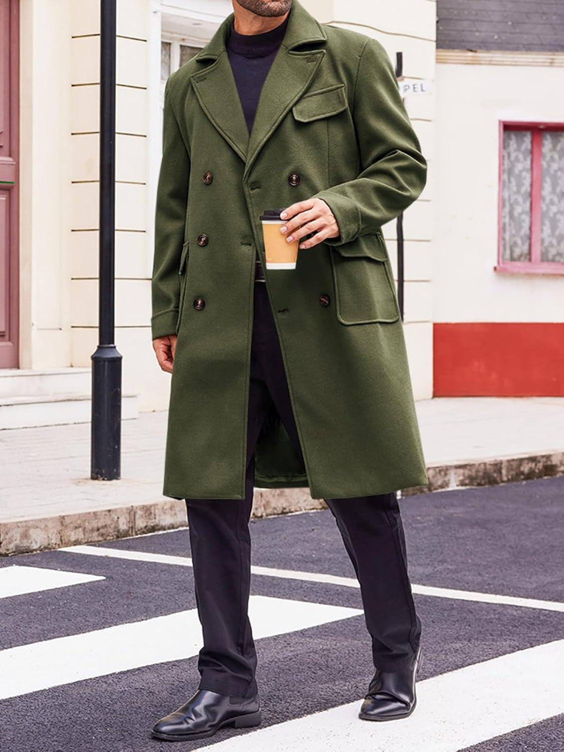 Runcati Mens Trench Coat Notch Lapel Double Breasted Peacoat Wool Blend Casual Long Overcoat(Army Green)