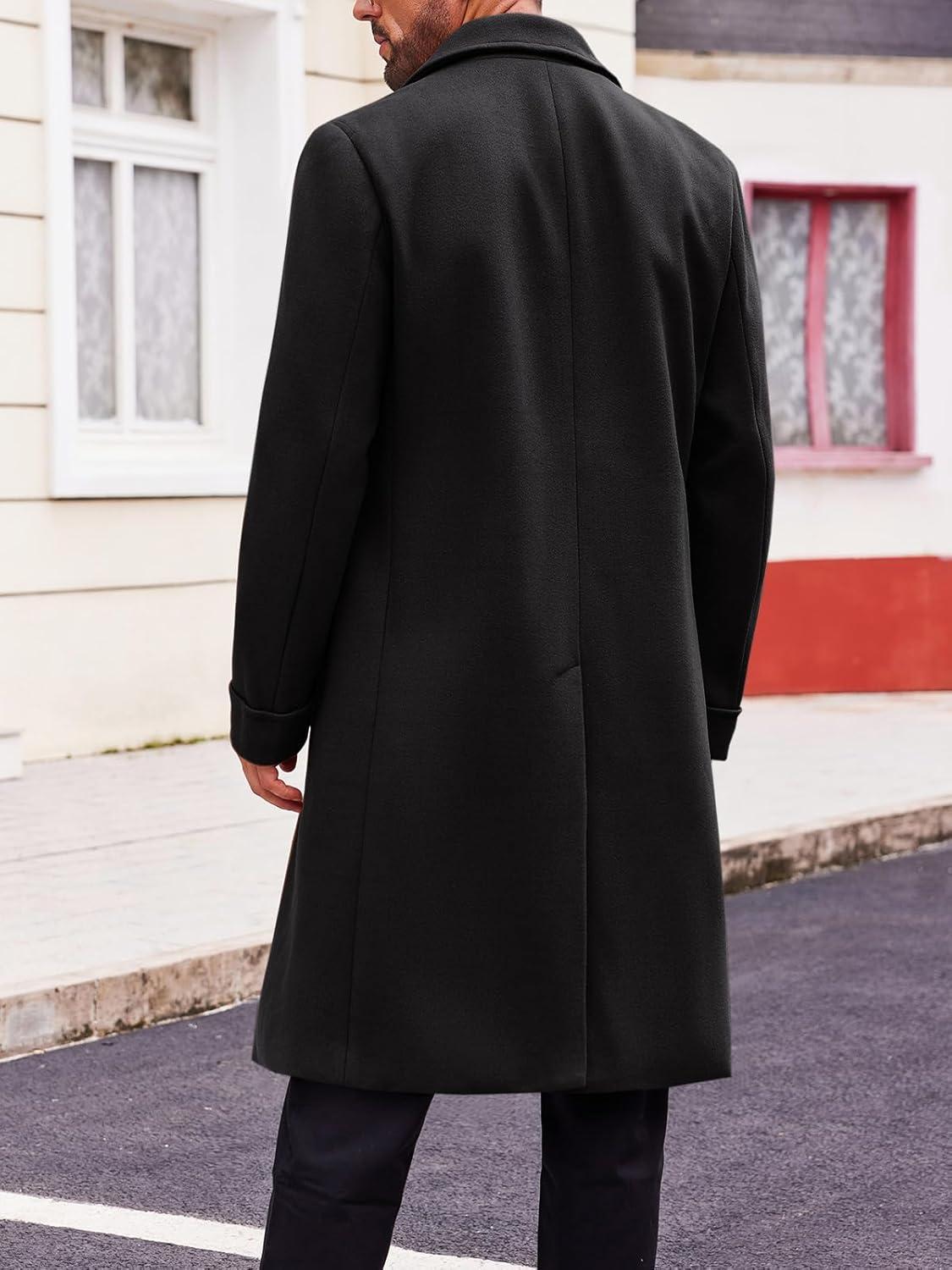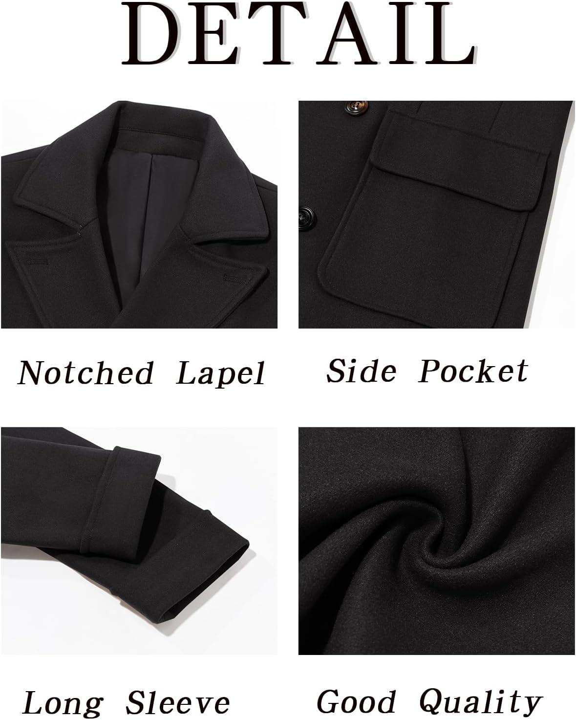 Runcati Mens Trench Coat Notch Lapel Double Breasted Peacoat Wool Blend Casual Long Overcoat(Black)