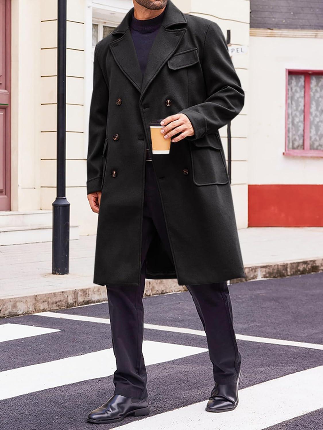 Runcati Mens Double Breasted Trench Coat Notch Lapel Peacoat Mid Long Winter Classic Overcoat(Black)