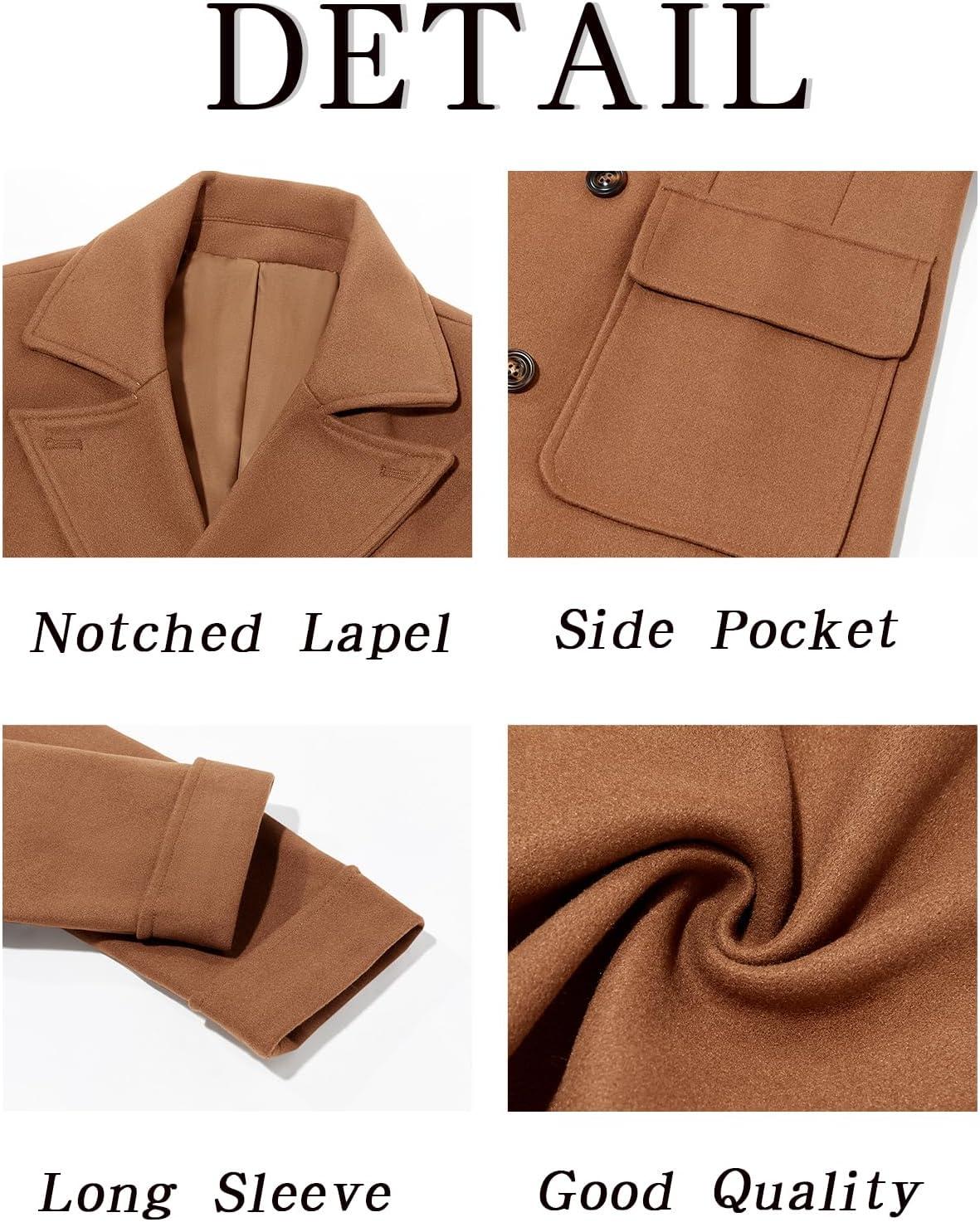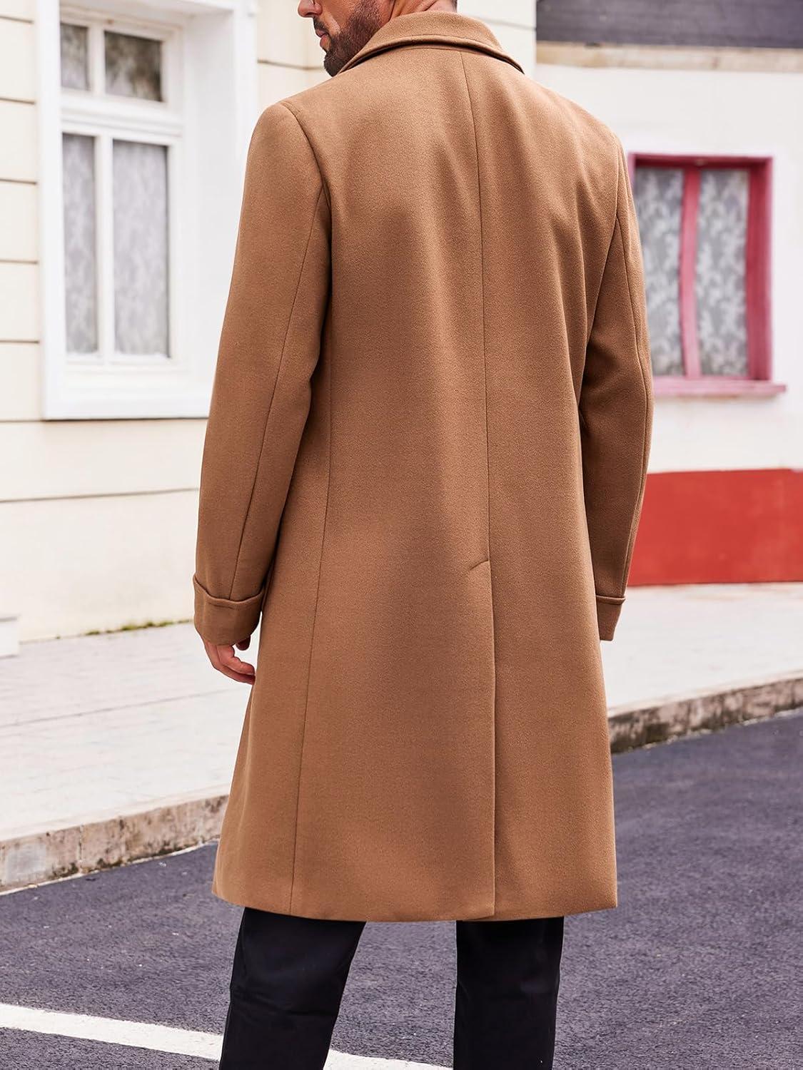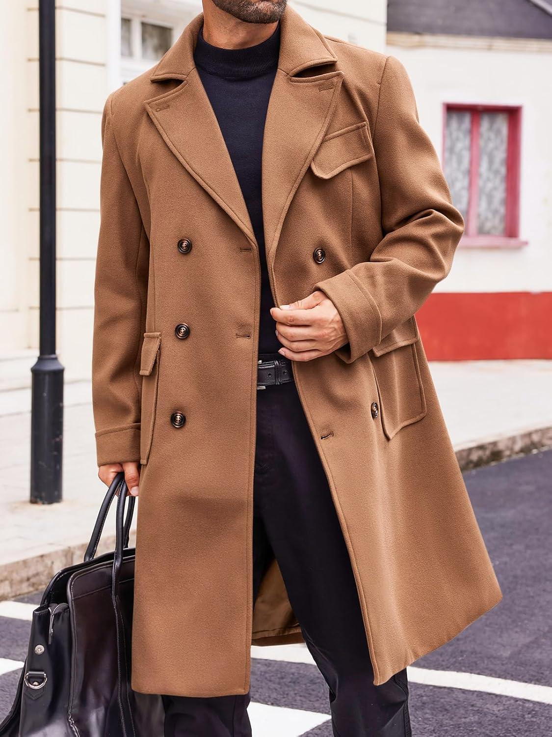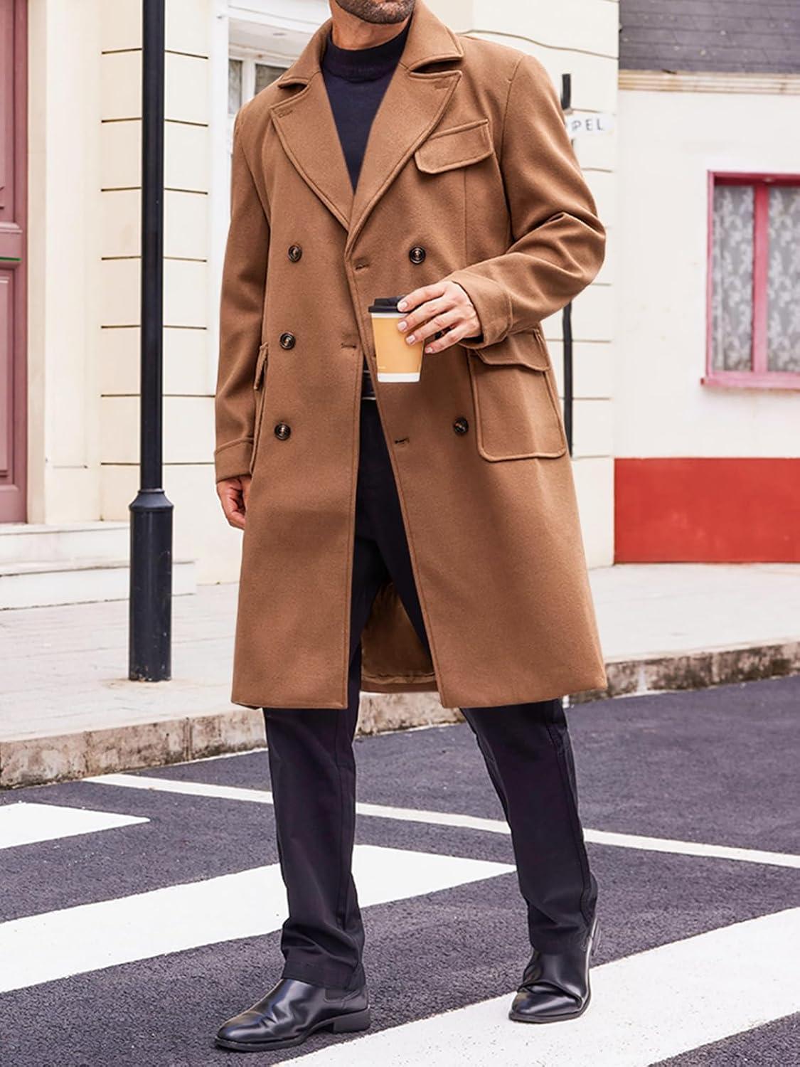 Runcati Mens Trench Coat Notch Lapel Double Breasted Peacoat Wool Blend Casual Long Overcoat(Brown)